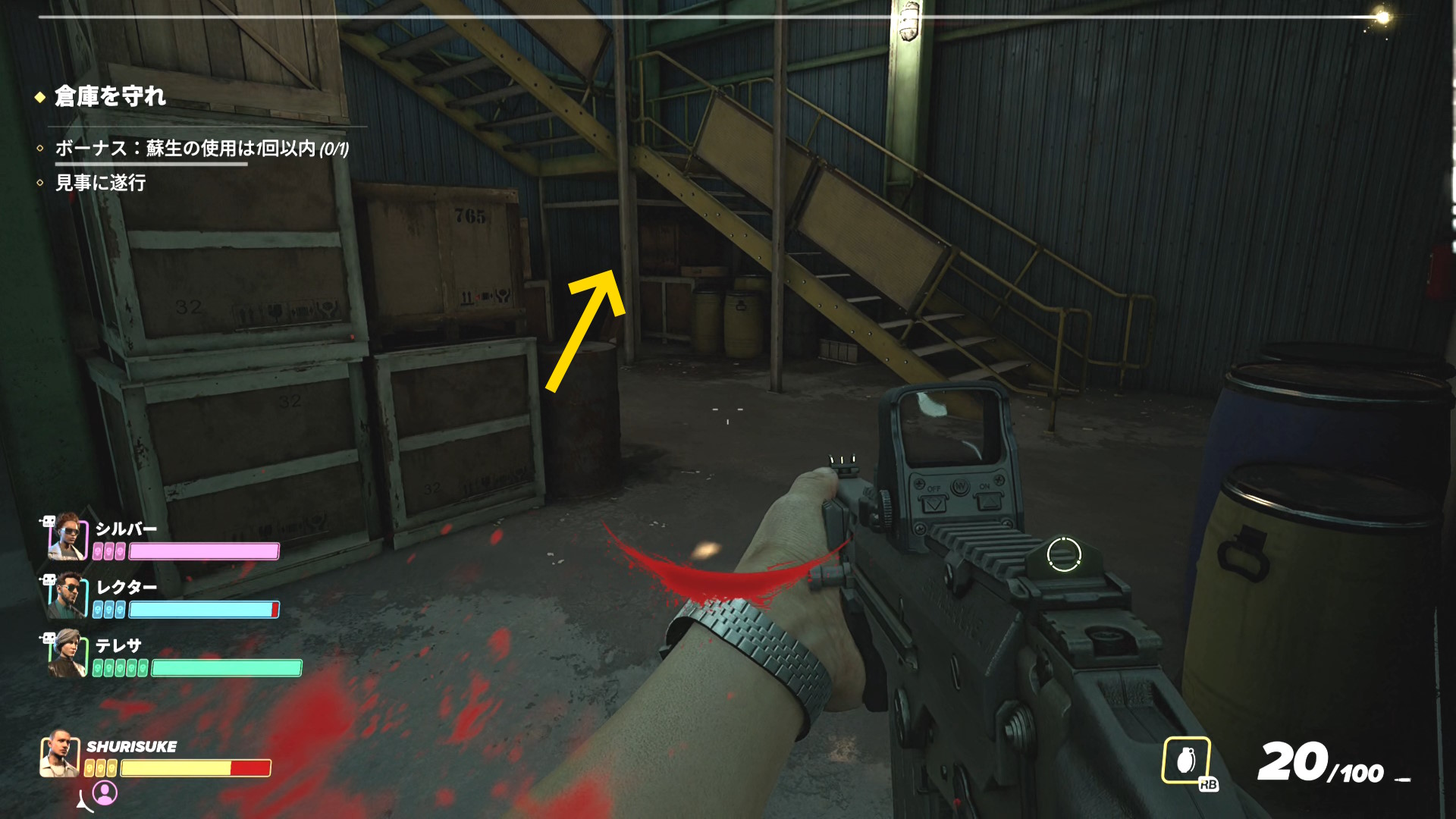 • 弾薬が足りなくなったらキルした死体のところで回収し、階段下に戻る