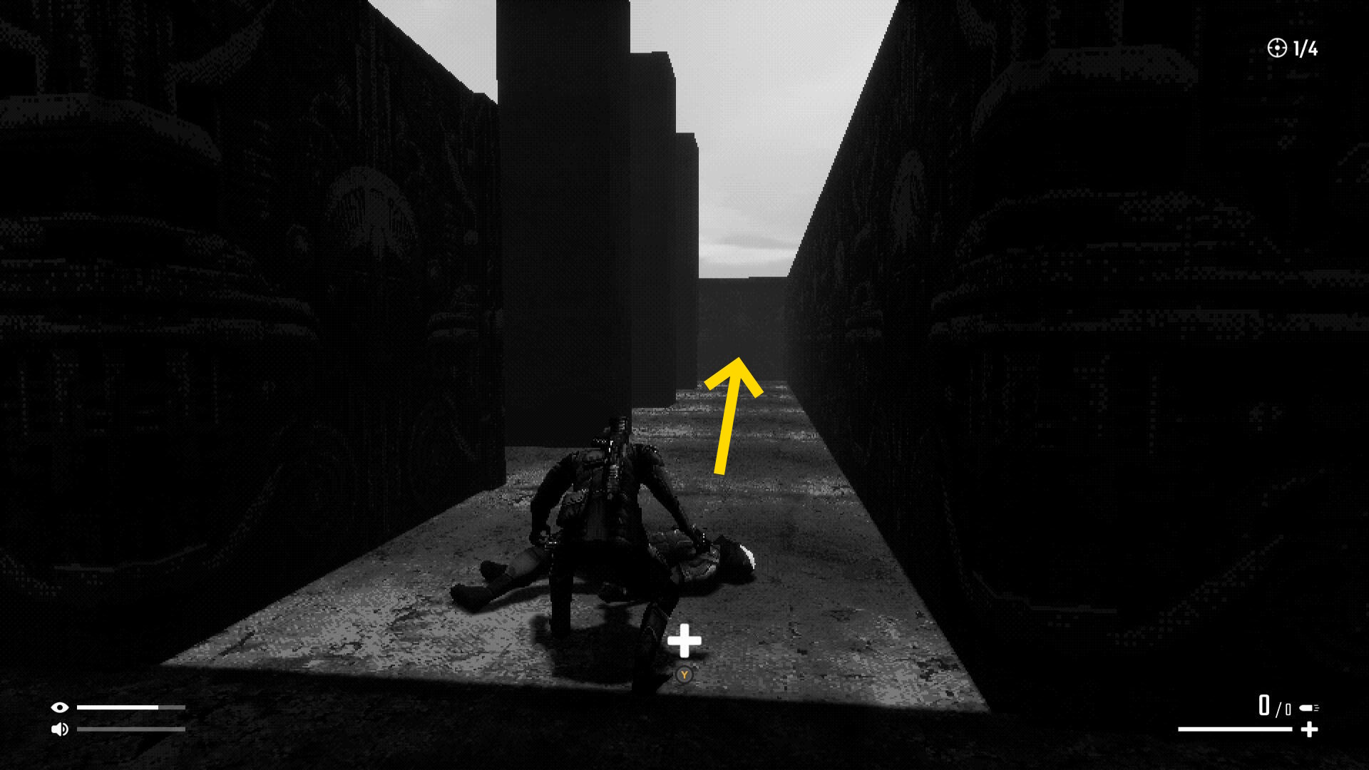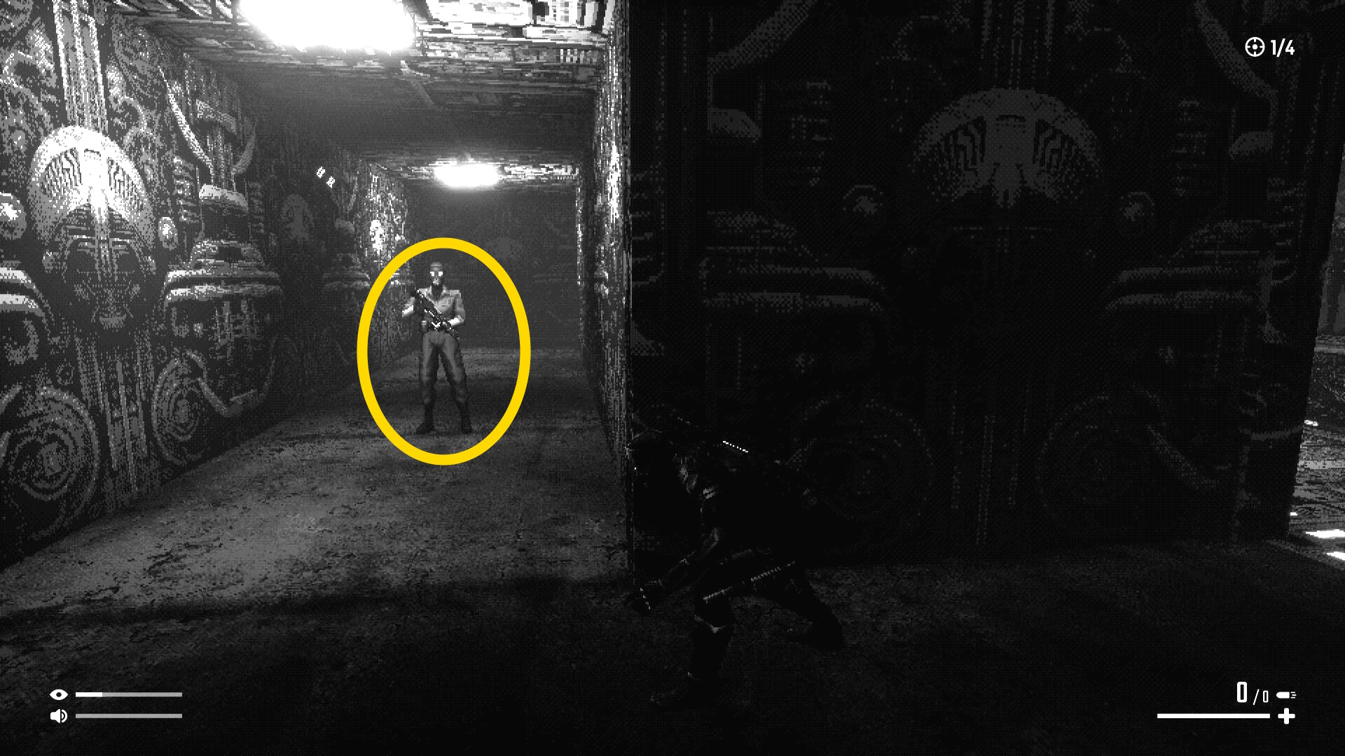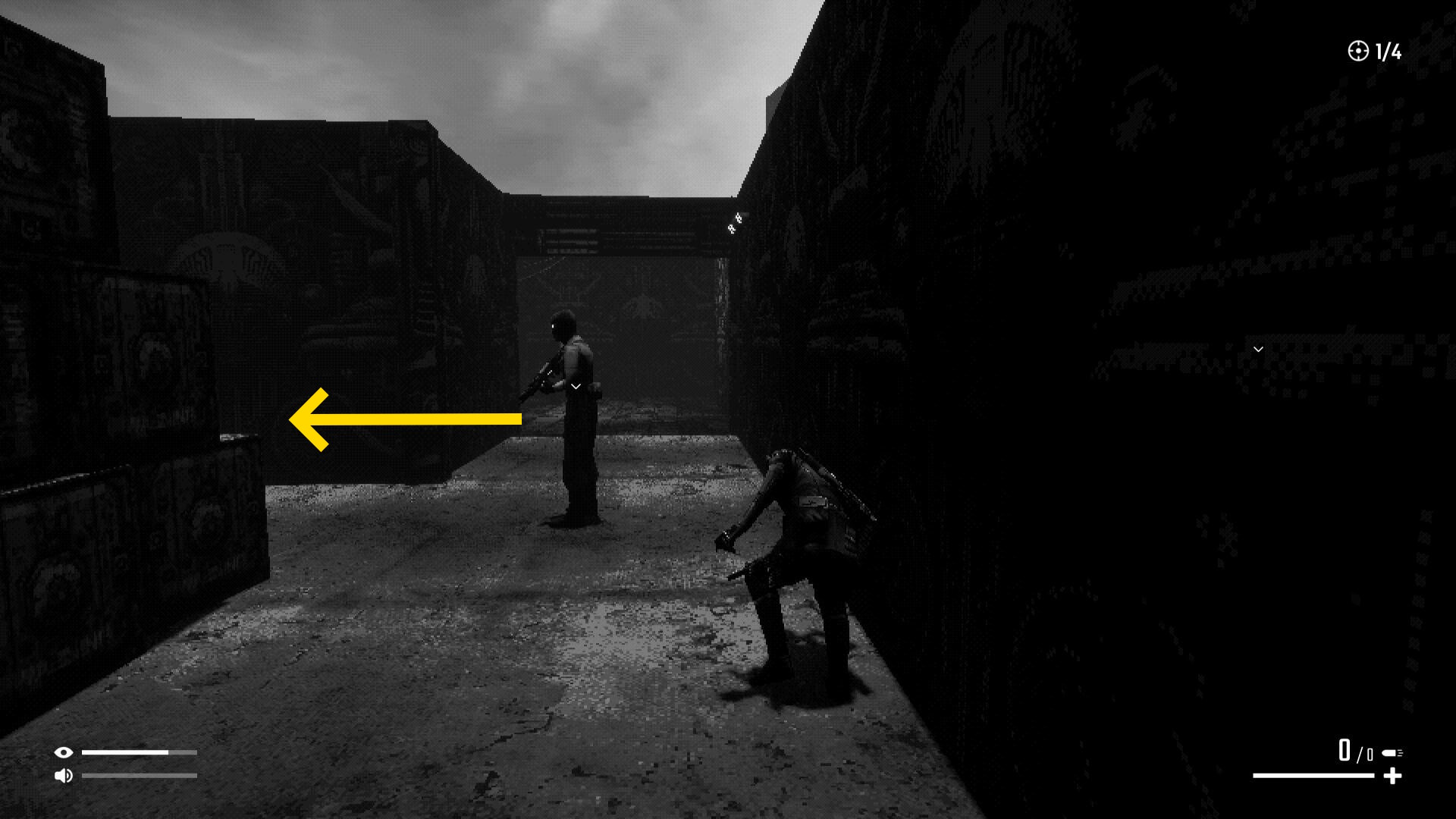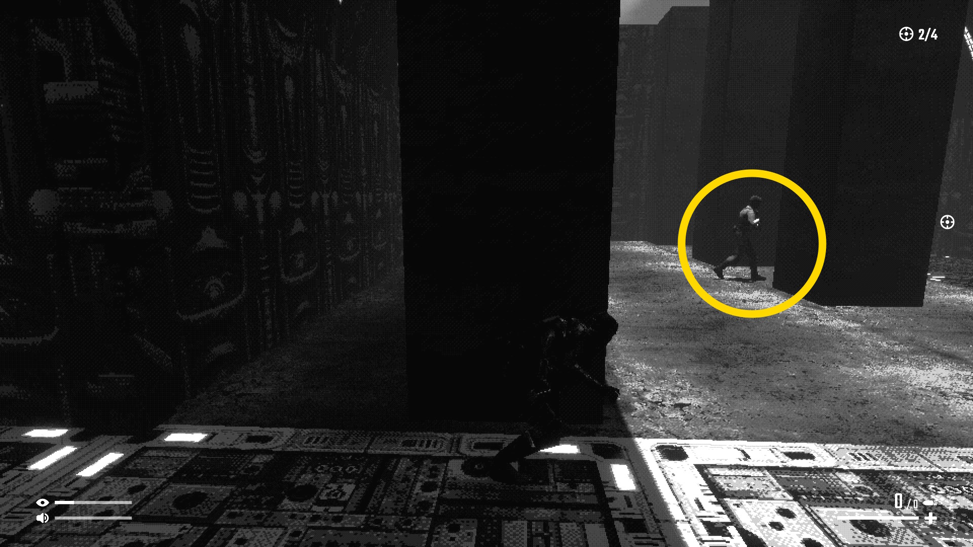 • 壁のところから敵の様子を伺い、彼が左に移動したら追いかける(彼の背後にある監視カメラに注意)
