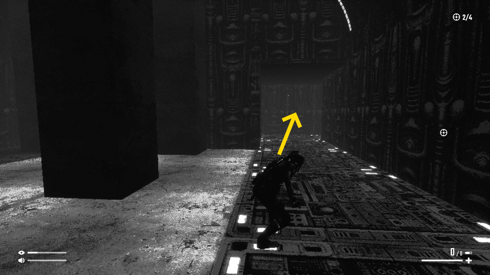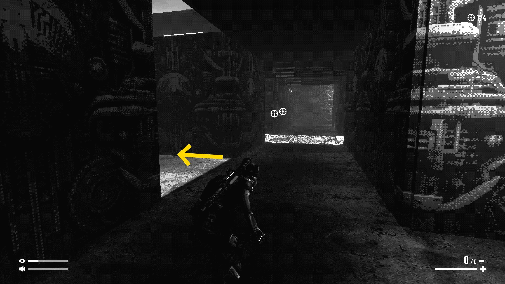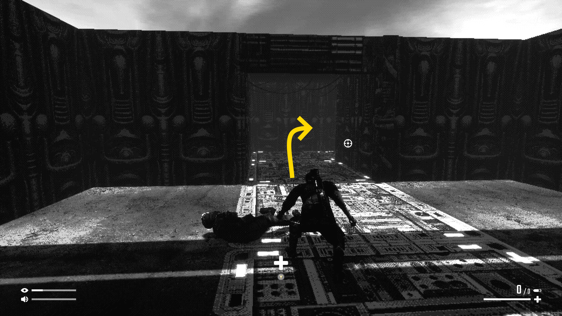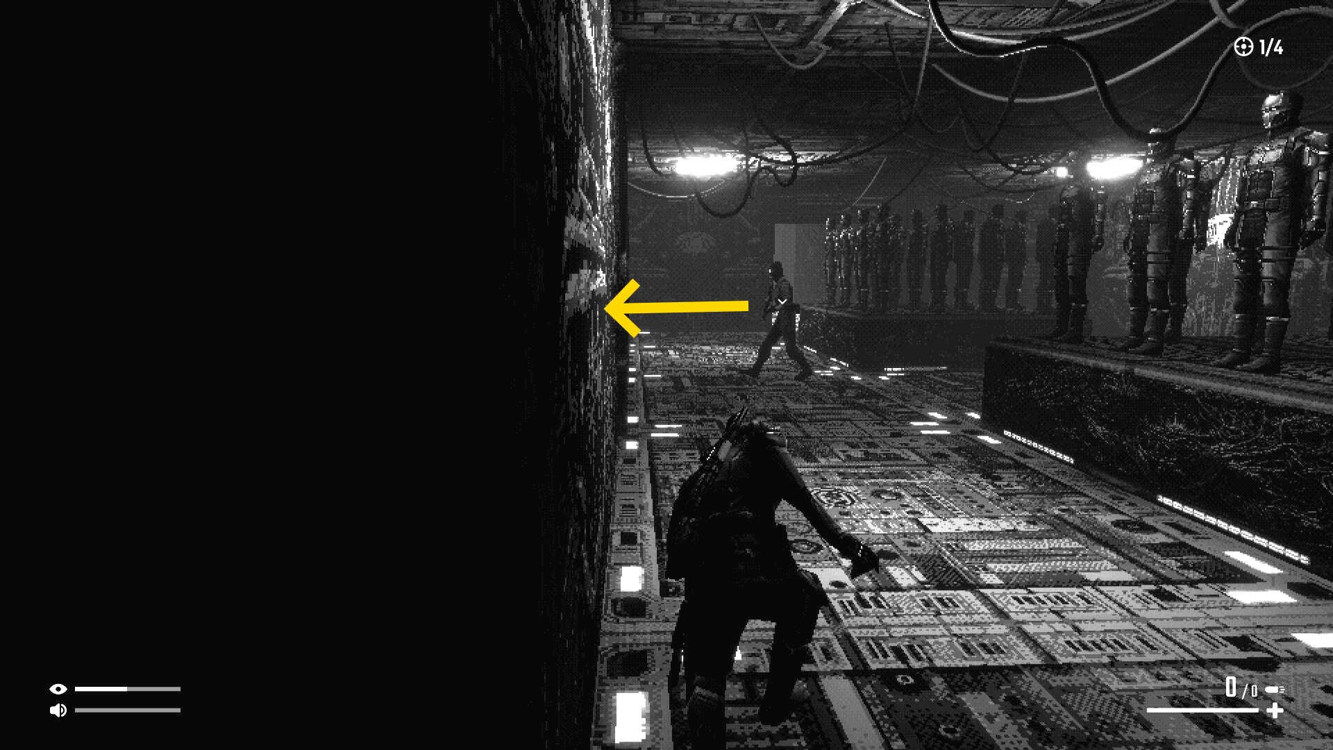 • 壁のところから敵の様子を伺い、彼が左に移動したら追いかける(彼の背後にある監視カメラに注意)