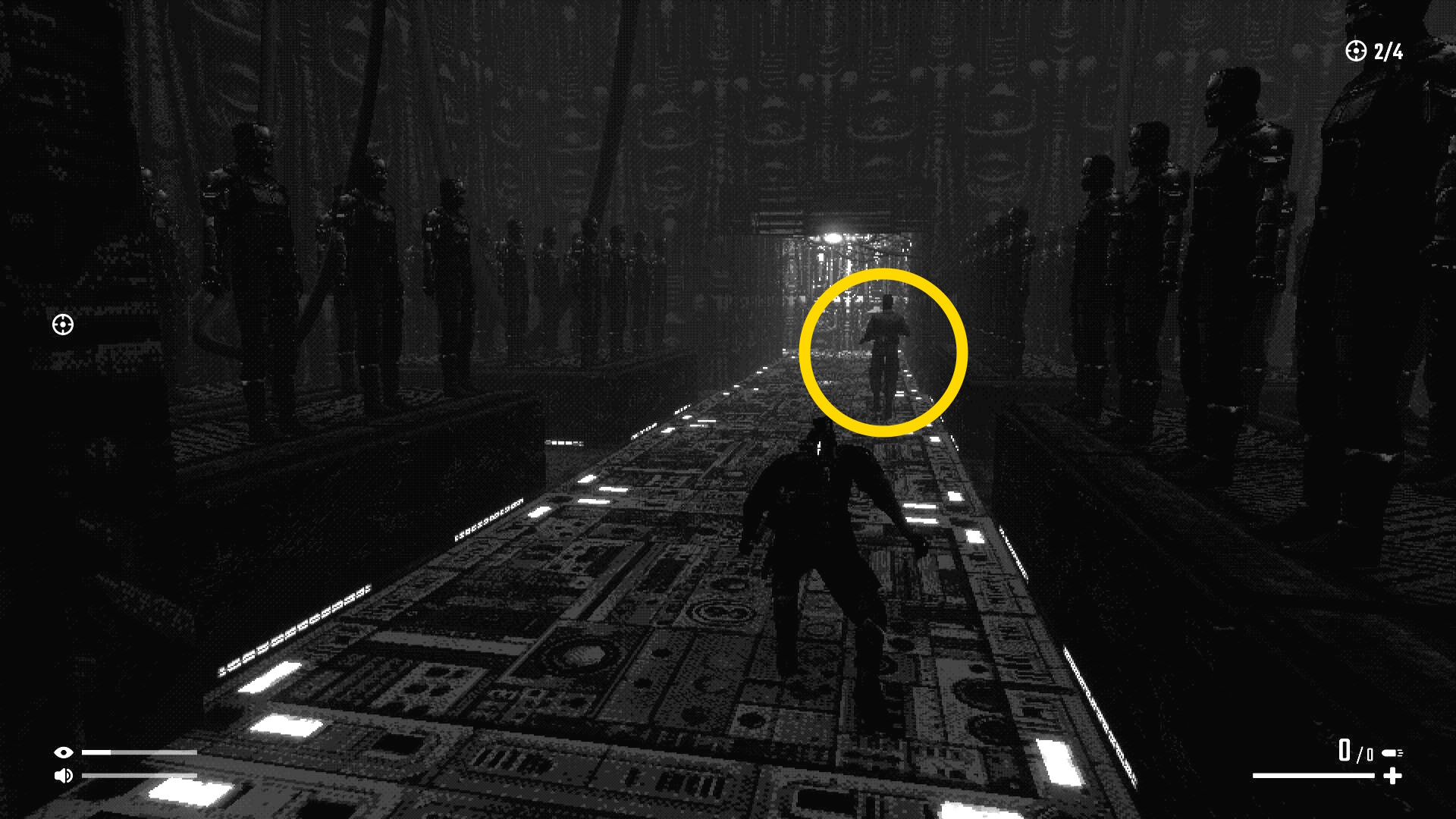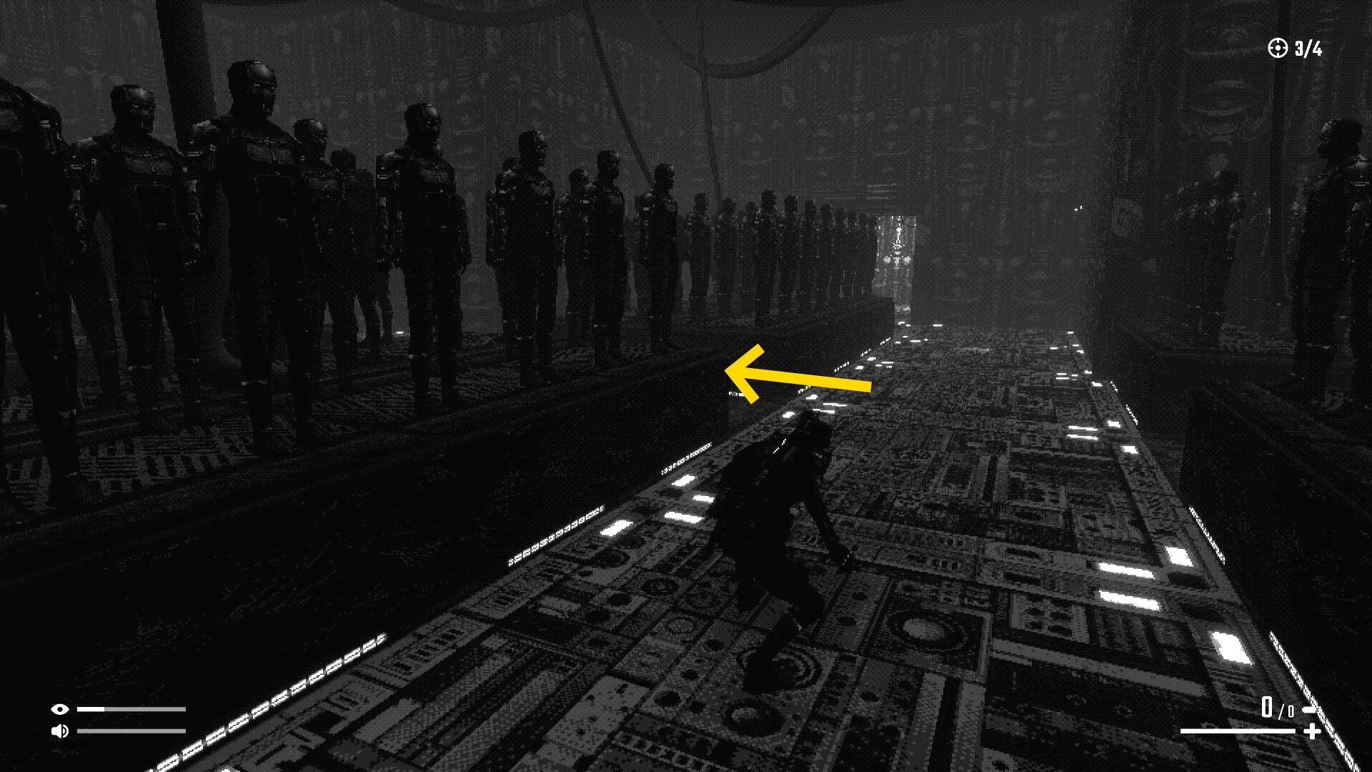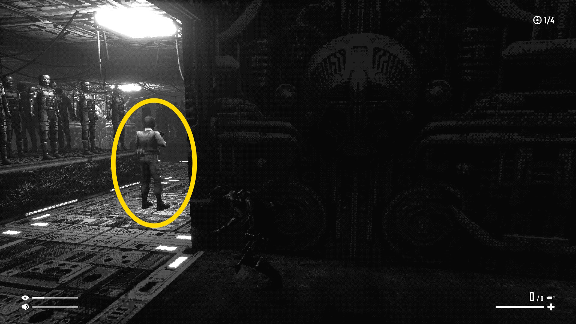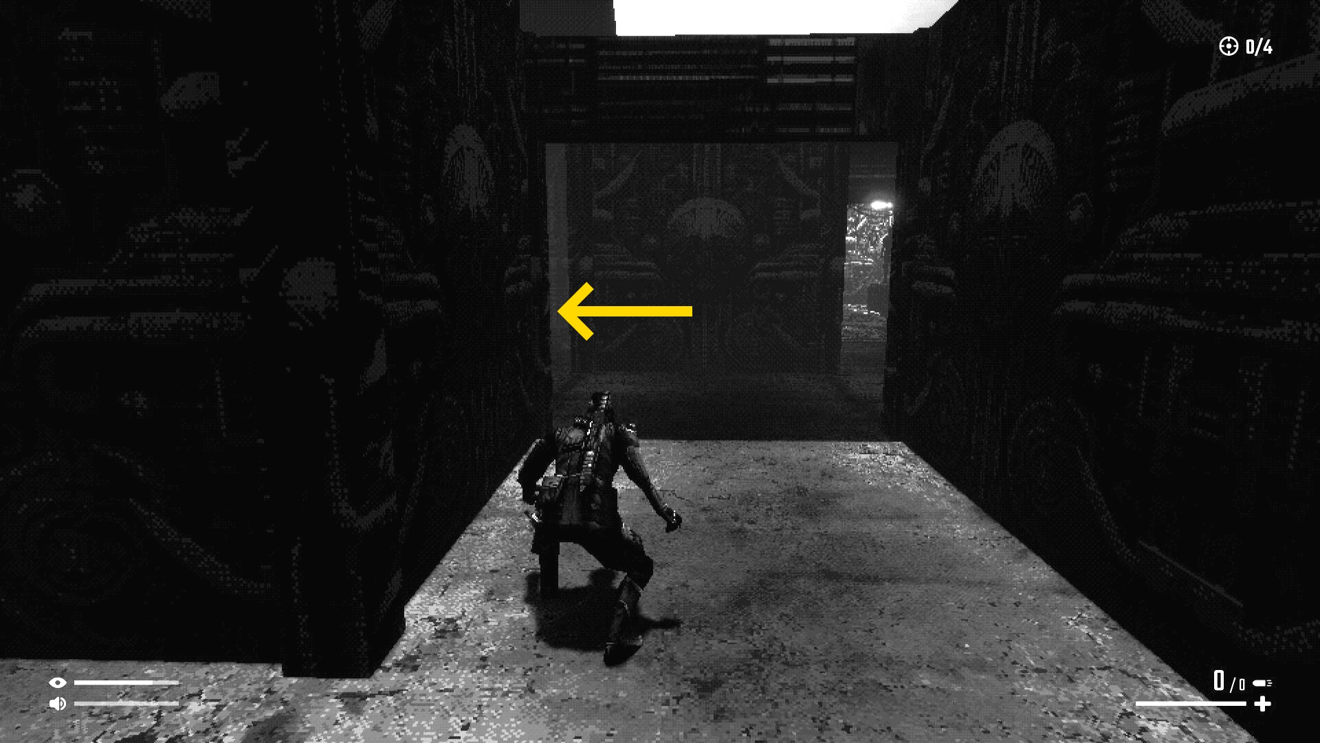 • 壁のところから敵の様子を伺い、彼が左に移動したら追いかける(彼の背後にある監視カメラに注意)