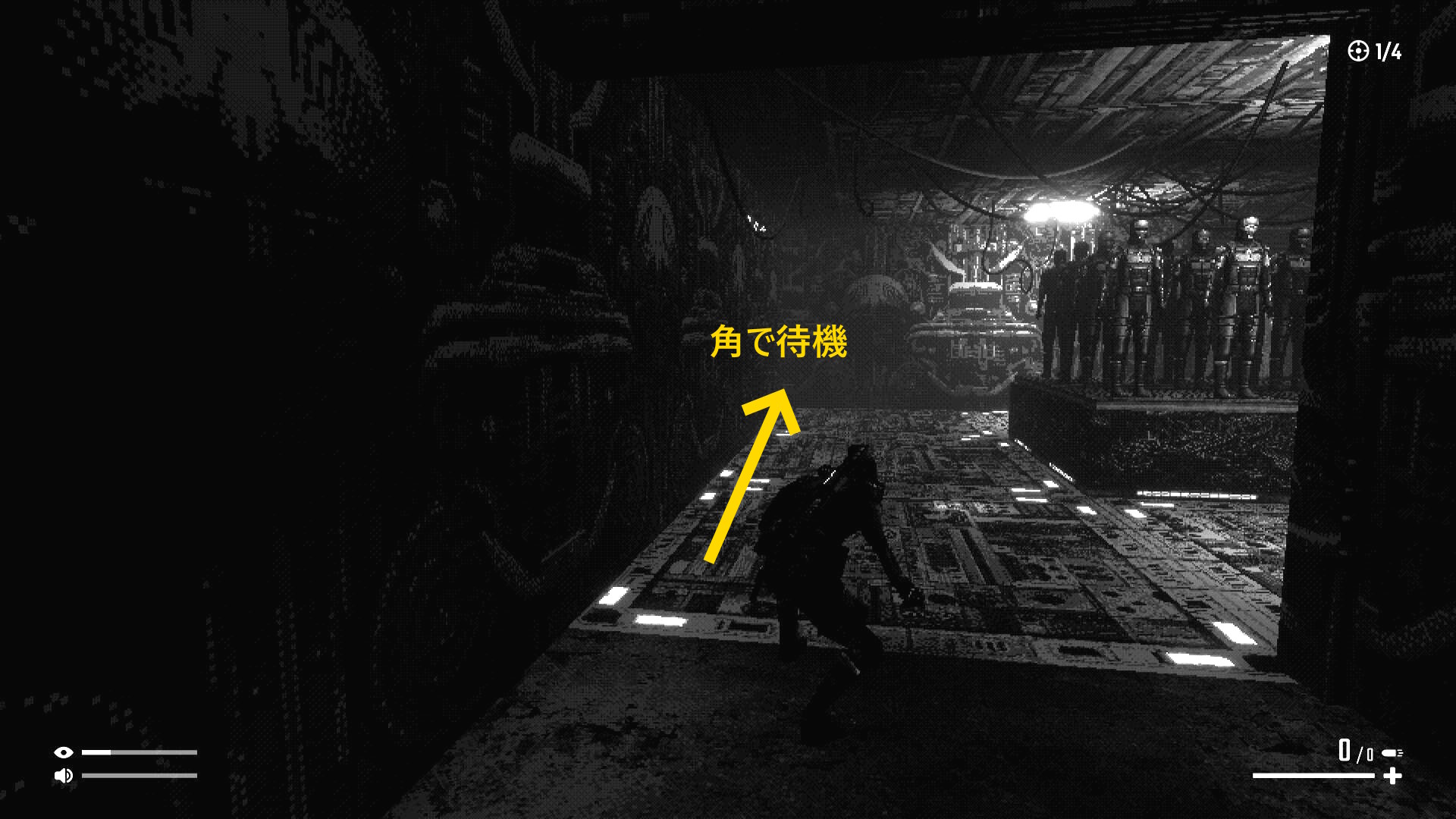 • 場合によってはこの奥にいるアーマーに見つかることもあるので、そのときは運が悪かったと諦める(リスタート)