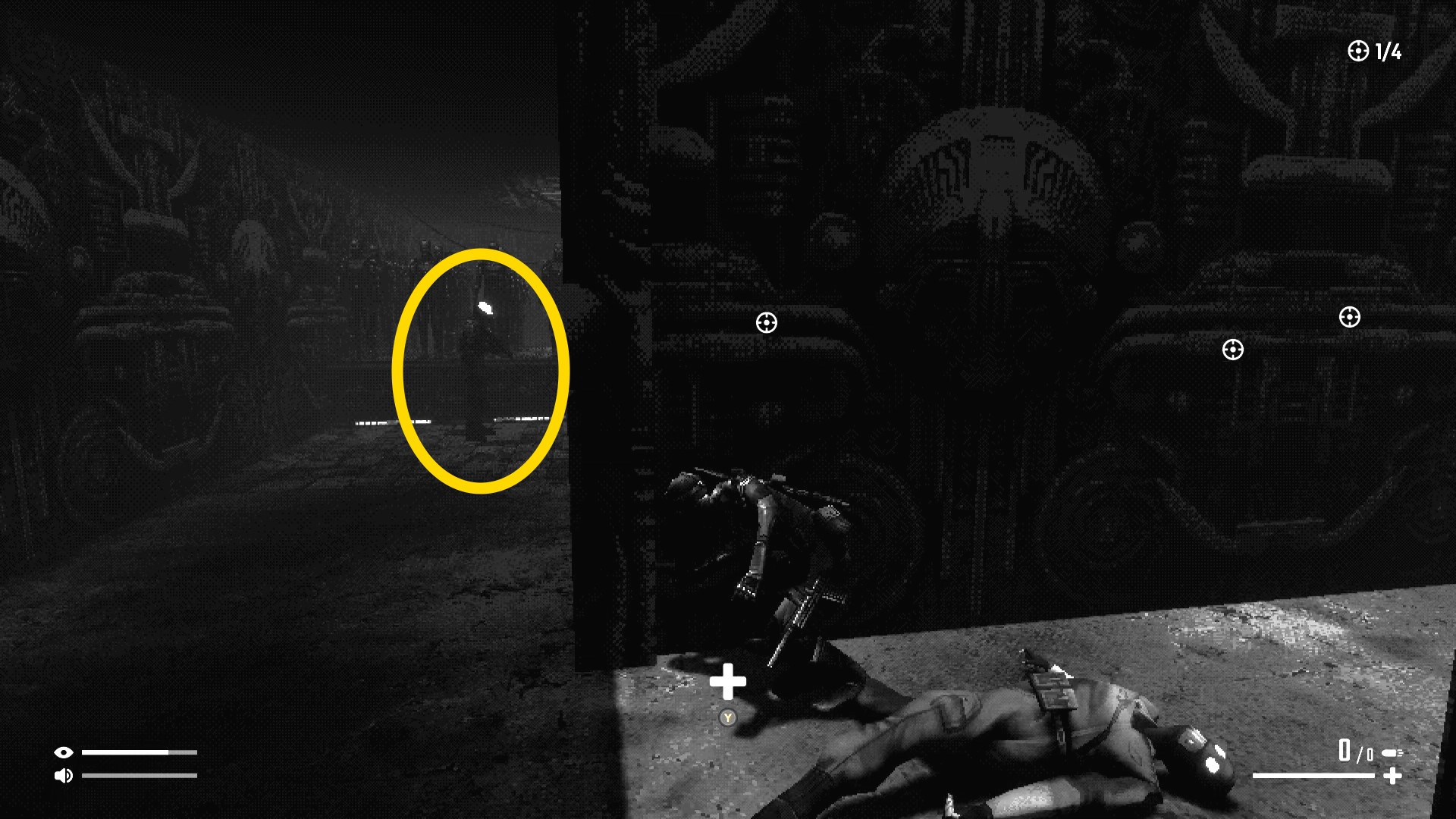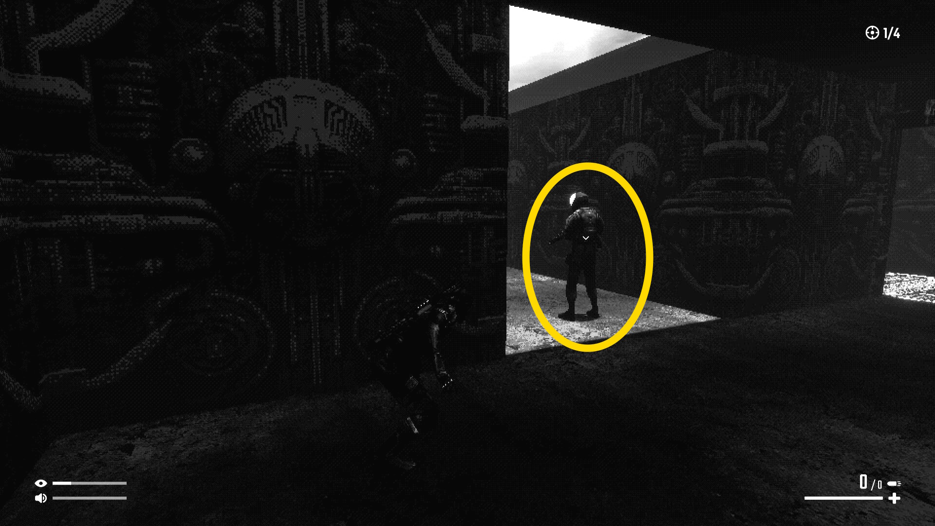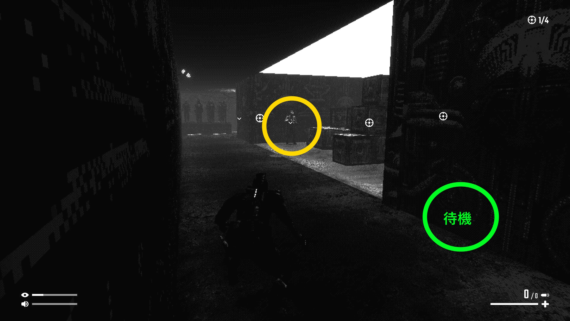 • 敵が1人巡回しており、左奥に ターゲット(1/4)