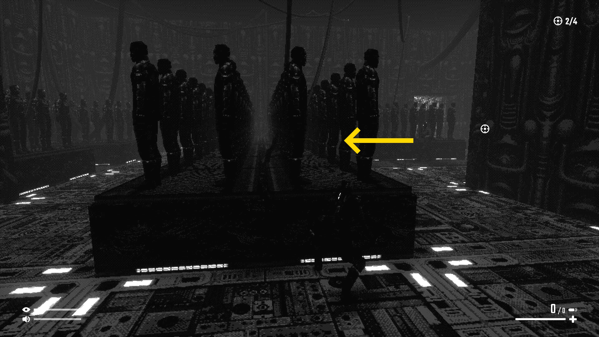 • 後ろに戻る(主人公のコピーが立っている台のところで待機)