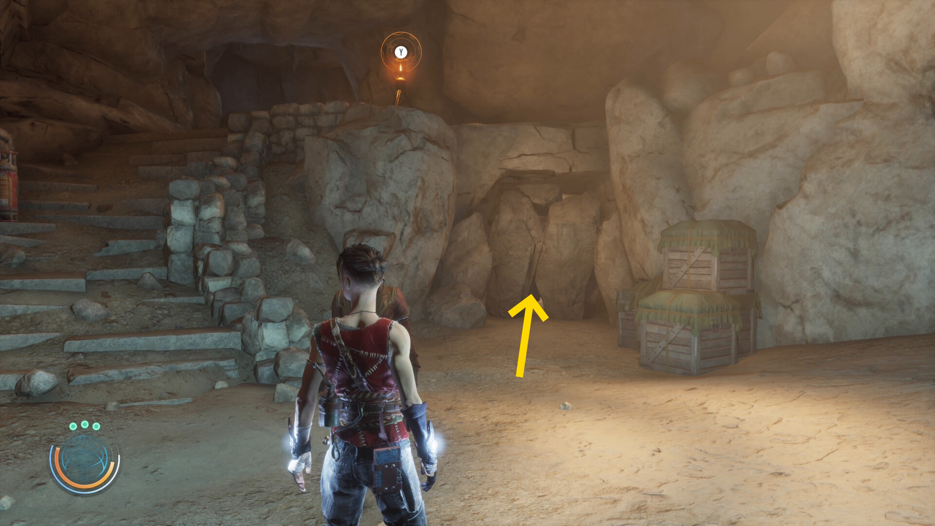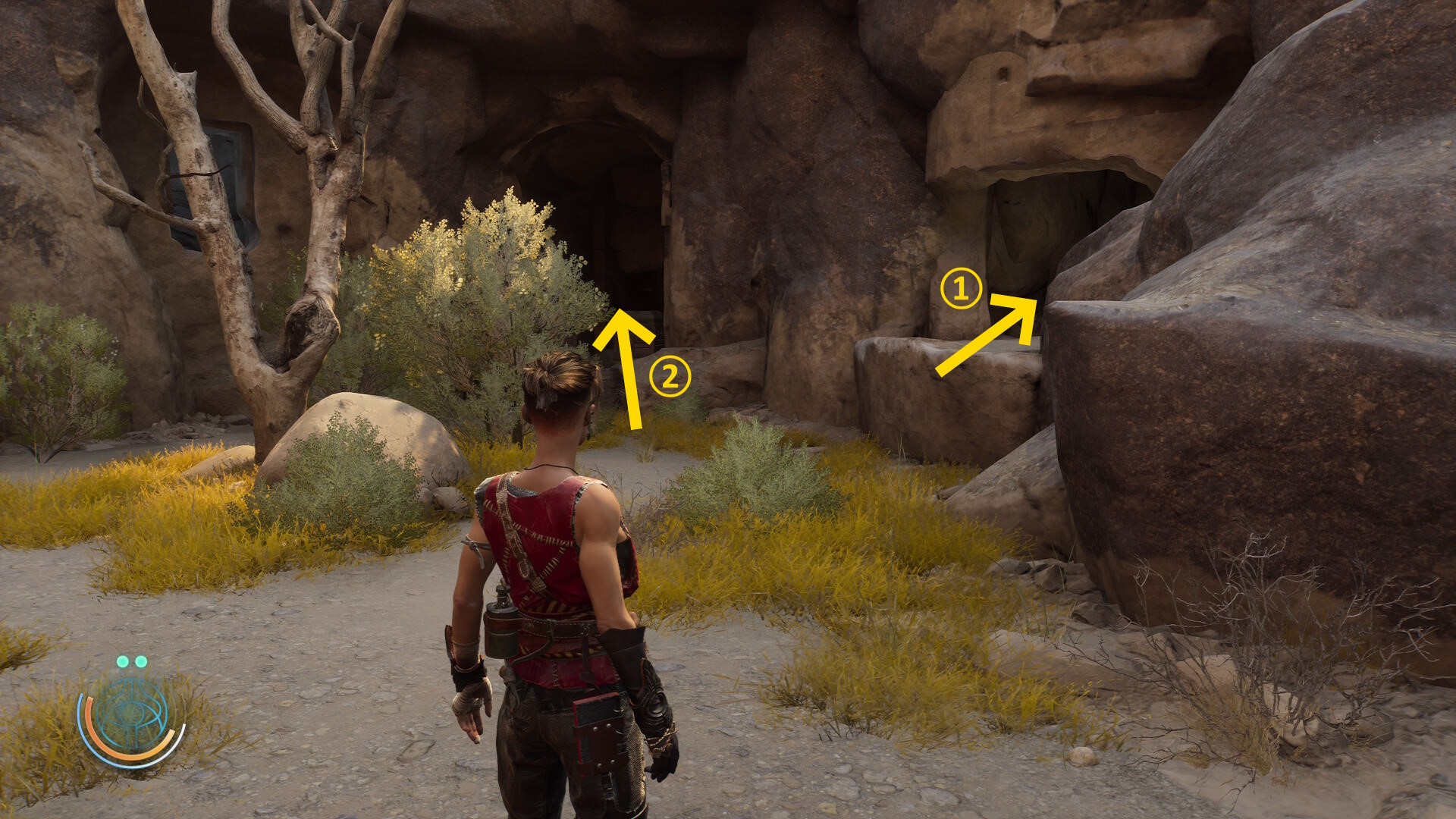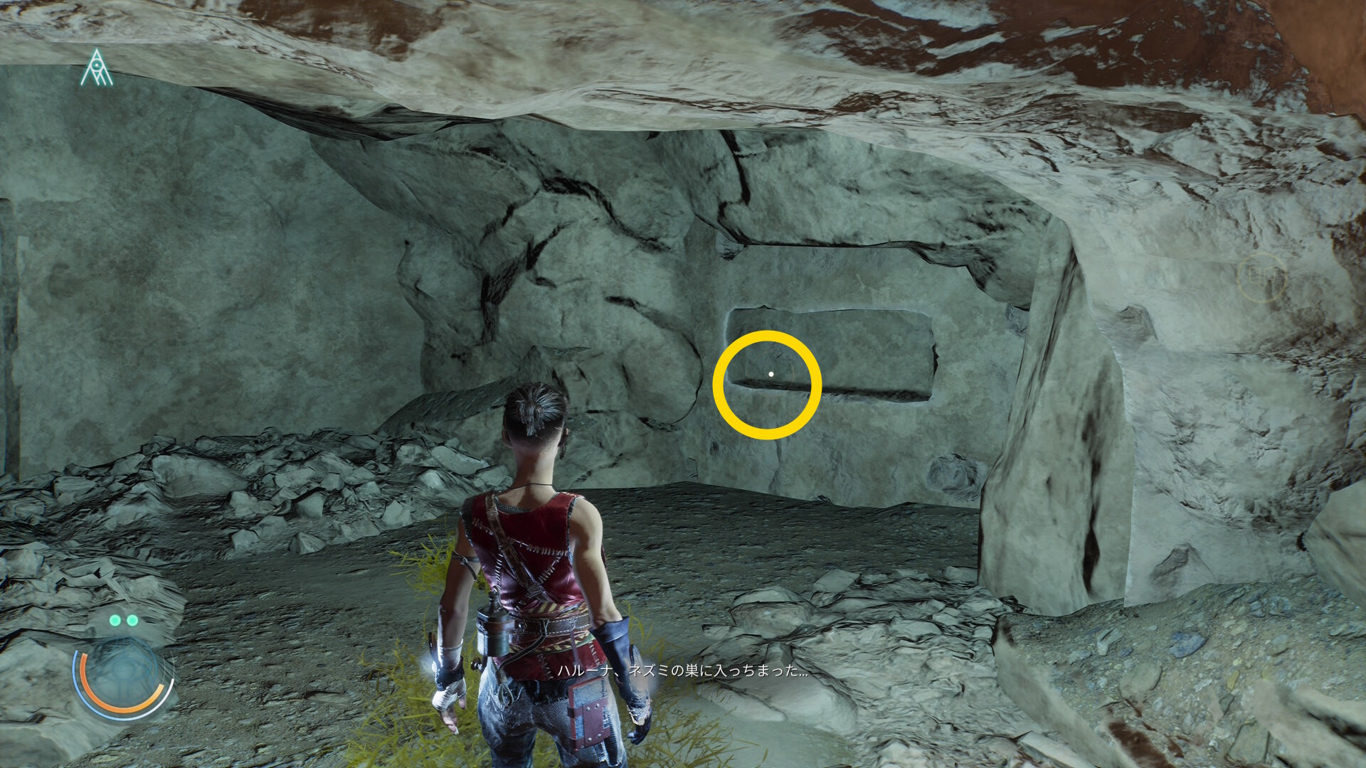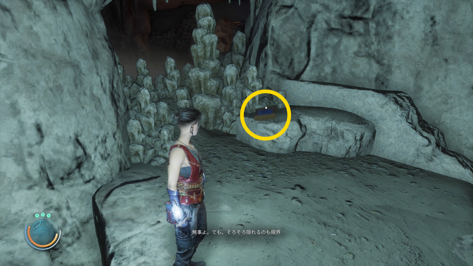 • 右に洞穴(下画像①)、右前方に木箱が置かれた凹み(下画像②)がある