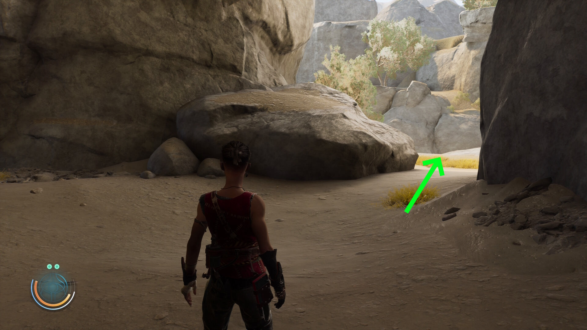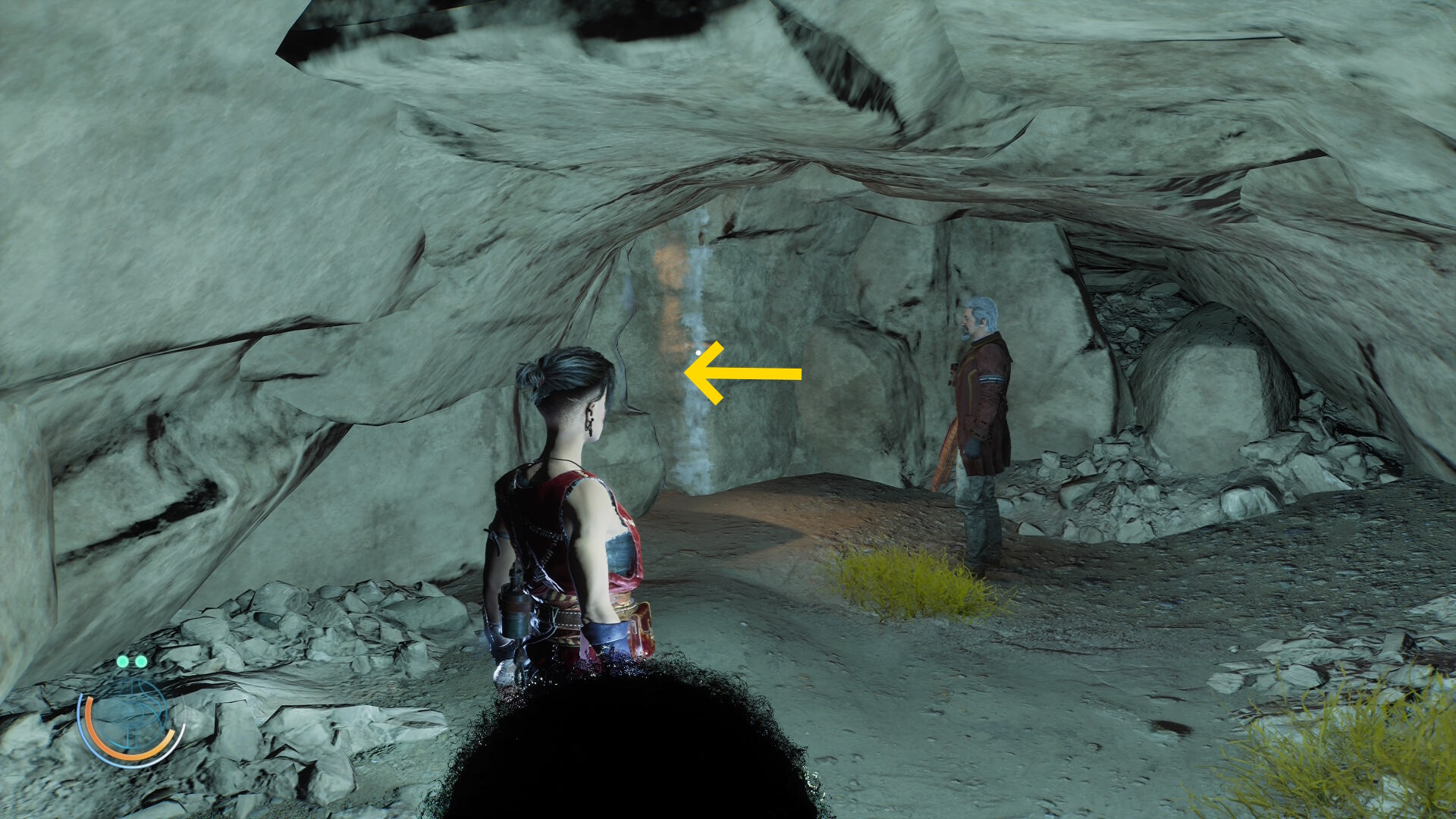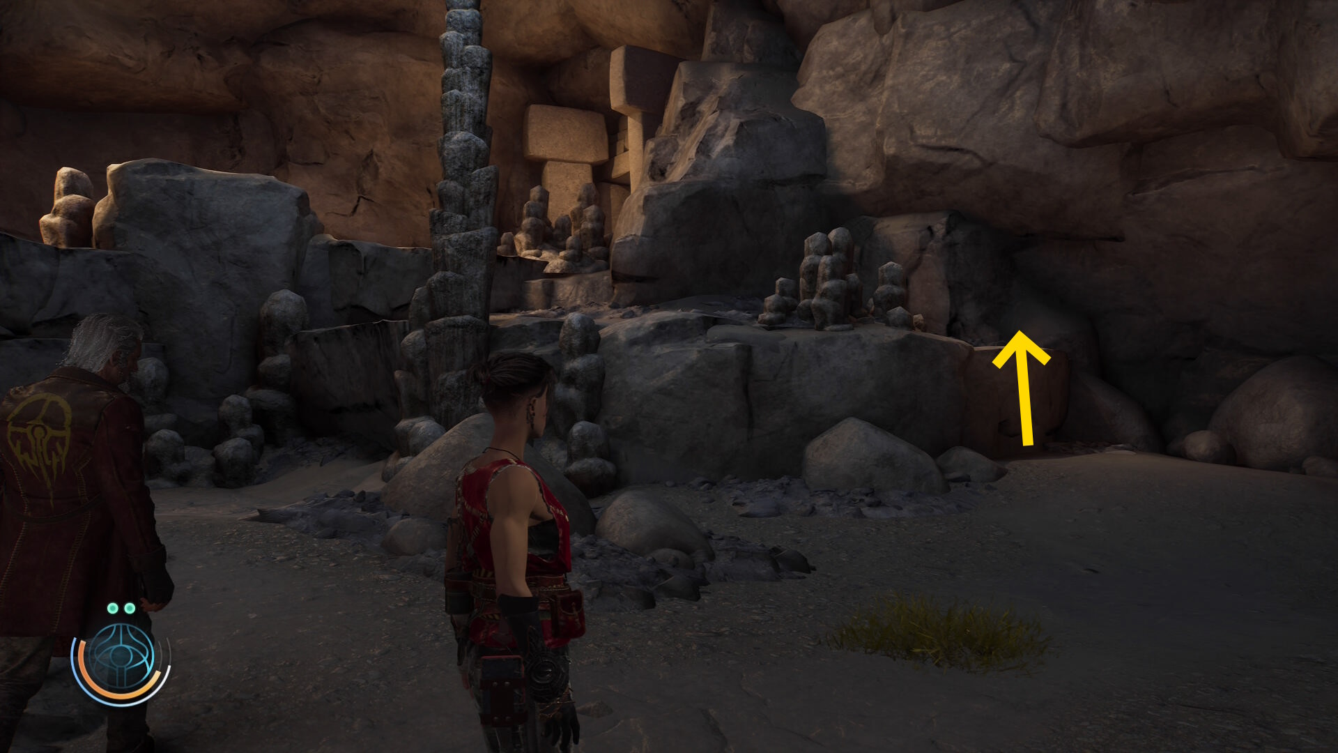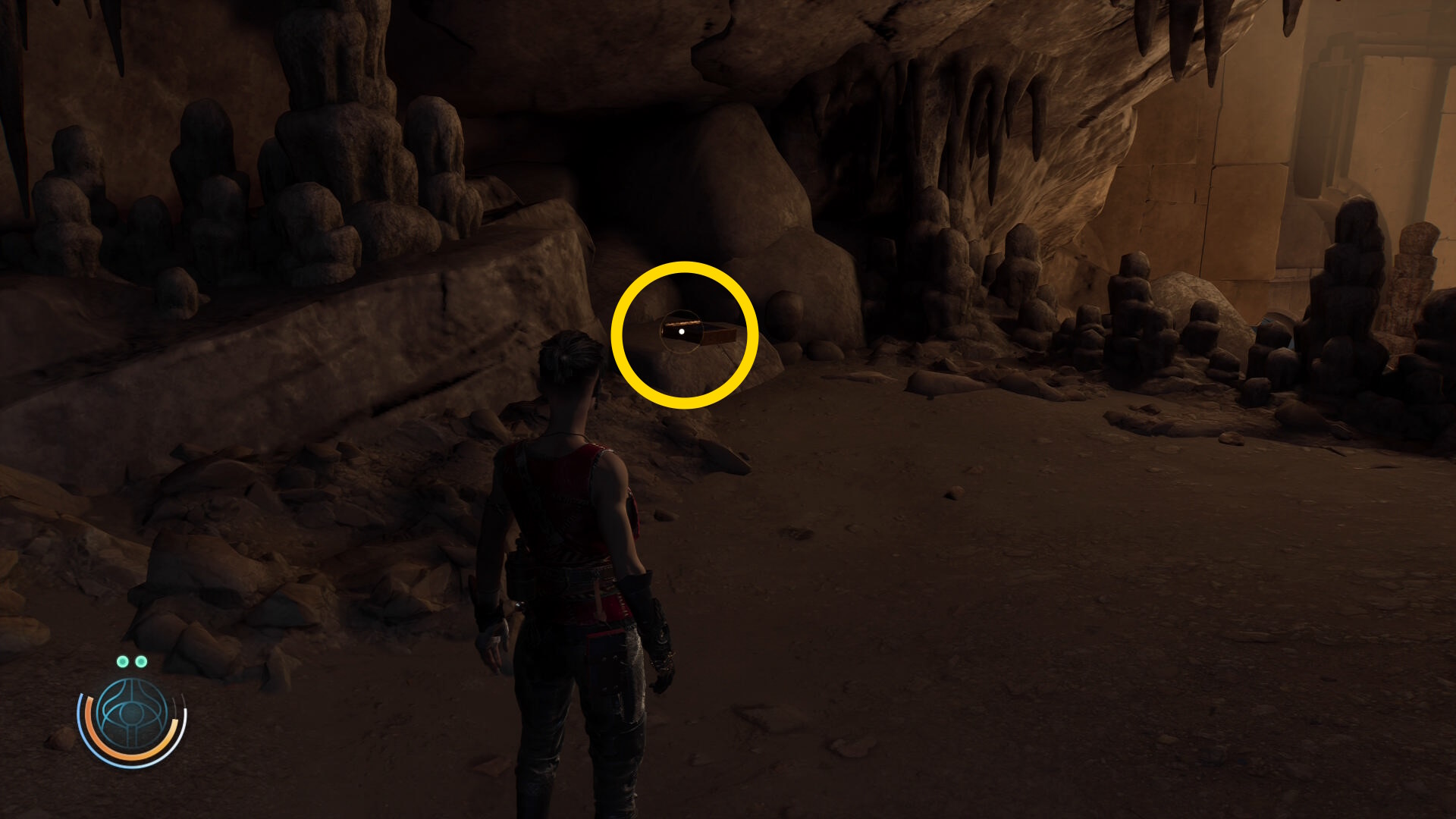 • 右に洞穴(下画像①)、右前方に木箱が置かれた凹み(下画像②)がある
