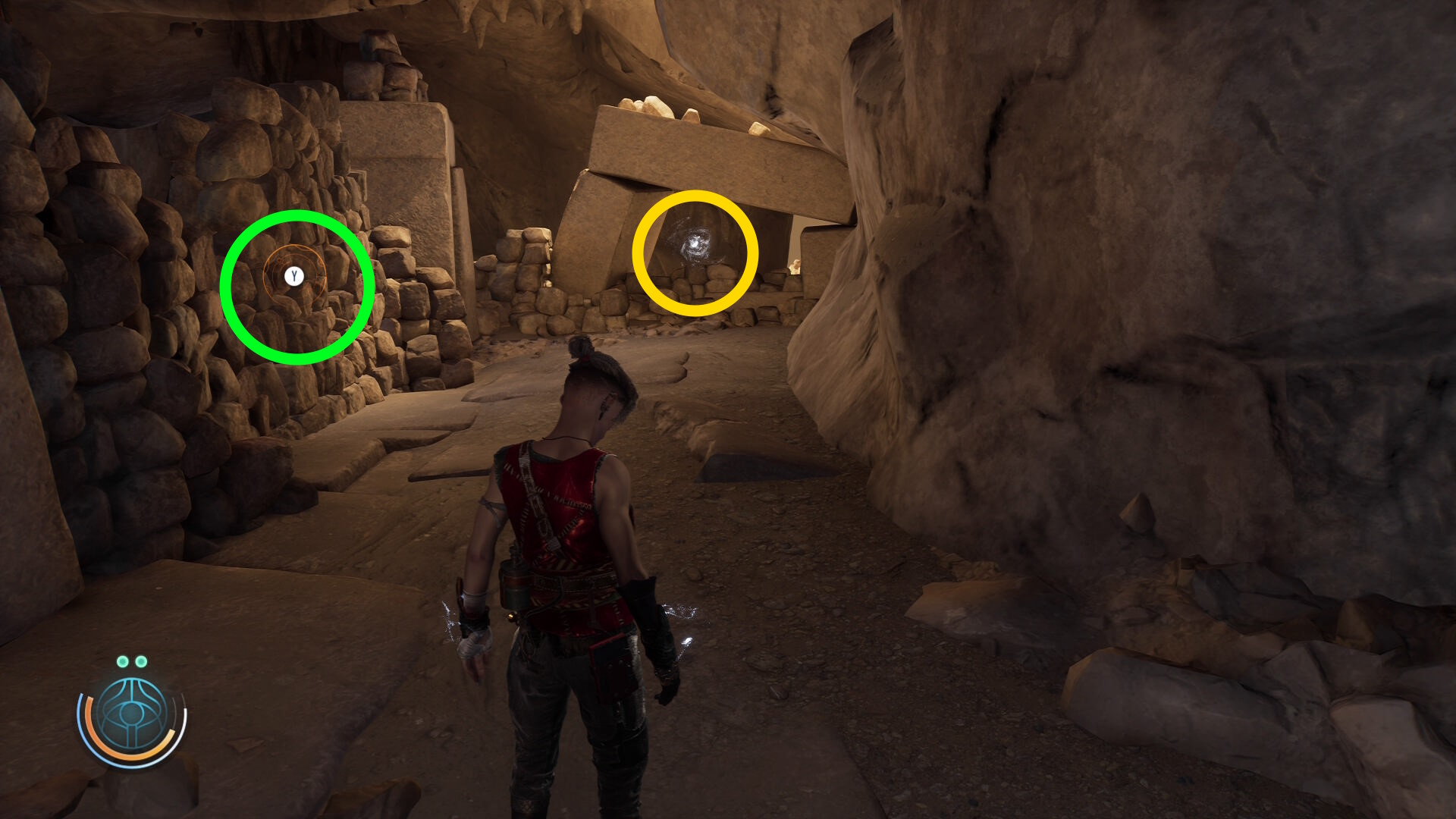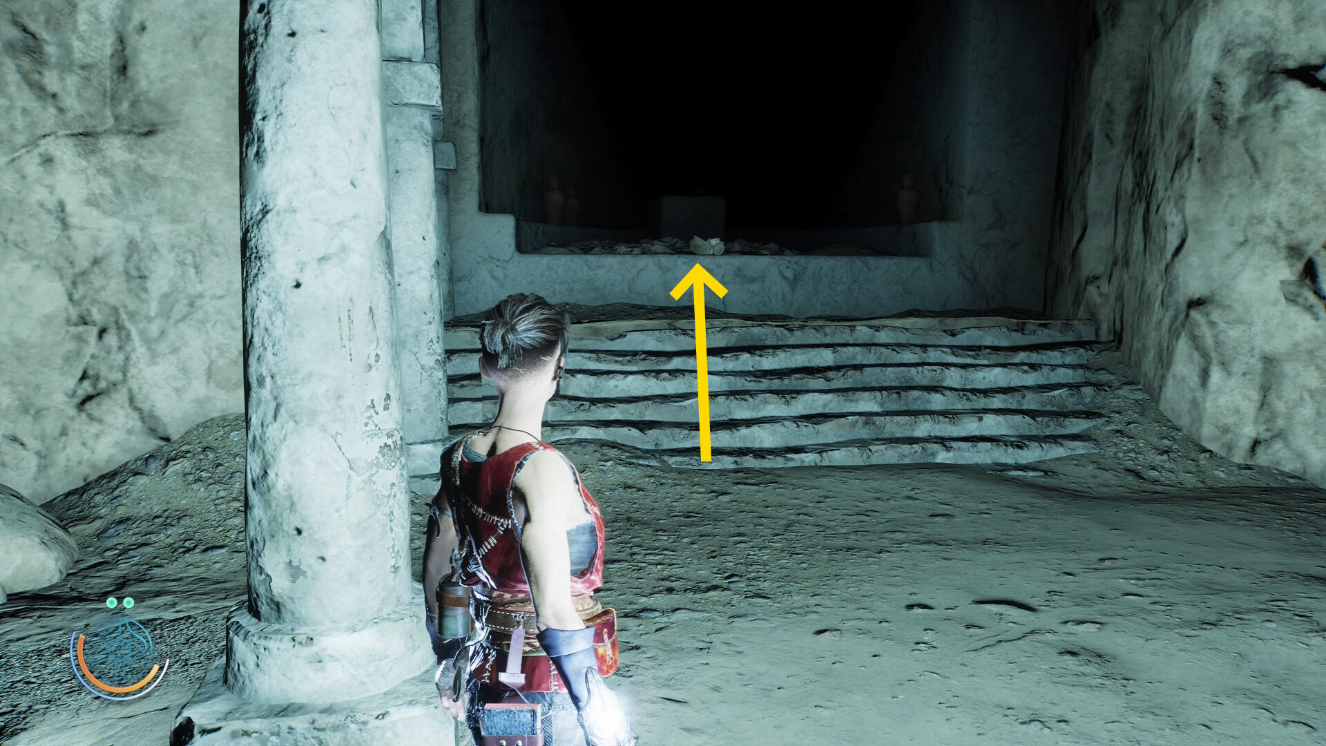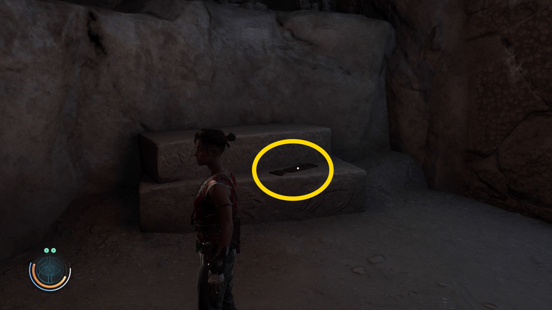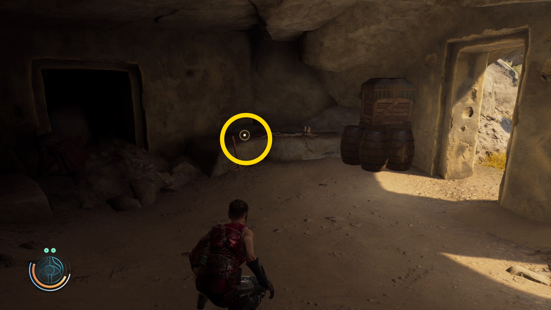 • 右に洞穴(下画像①)、右前方に木箱が置かれた凹み(下画像②)がある