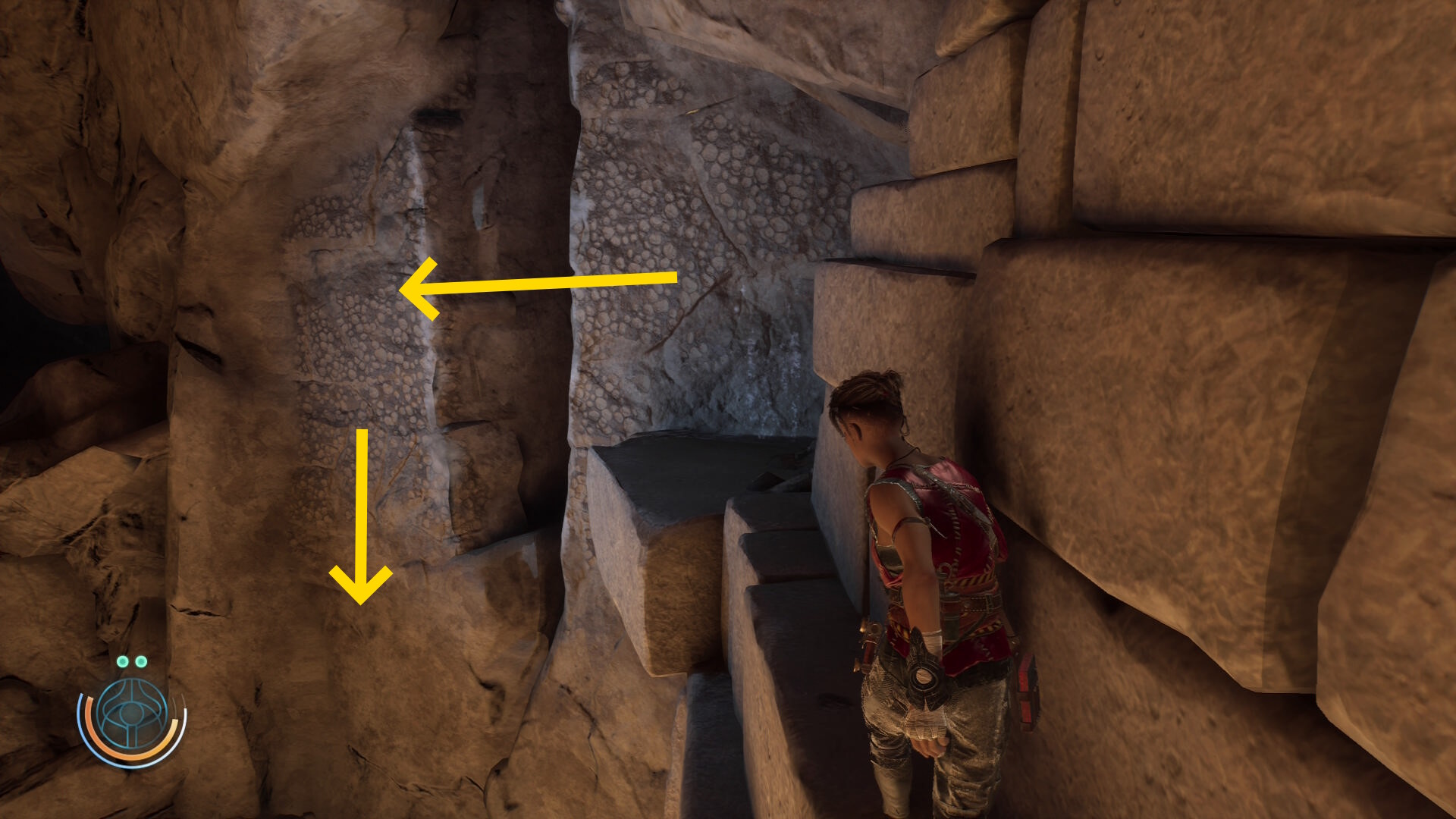 • 右に進んで外に出たら、左に進んで壁に掴まって下りていく