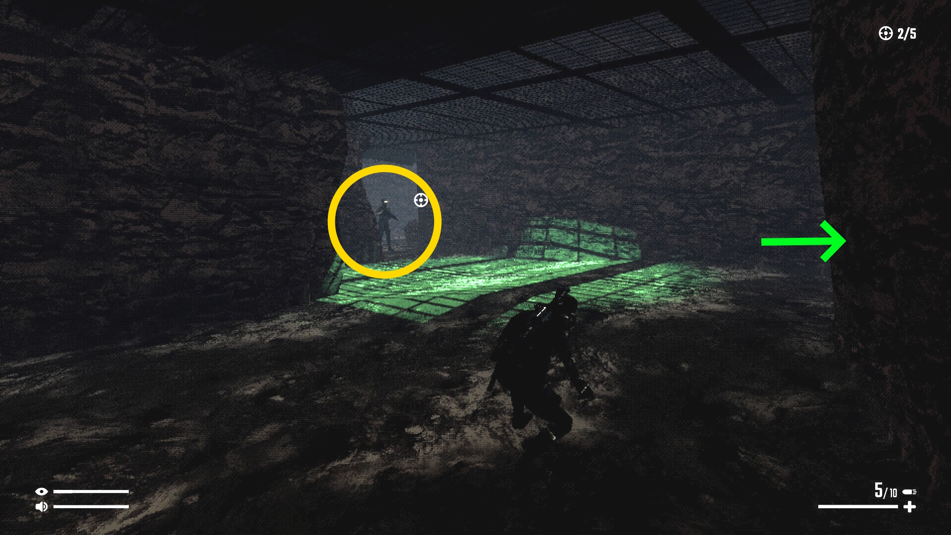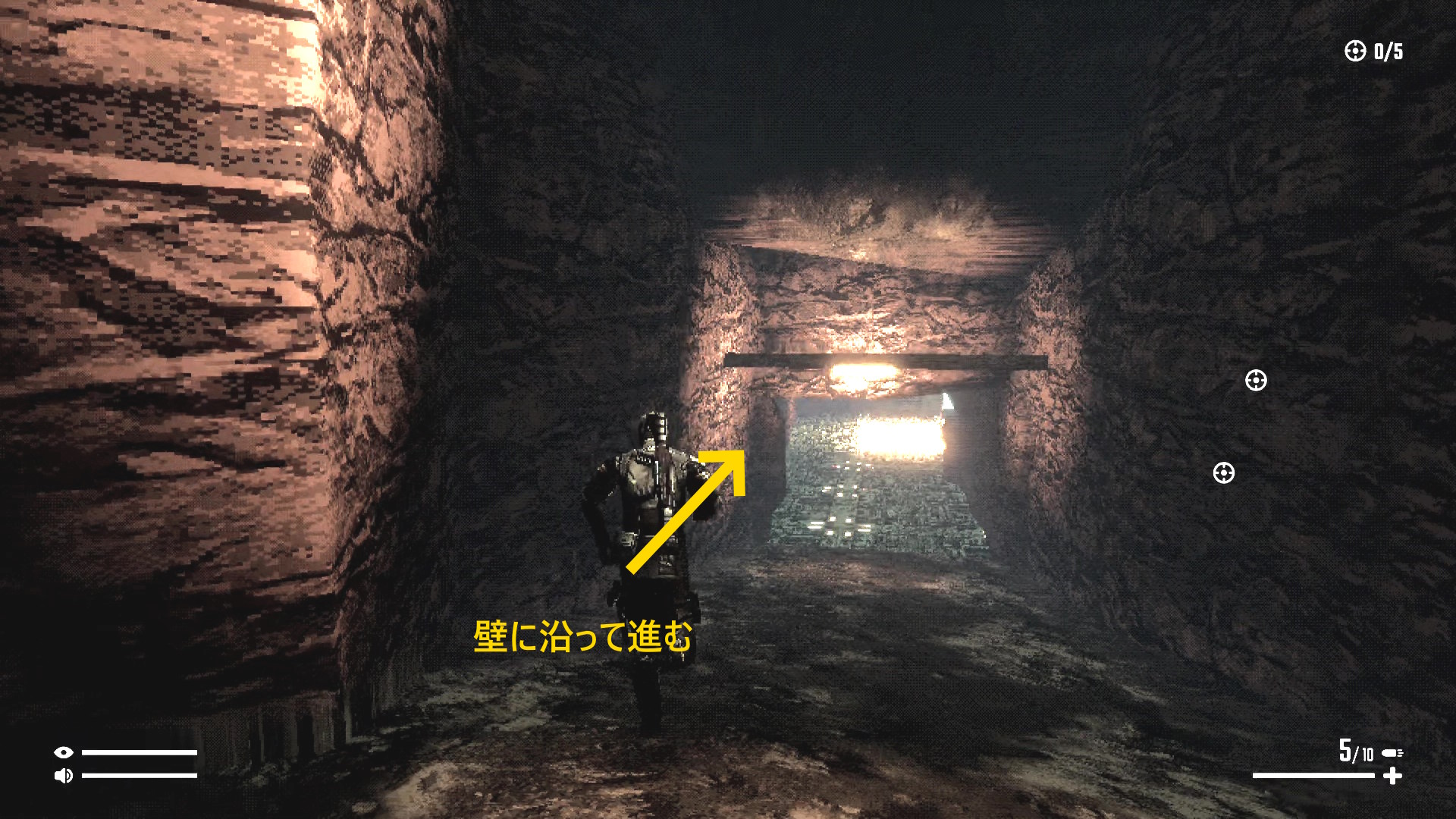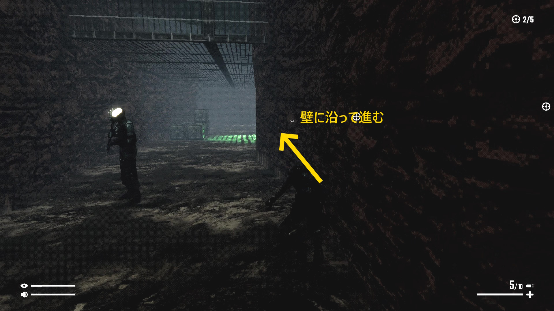 - 右壁に沿ってゆっくり進み、背後に回り込んでキル