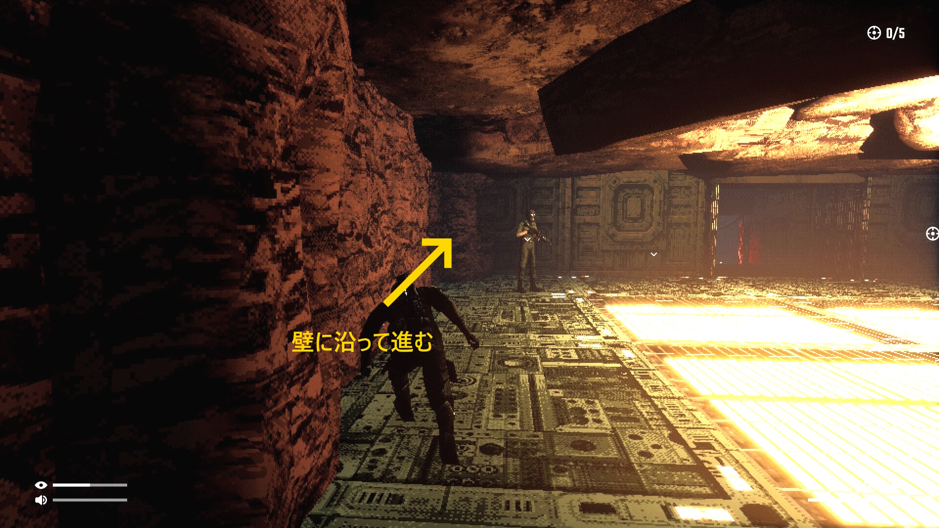 - 左壁に沿って進み、立ち止まった敵の背後に入ってキル