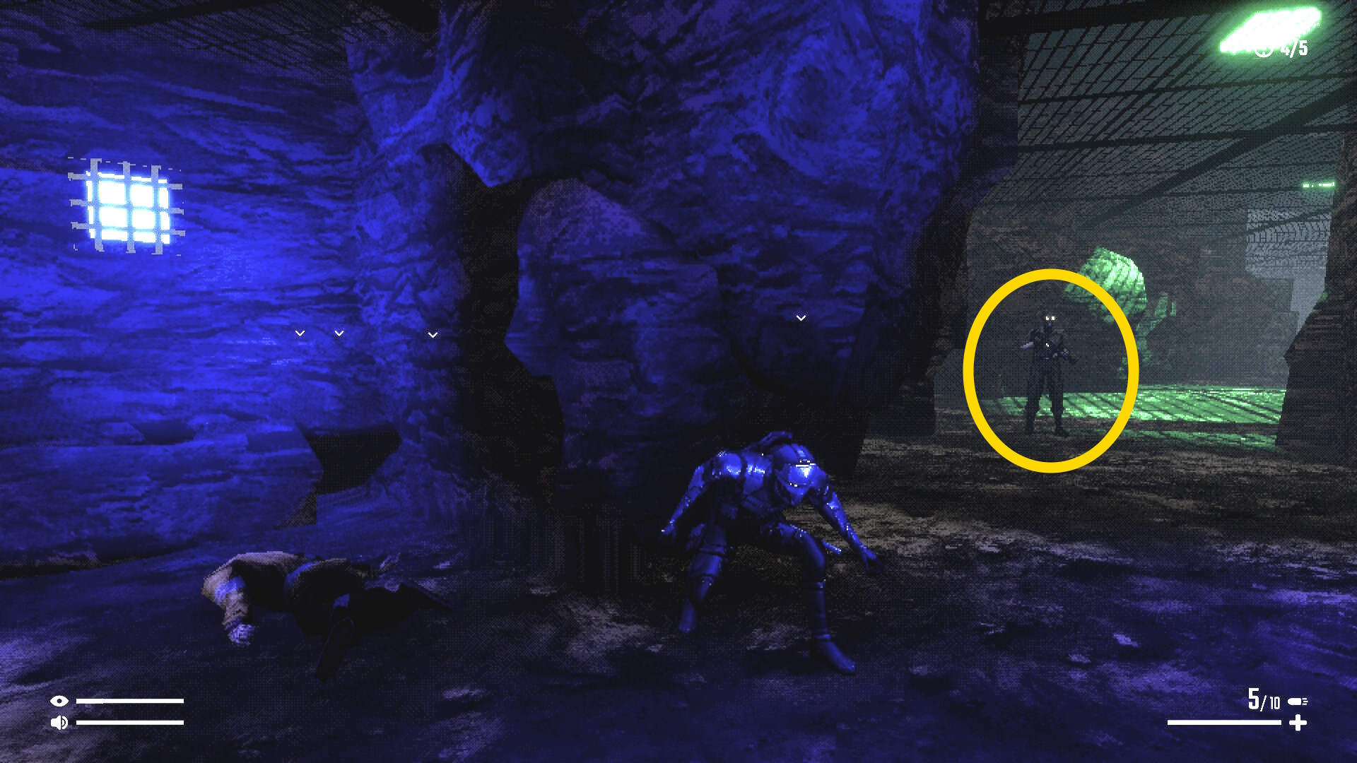 - 2人の敵をキルしたところまで戻ったら、奥に青いライトが灯っているのが見える