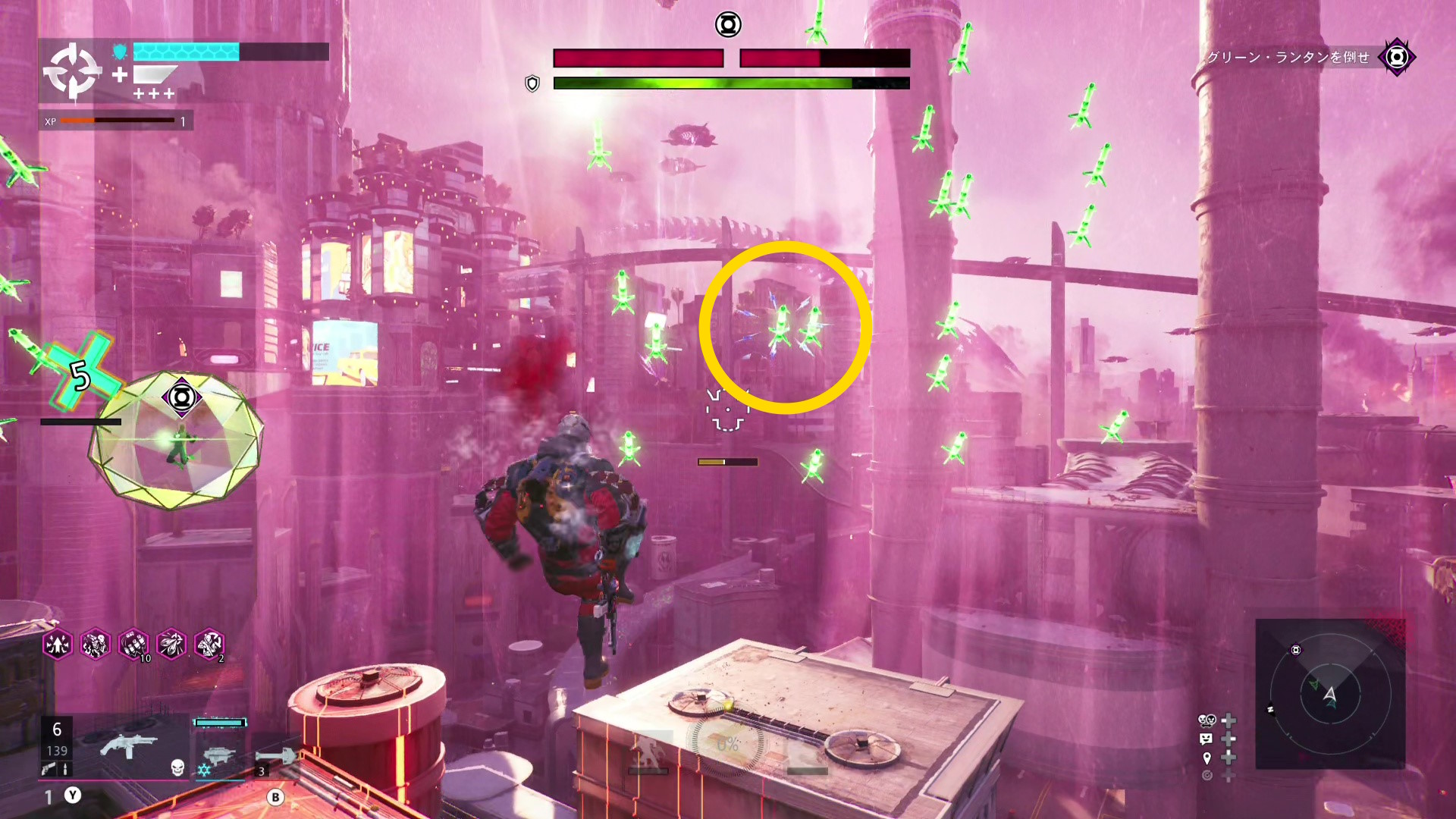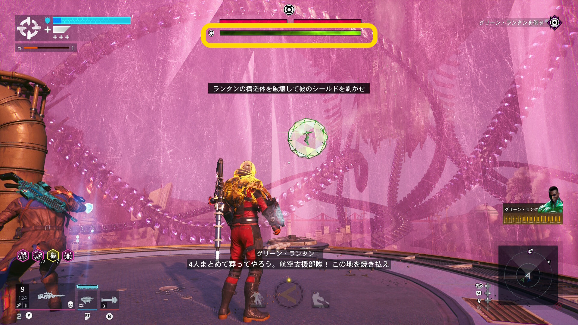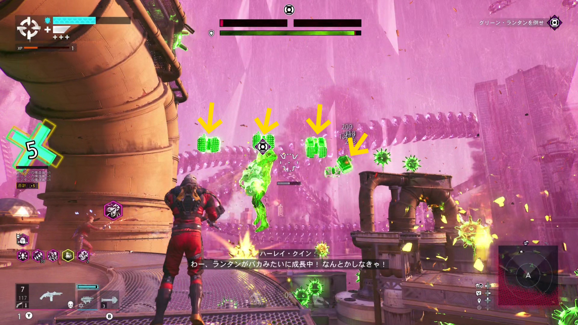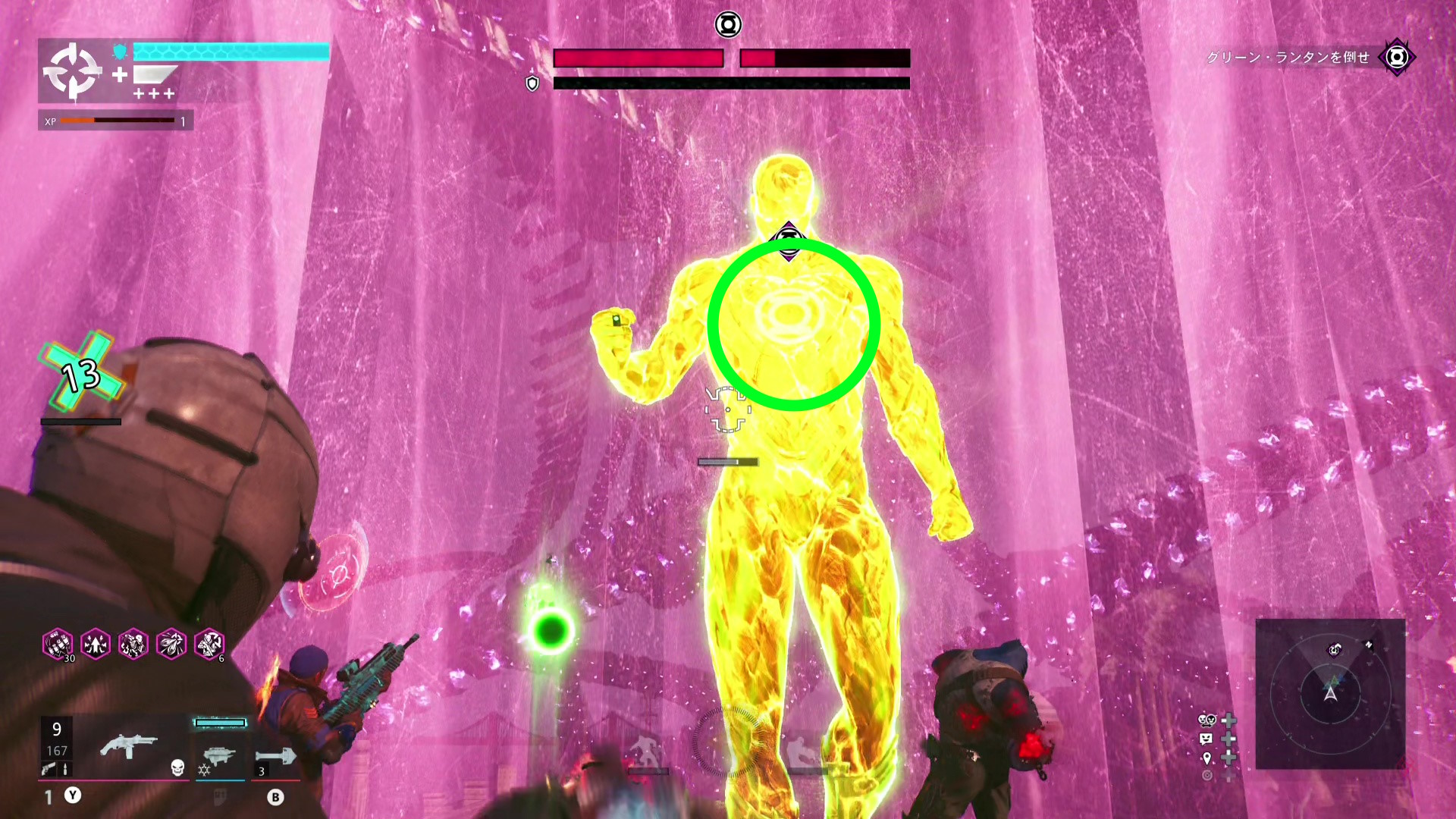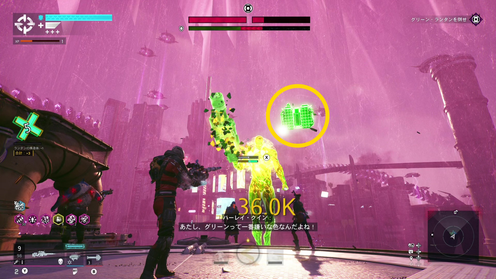 巨大化したグリーン・ランタンの挙動バグ バグというほどではないが、巨大化したグリーン・ランタンがガトリングガンをぶっ放さず、デッドショットの周囲をぐるぐる移動するだけのことがある この場合、出現するロケットランチャーを破壊し続けながら、胸のランタンマークを攻撃するとダメージを与えられる バリアゲージがゼロにし、胸のマークを撃ってもダメージが与えられないこともある