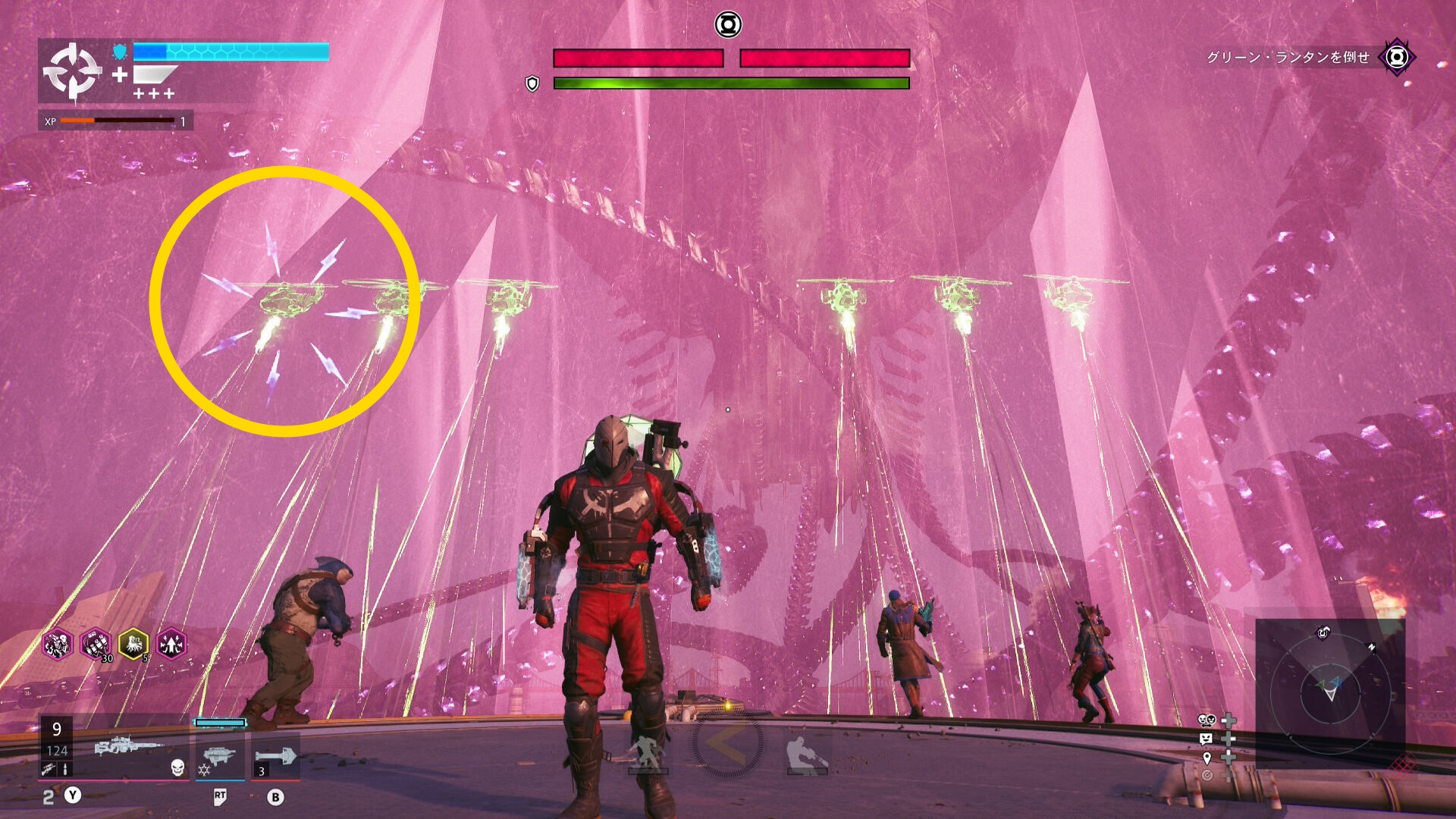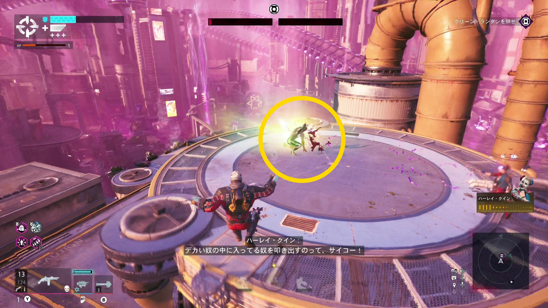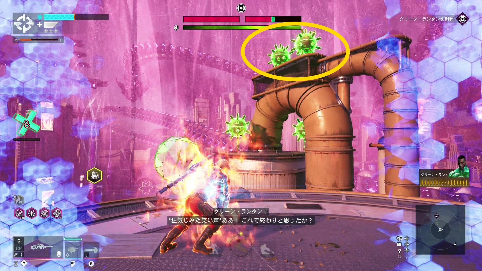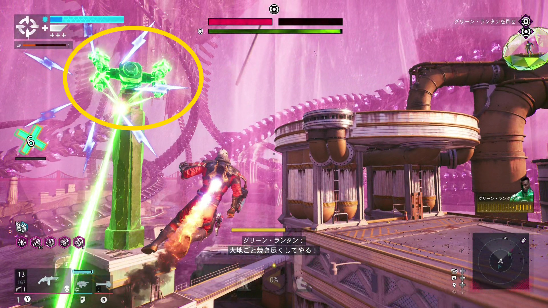 巨大化したグリーン・ランタンの挙動バグ バグというほどではないが、巨大化したグリーン・ランタンがガトリングガンをぶっ放さず、デッドショットの周囲をぐるぐる移動するだけのことがある この場合、出現するロケットランチャーを破壊し続けながら、胸のランタンマークを攻撃するとダメージを与えられる バリアゲージがゼロにし、胸のマークを撃ってもダメージが与えられないこともある