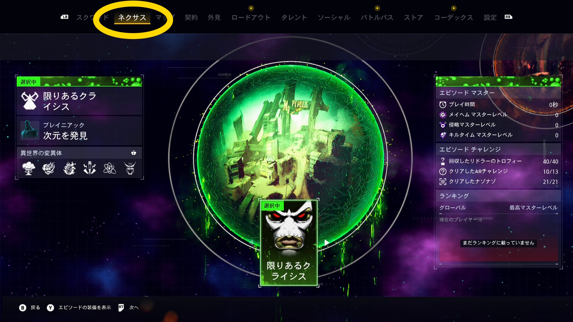 • 無事に獲得できたら、セッションを一度切り、ゲームモード ⇒ 限りあるクライシスを選択してプレイ再開(エンドゲームへ)