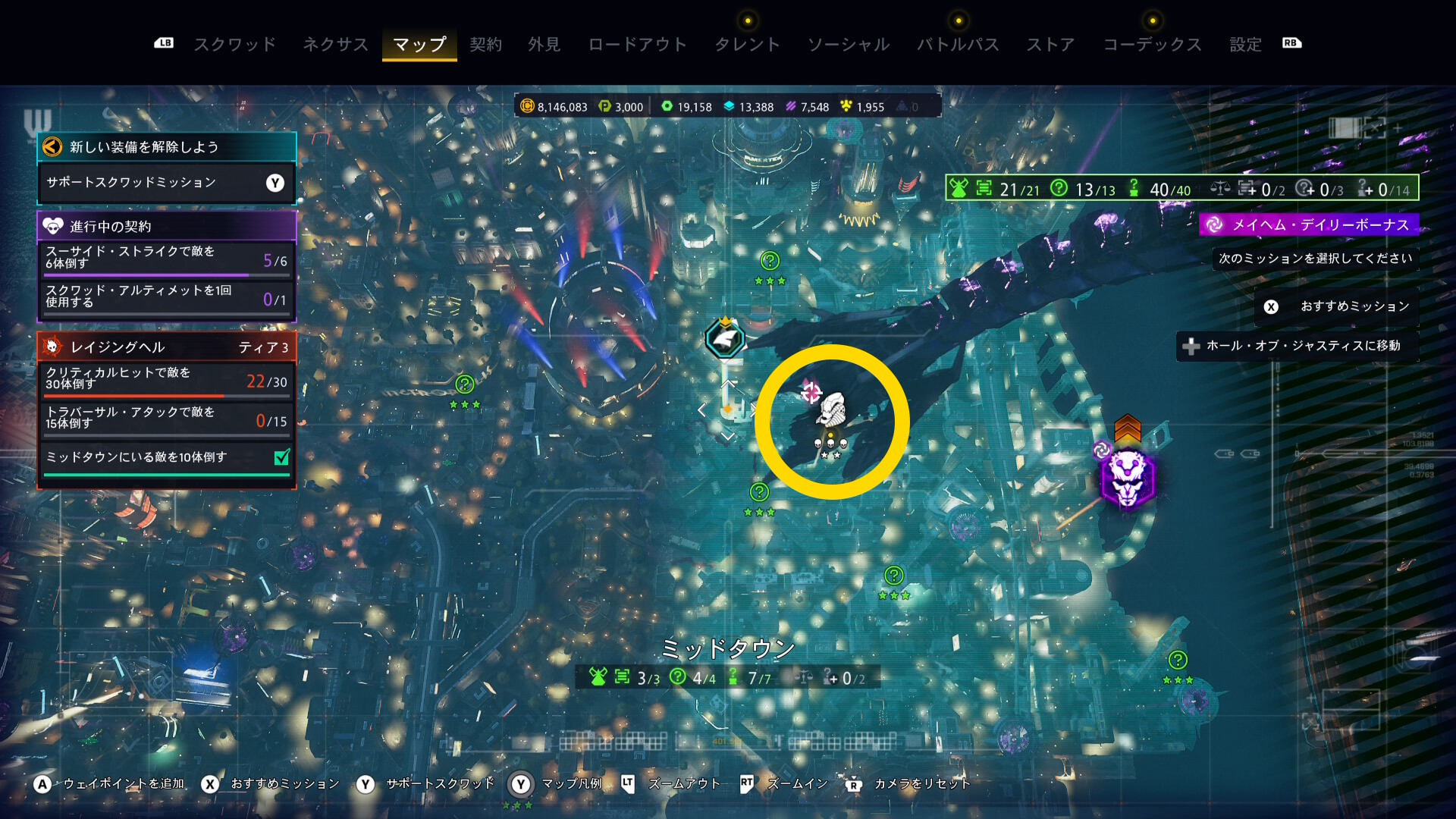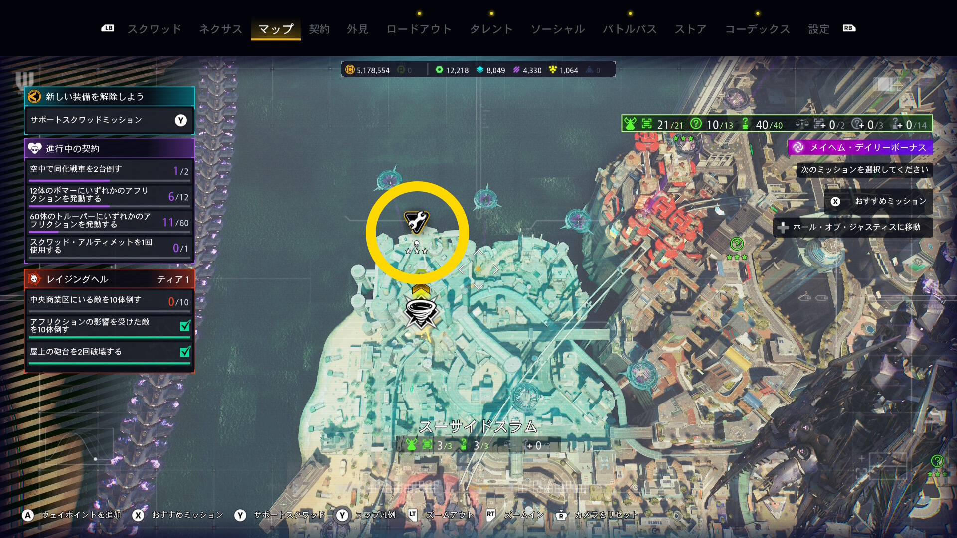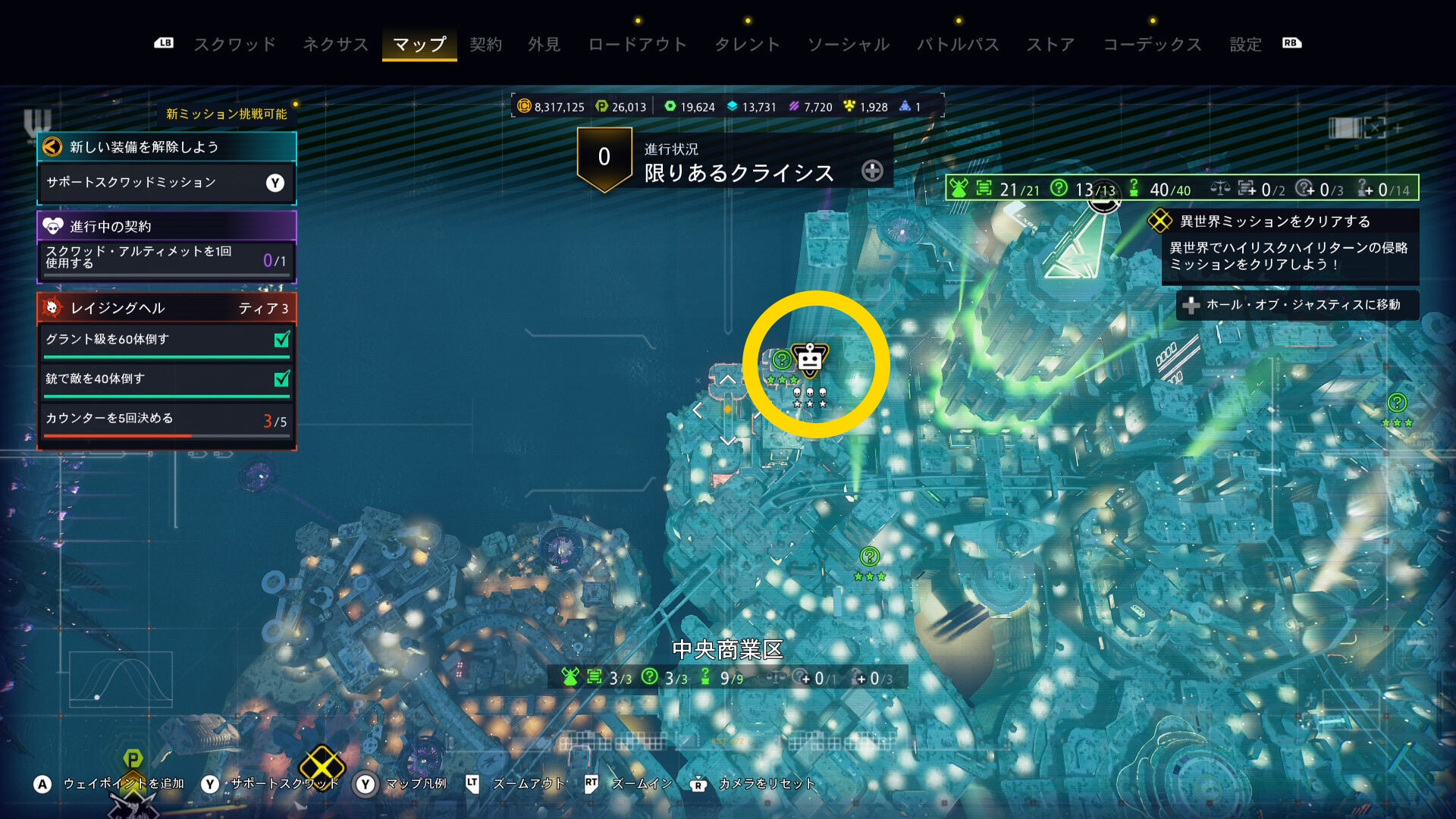 • なお、ミッションマーカーおよびサポートスクワッドミッションマーカーの他に単発のミッションがいくつか表示されているが、いつの間にか消えていたりするので基本的には無視してオーケー