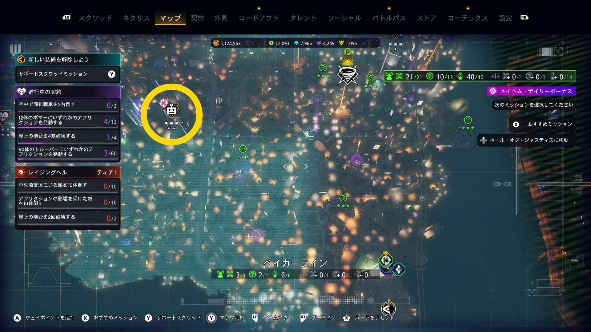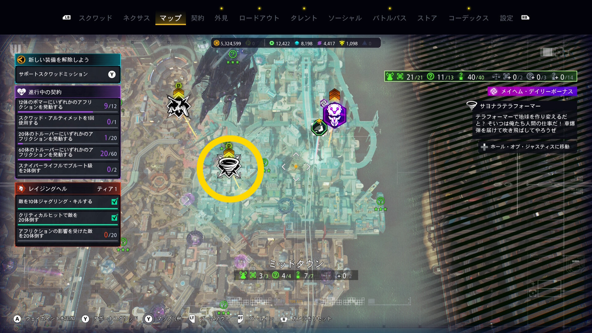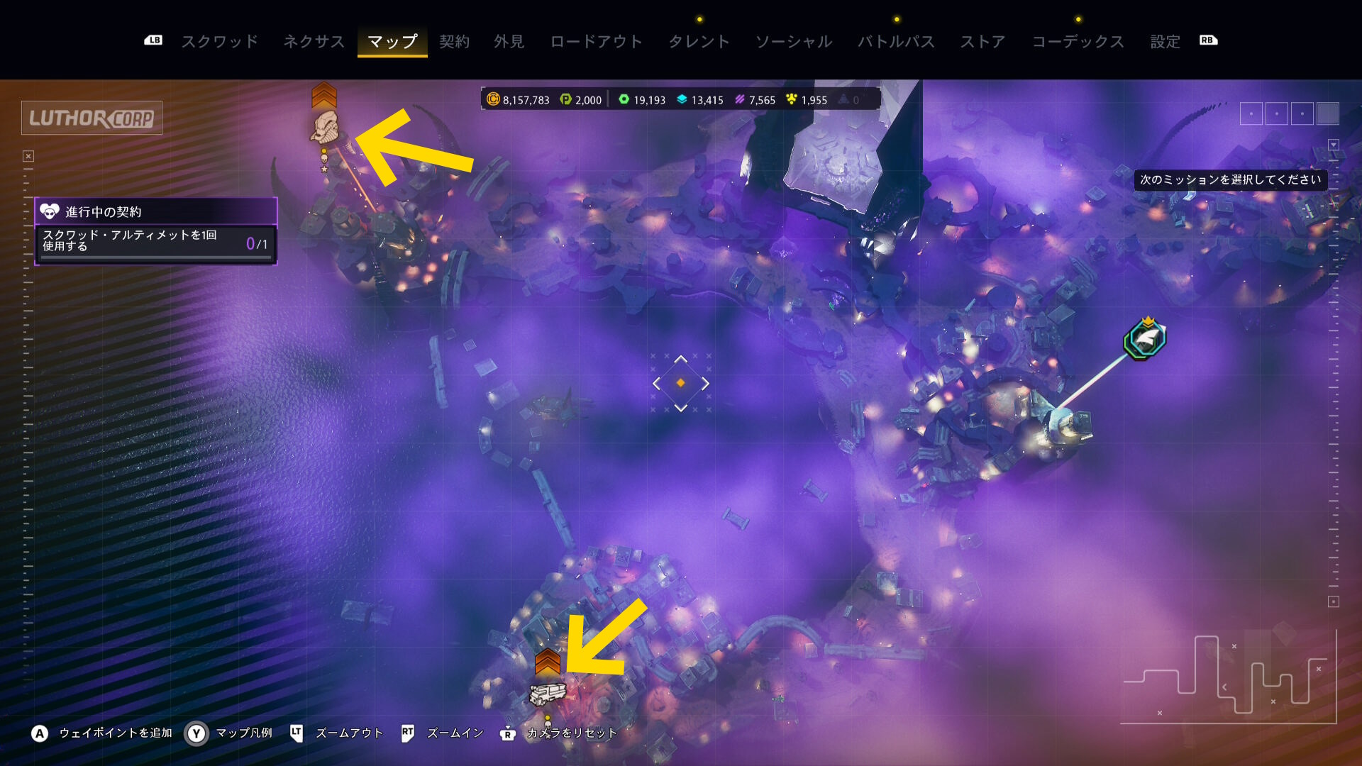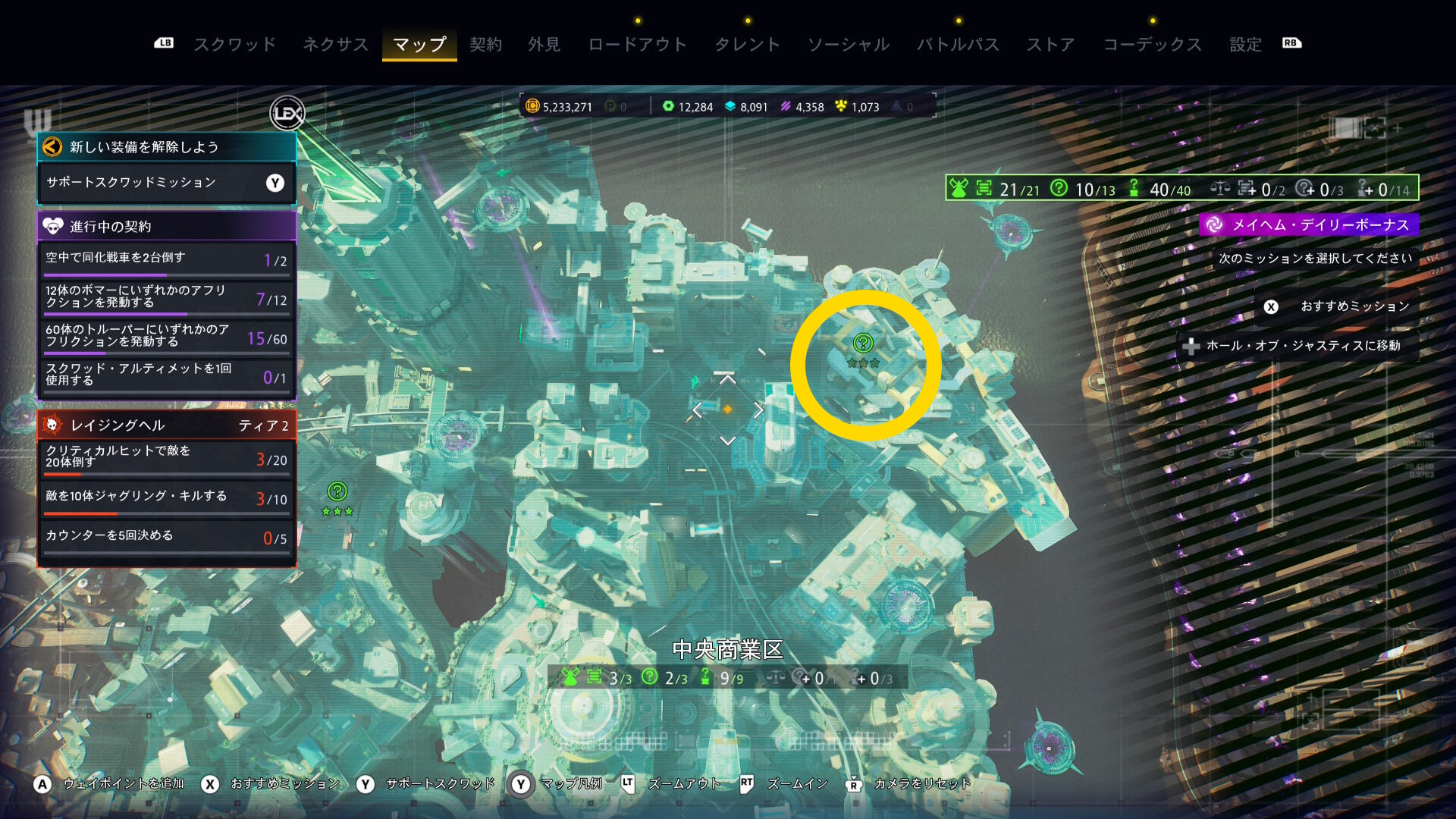 • なお、ミッションマーカーおよびサポートスクワッドミッションマーカーの他に単発のミッションがいくつか表示されているが、いつの間にか消えていたりするので基本的には無視してオーケー