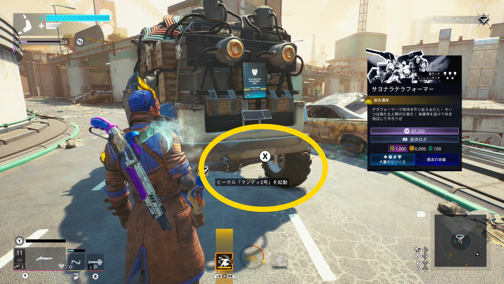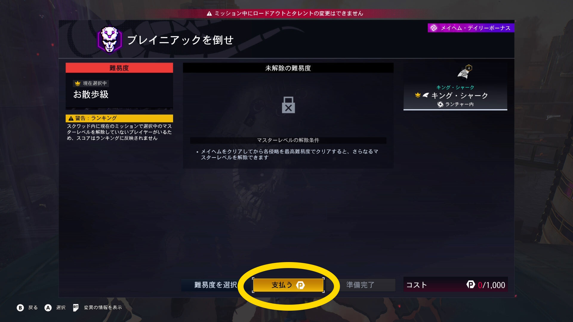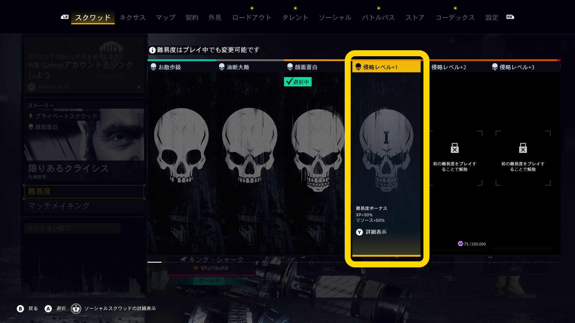 • セレクトボタン ⇒ セッション ⇒ 難易度 と進み、侵略レベル +1 に変更しておこう(エンドゲーム終盤、スクワッドレベル上げに利用するため)