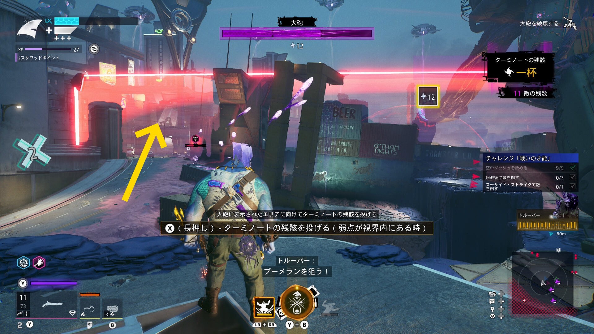 • 屋上の砲台を破壊後、紫色の光がすぐ照らされるようになる(下画像)