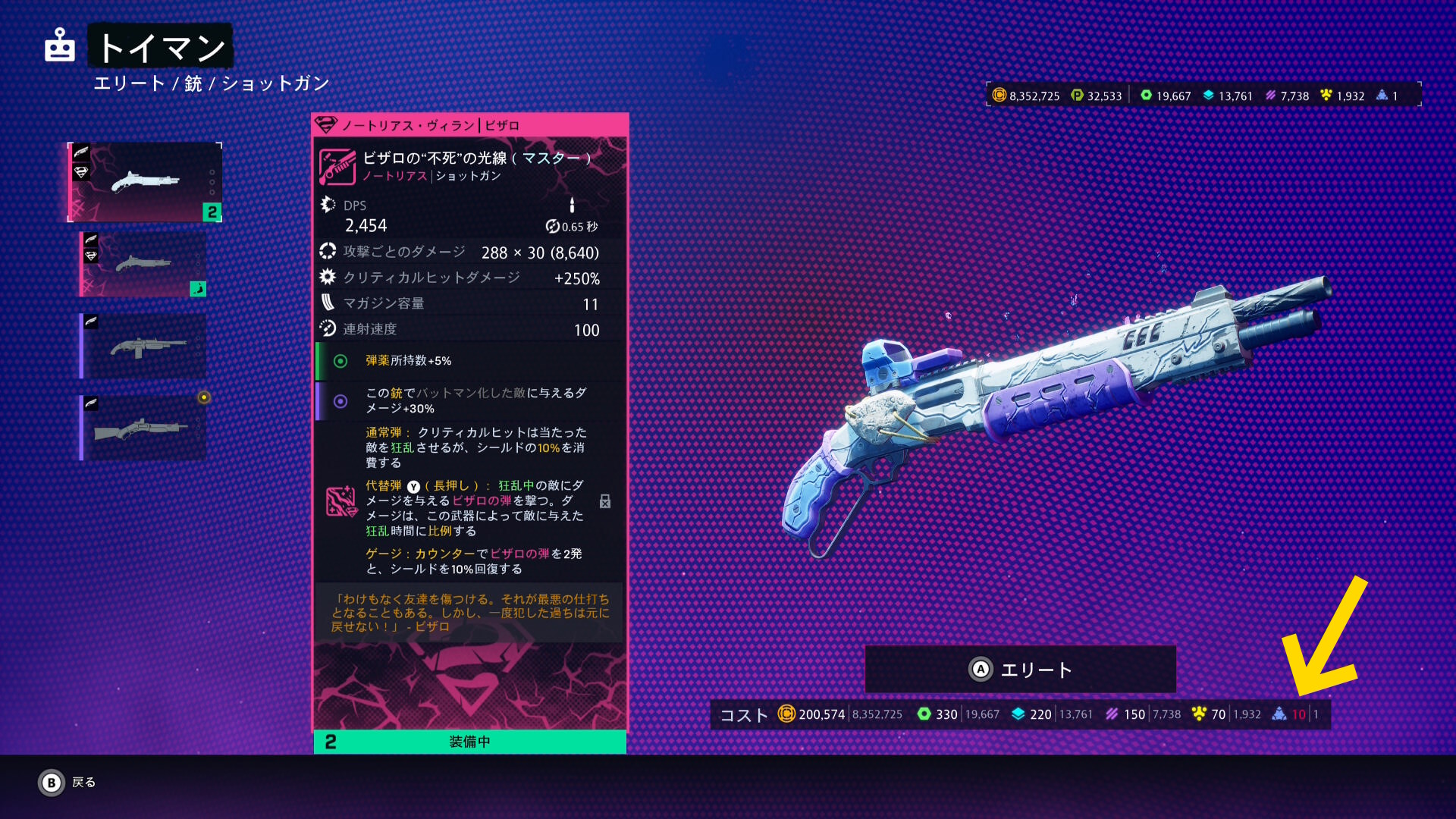 • ノートリアスのショットガン ビザロの ”不死” 光線(マスター)より攻撃力は劣るが、経験上ビザロのショットガンではエンドゲームの中盤以降がかなり厳しい