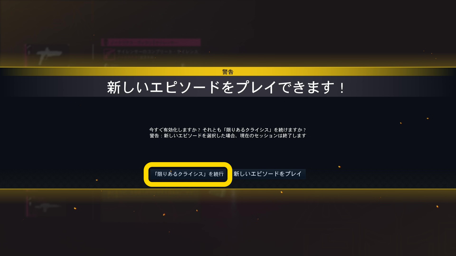 • 「エピソード8:均衡」のインファミーセットの画面まで進んだら、B を押して戻ると ”新しいエピソードがプレイできます!” の画面になるので、「限りあるクライシス」を続行 を選ぶこと