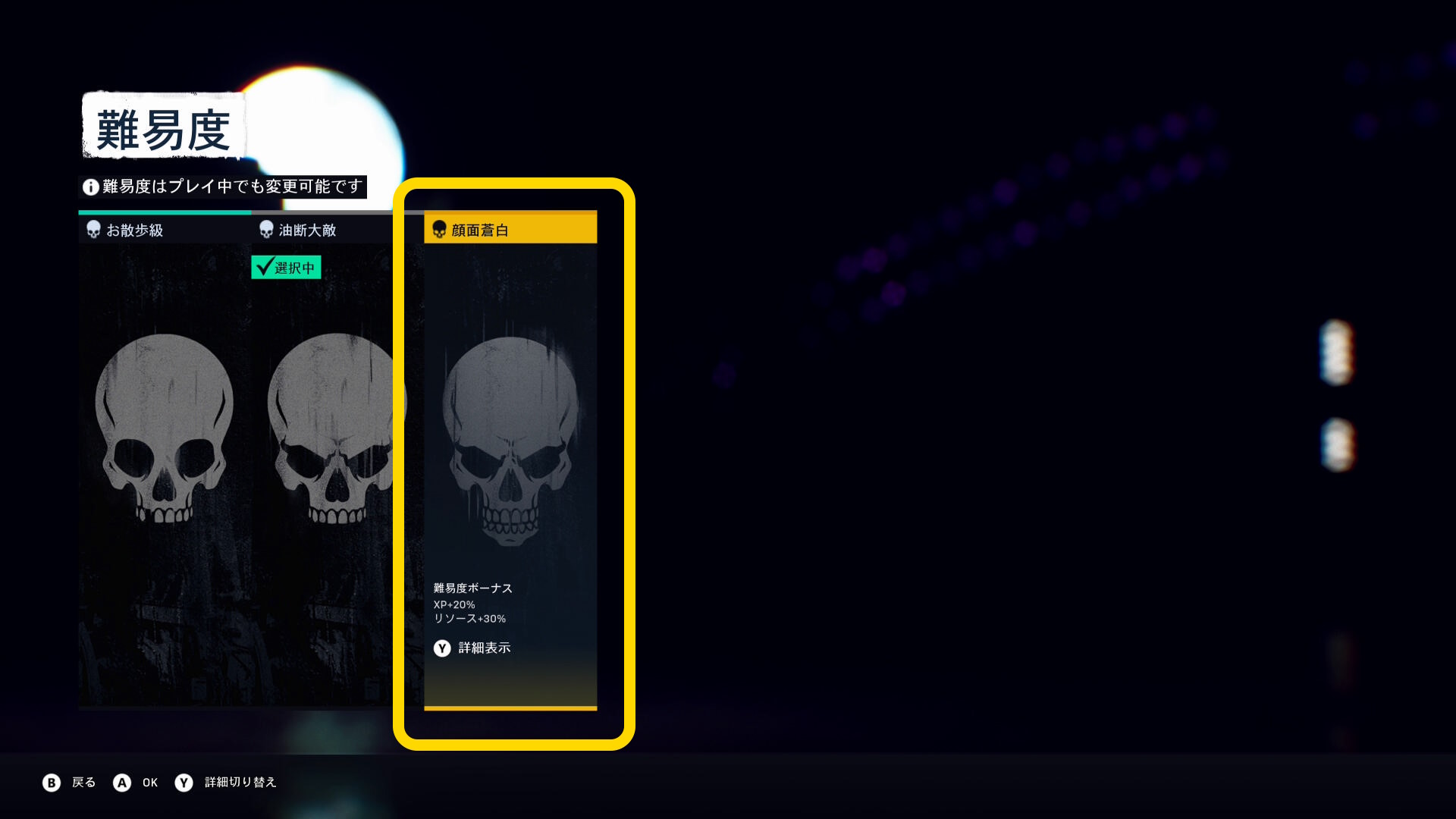 • 本作に難易度実績はないが、難易度が上がると獲得できる経験値とリソースにボーナスが付与されるため、現在のところ最高難易度の「顔面蒼白」を推奨