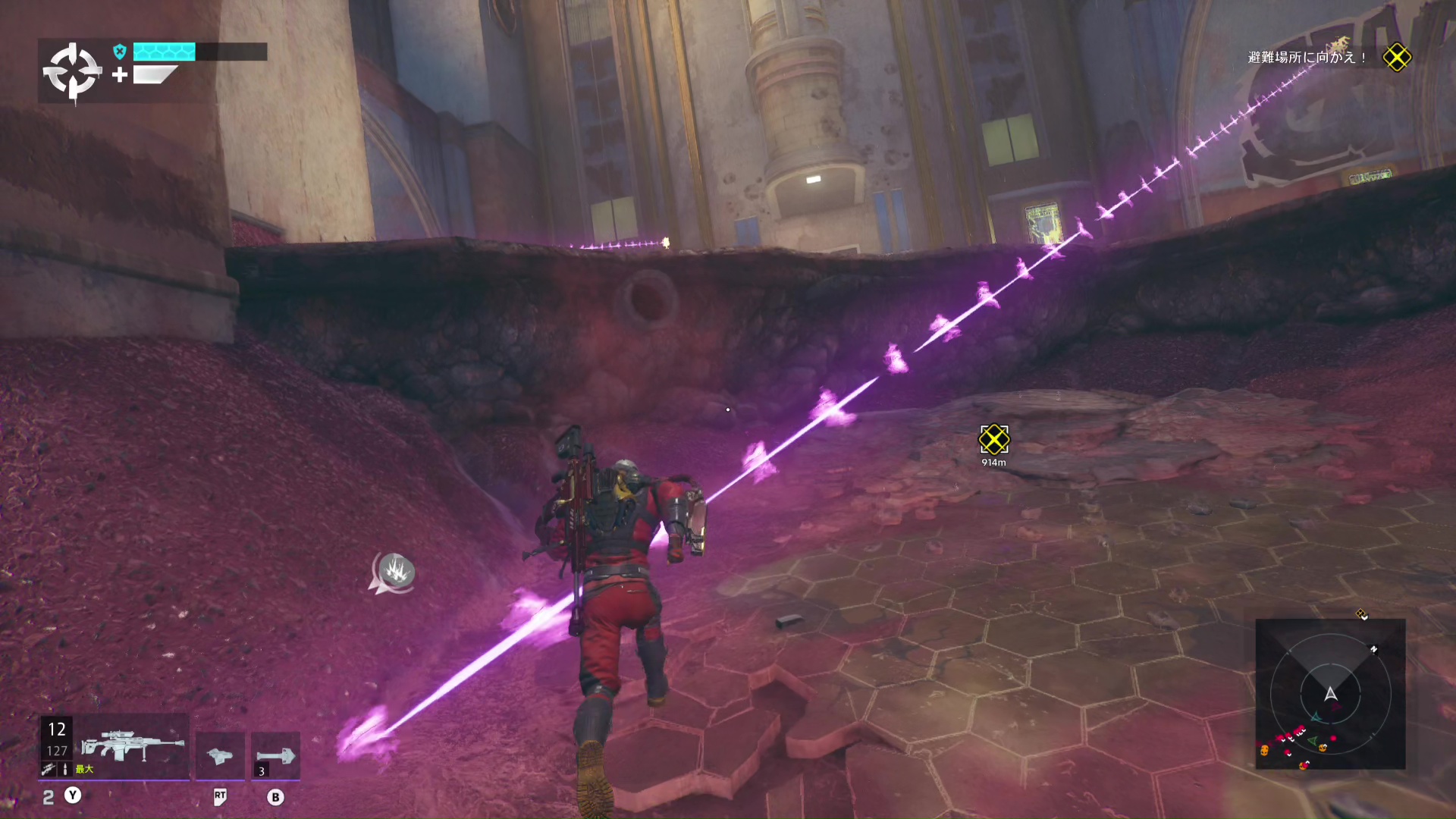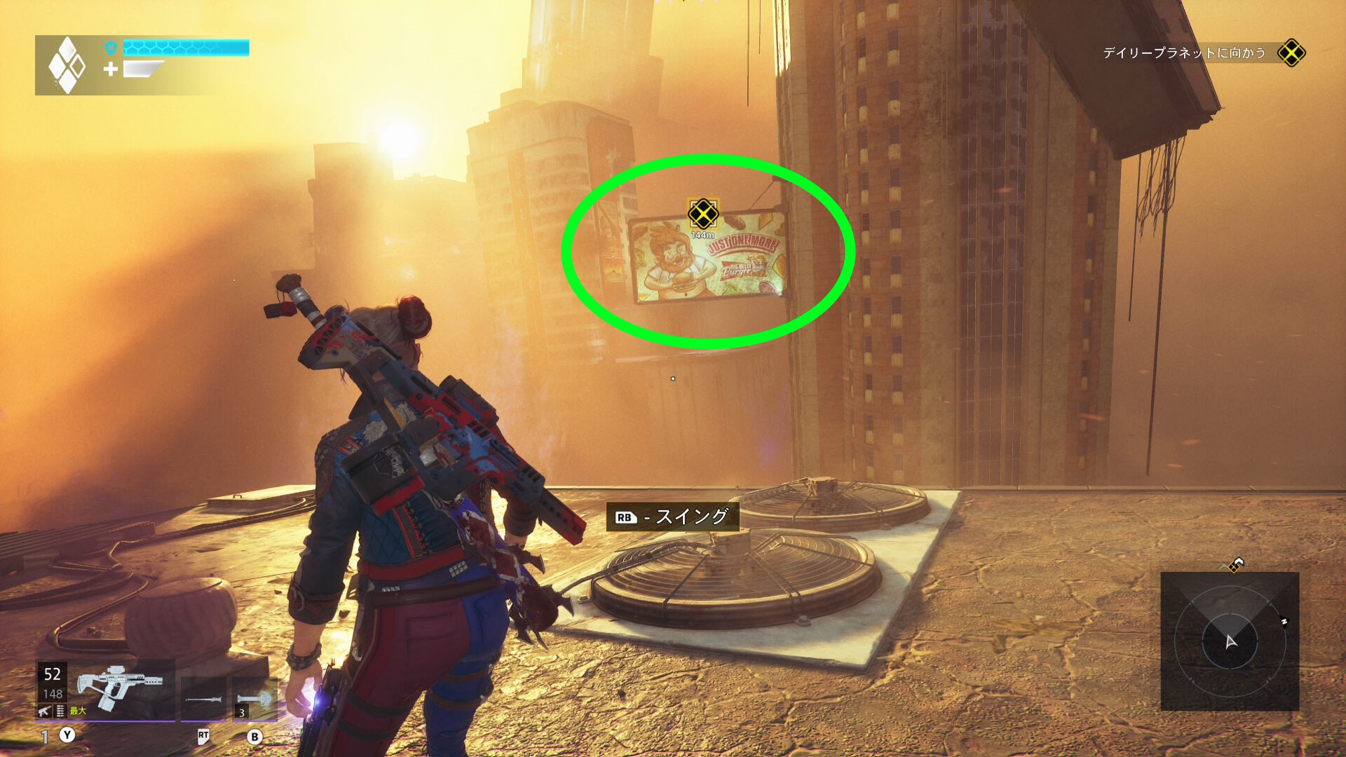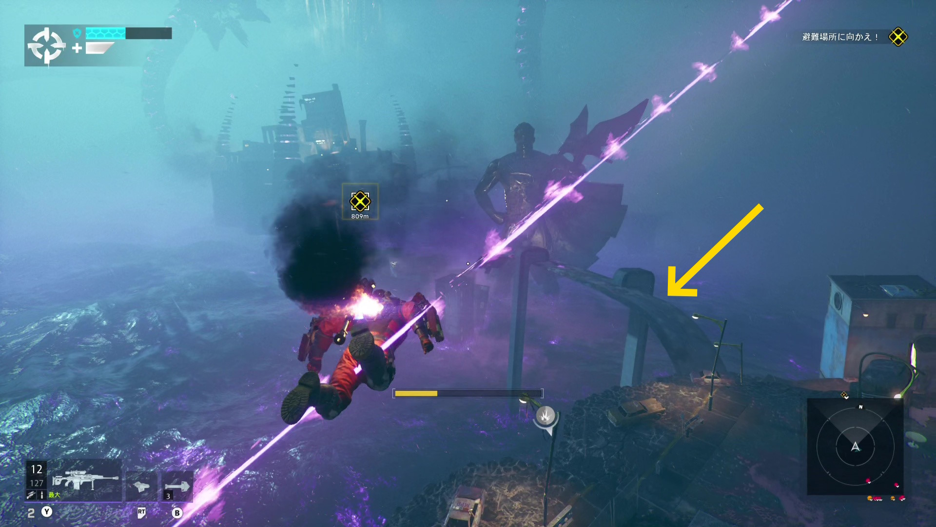 • ジャンプ後、看板に LB でグラップルし、そこに到着する直前に A を押すことでグラップル・オーバーシュートが発動できる