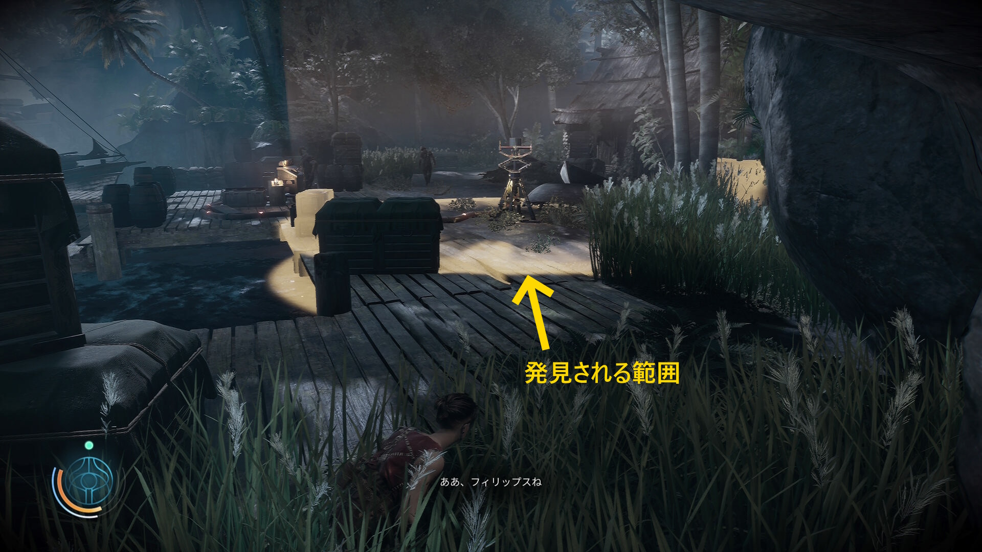 • この探知機にわざと見つかり、すぐ草むらに退避(右側のブルーザーがこちらを視認しているときは探知機に近づかないこと)