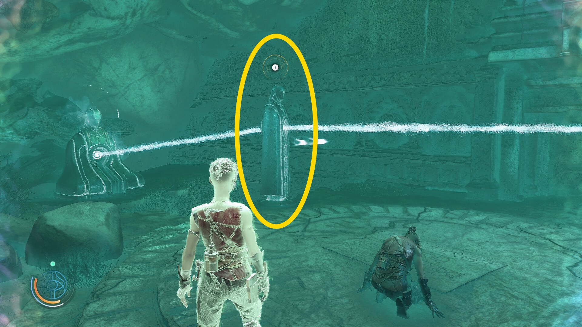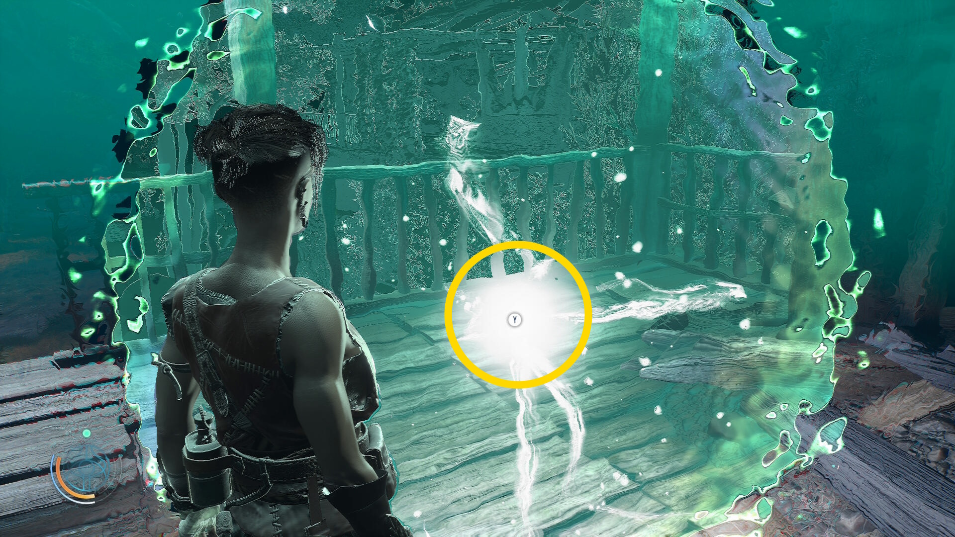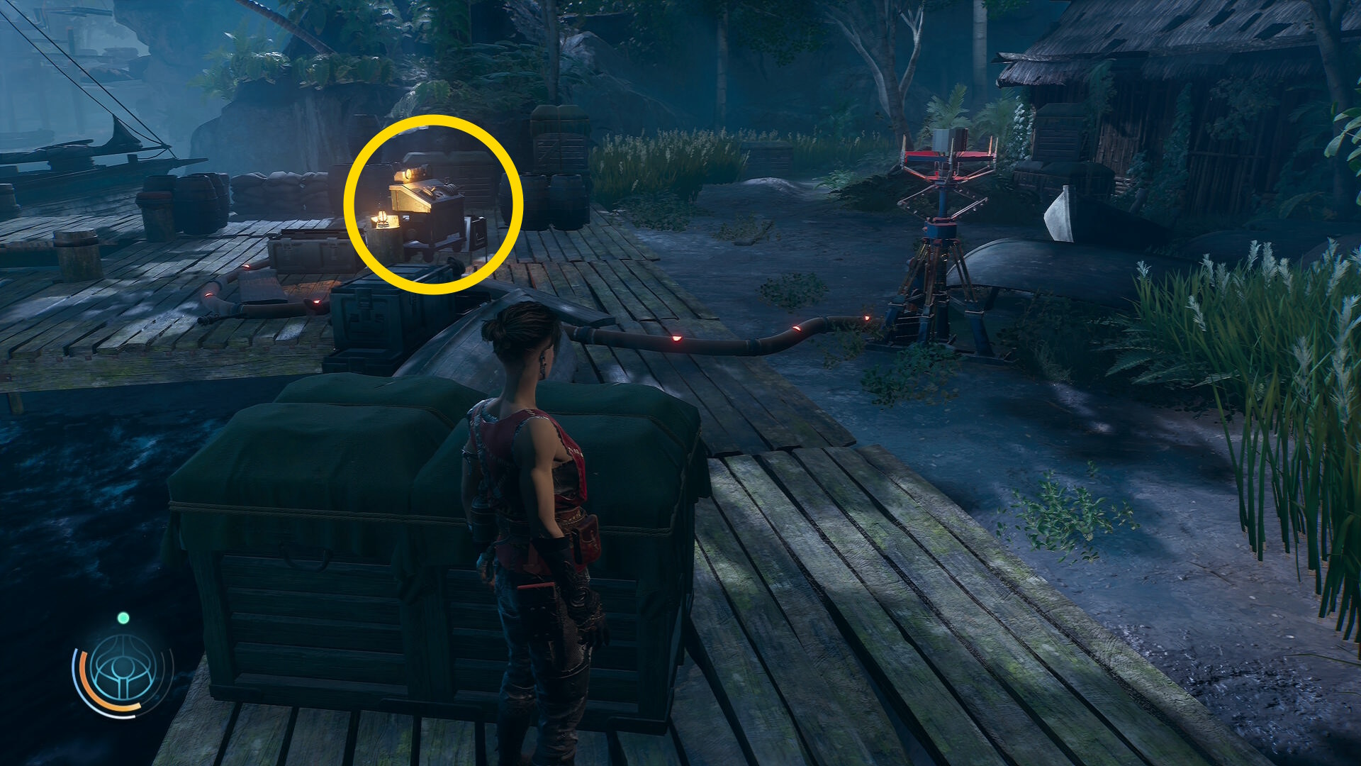 • 船着き場に到着すると一定間隔で光を発する ”クエスター探知機” が見える