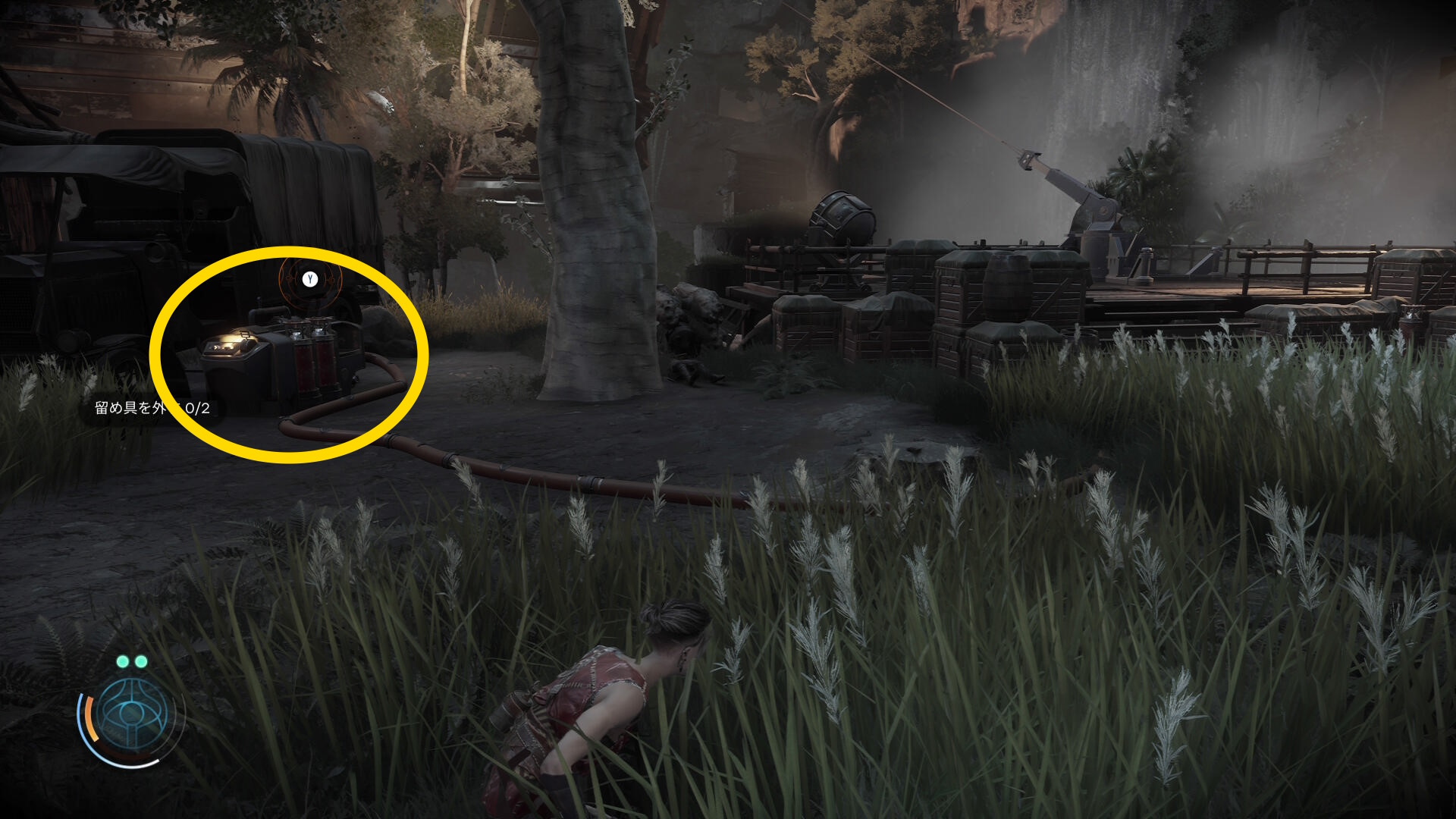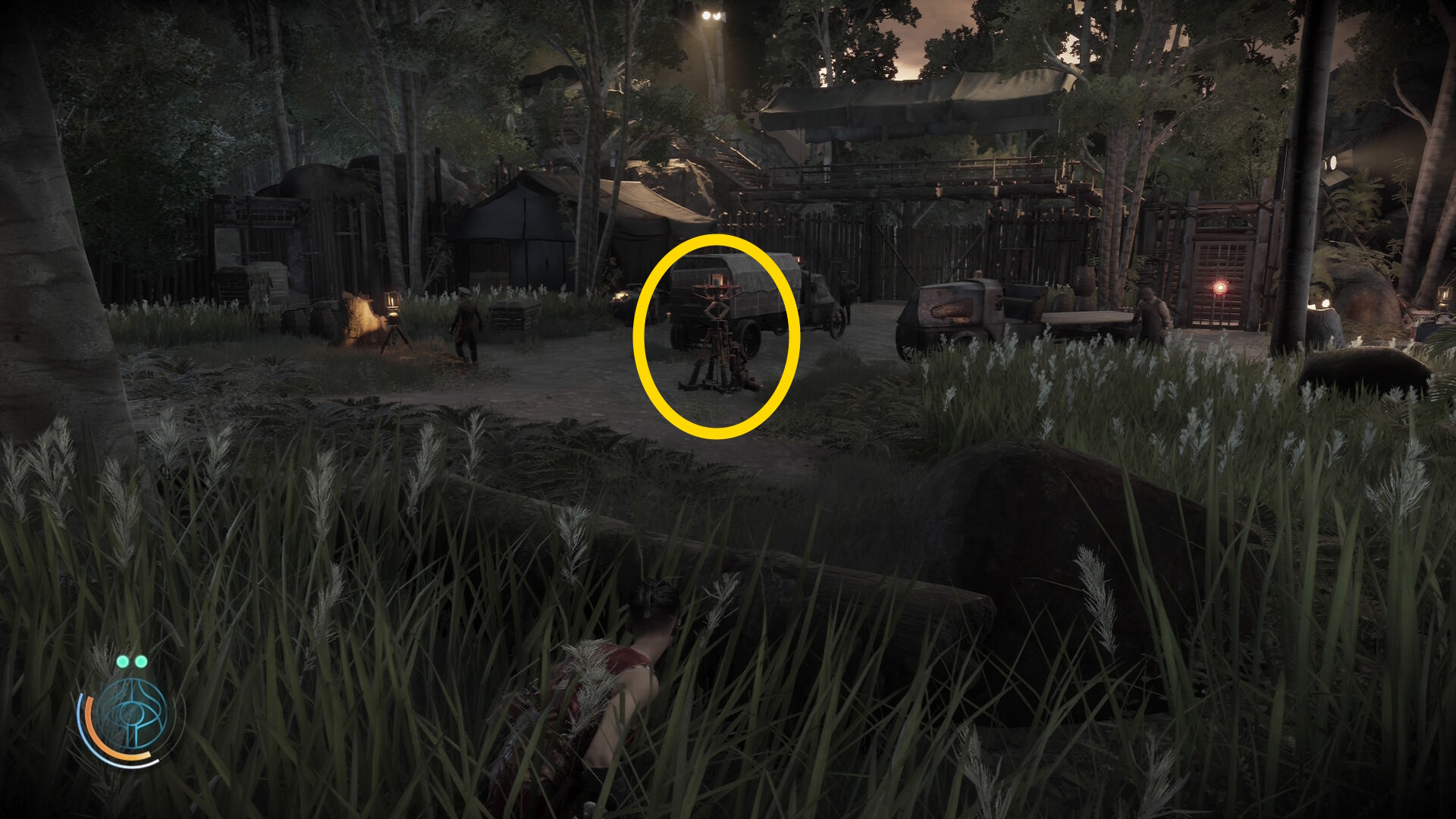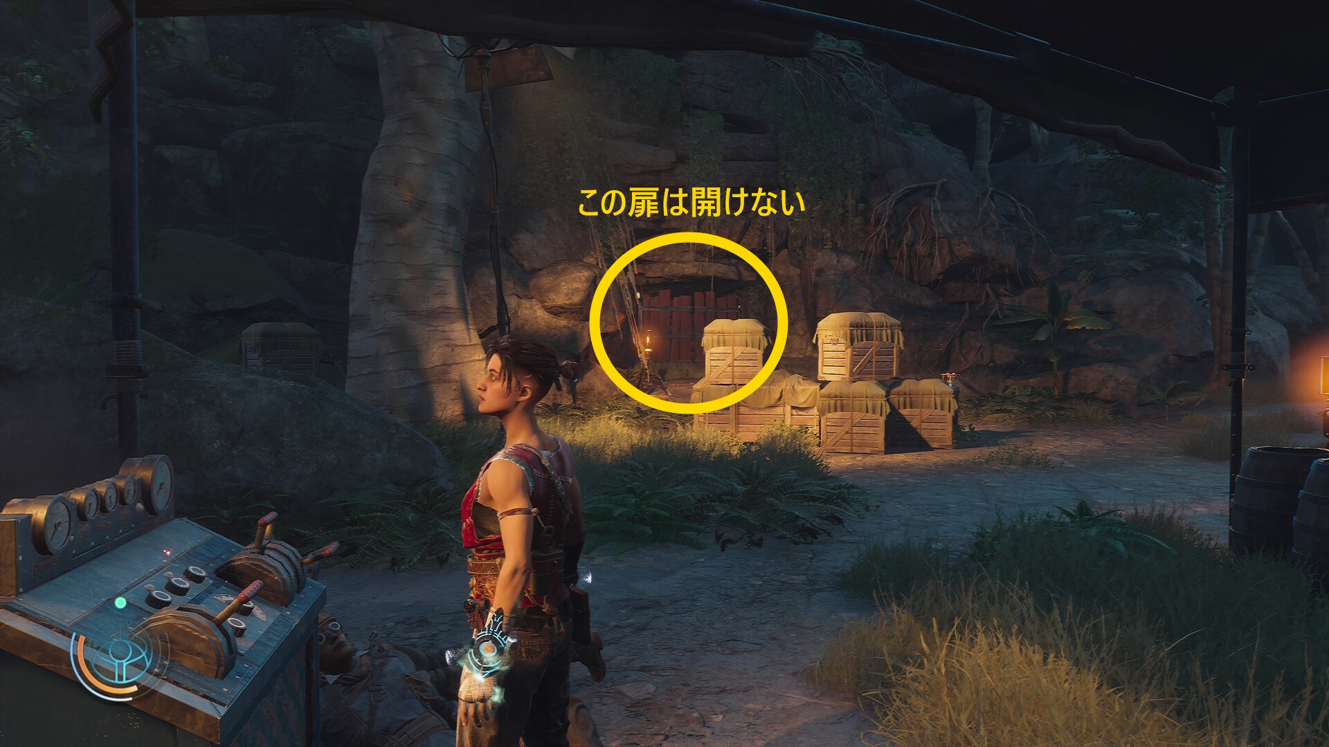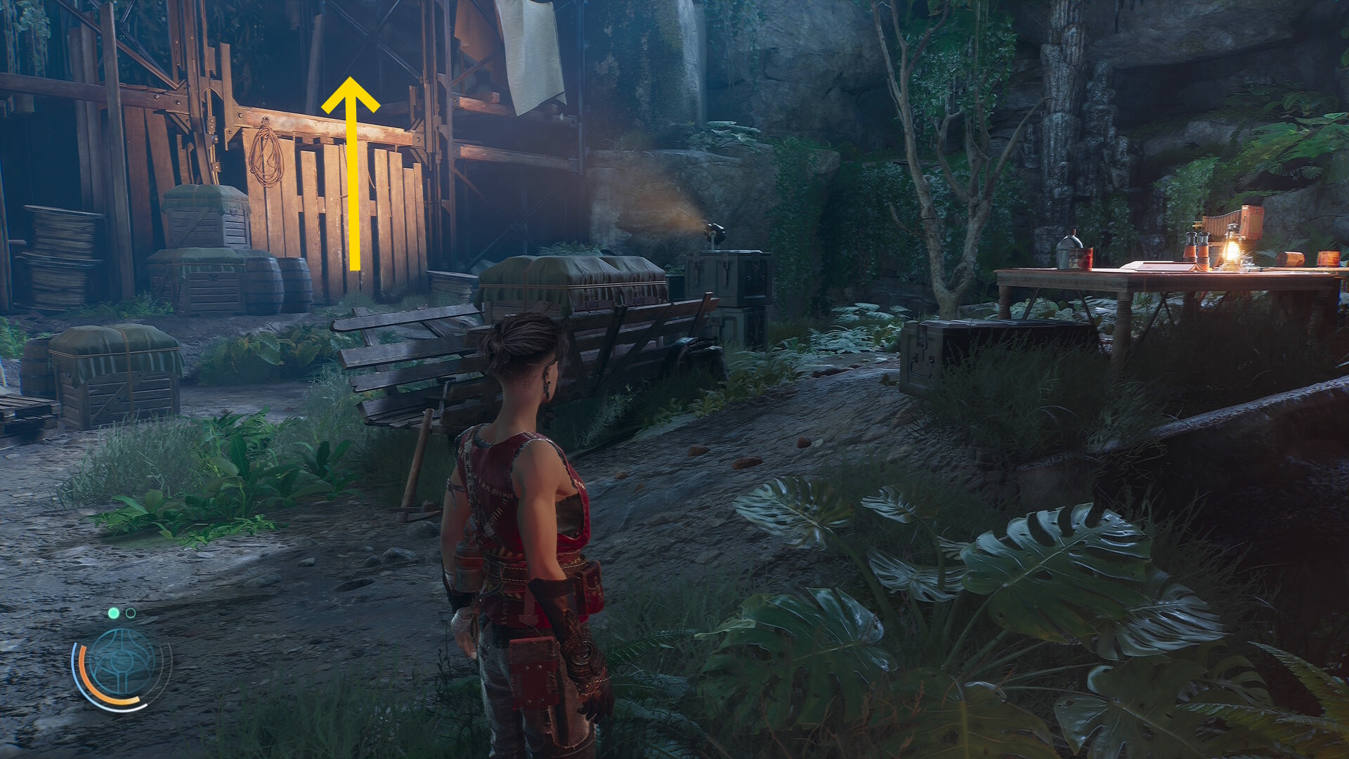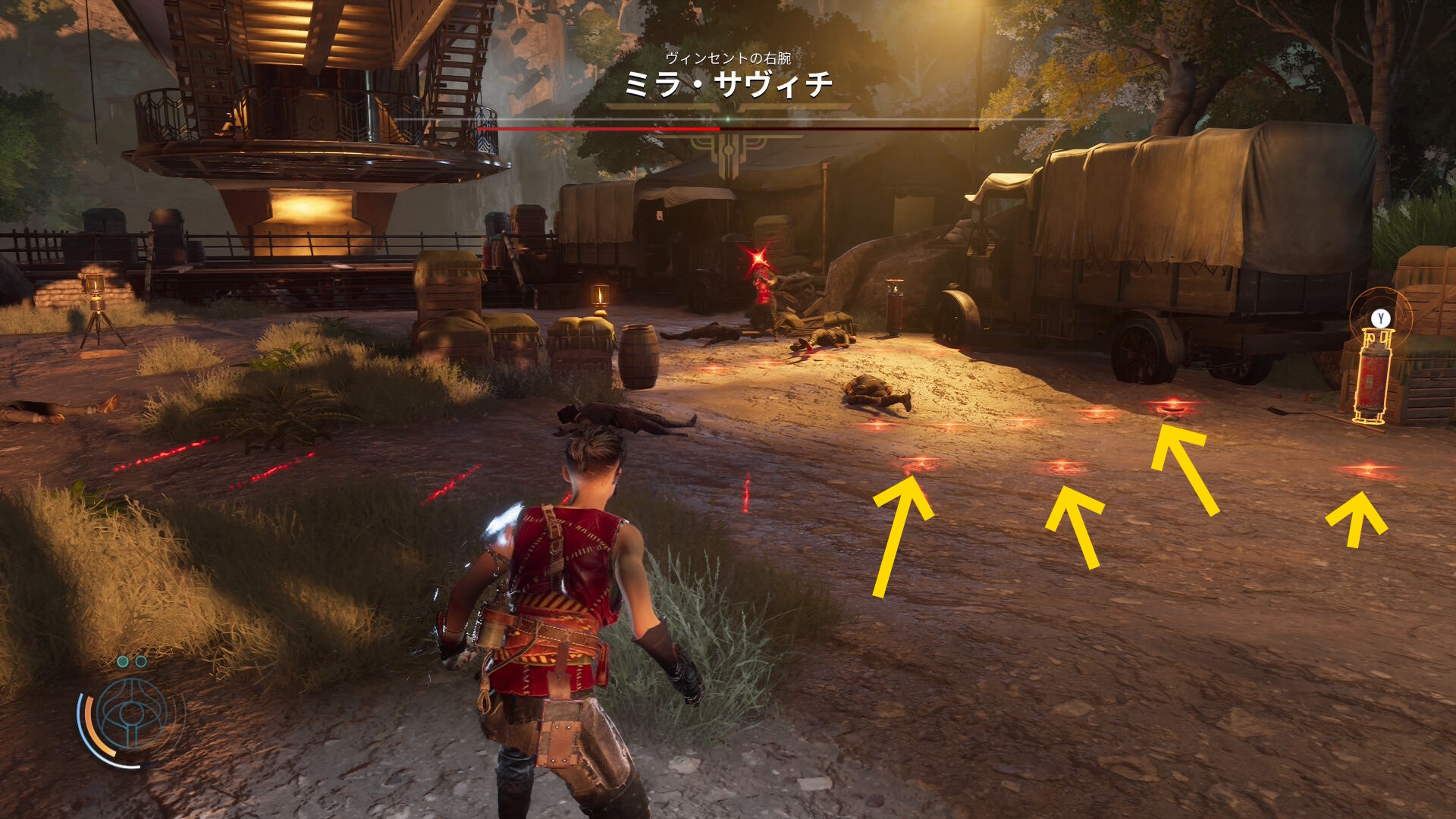 • 崖下にキャンプがあるのが見えるが、真下に飛び降りることはできないので、後ろの道を進んでキャンプの左側から侵入する