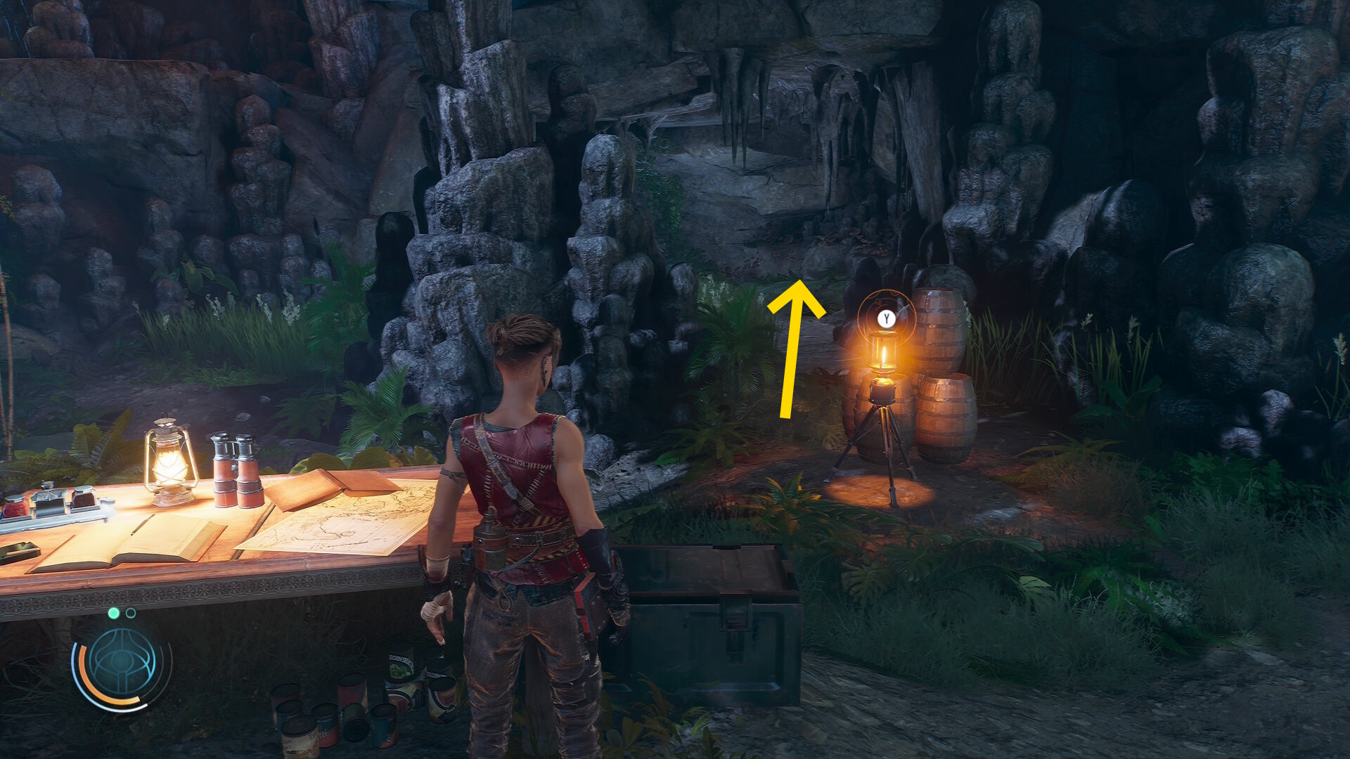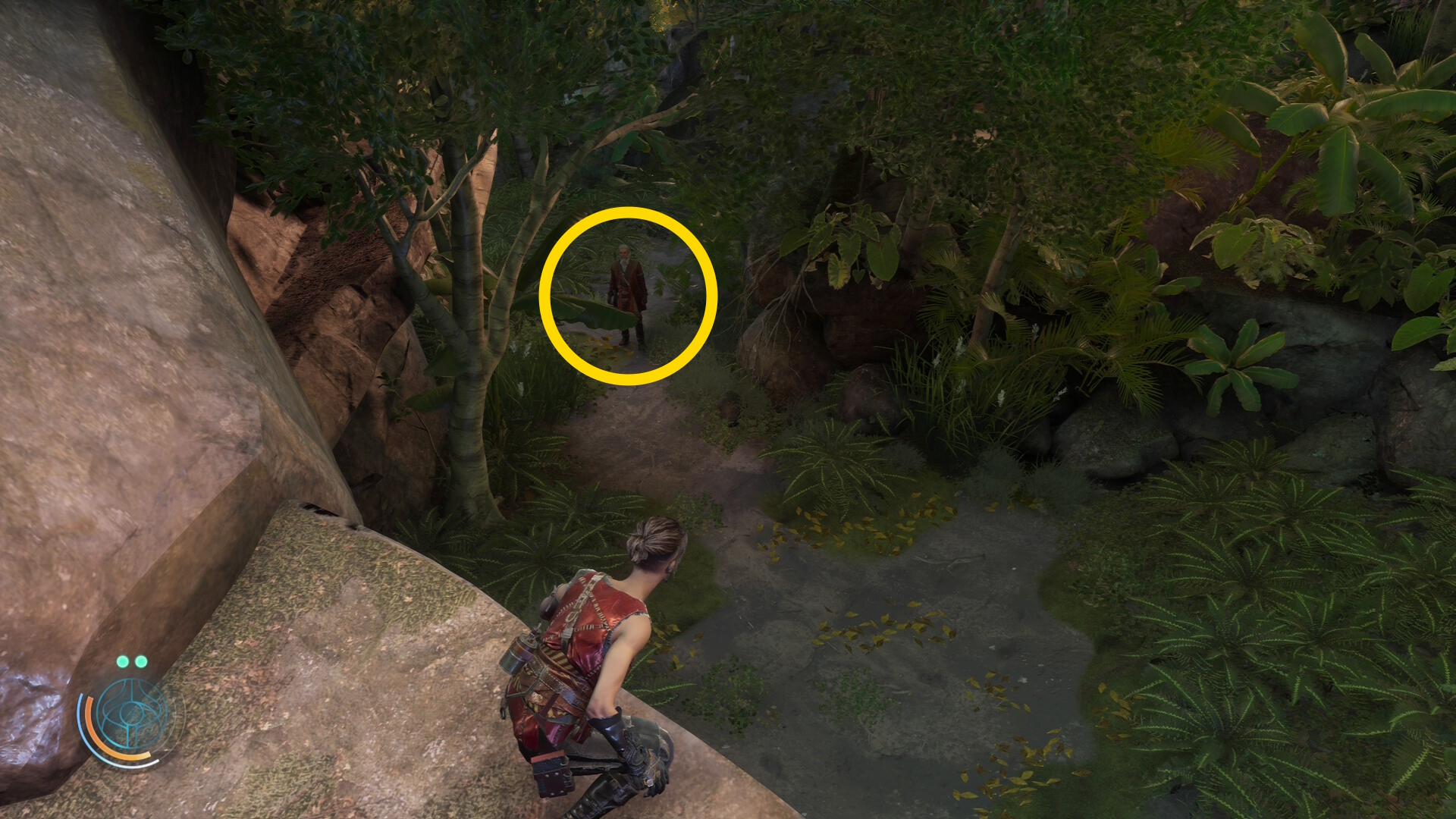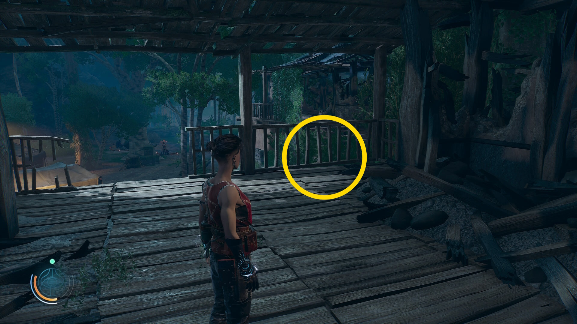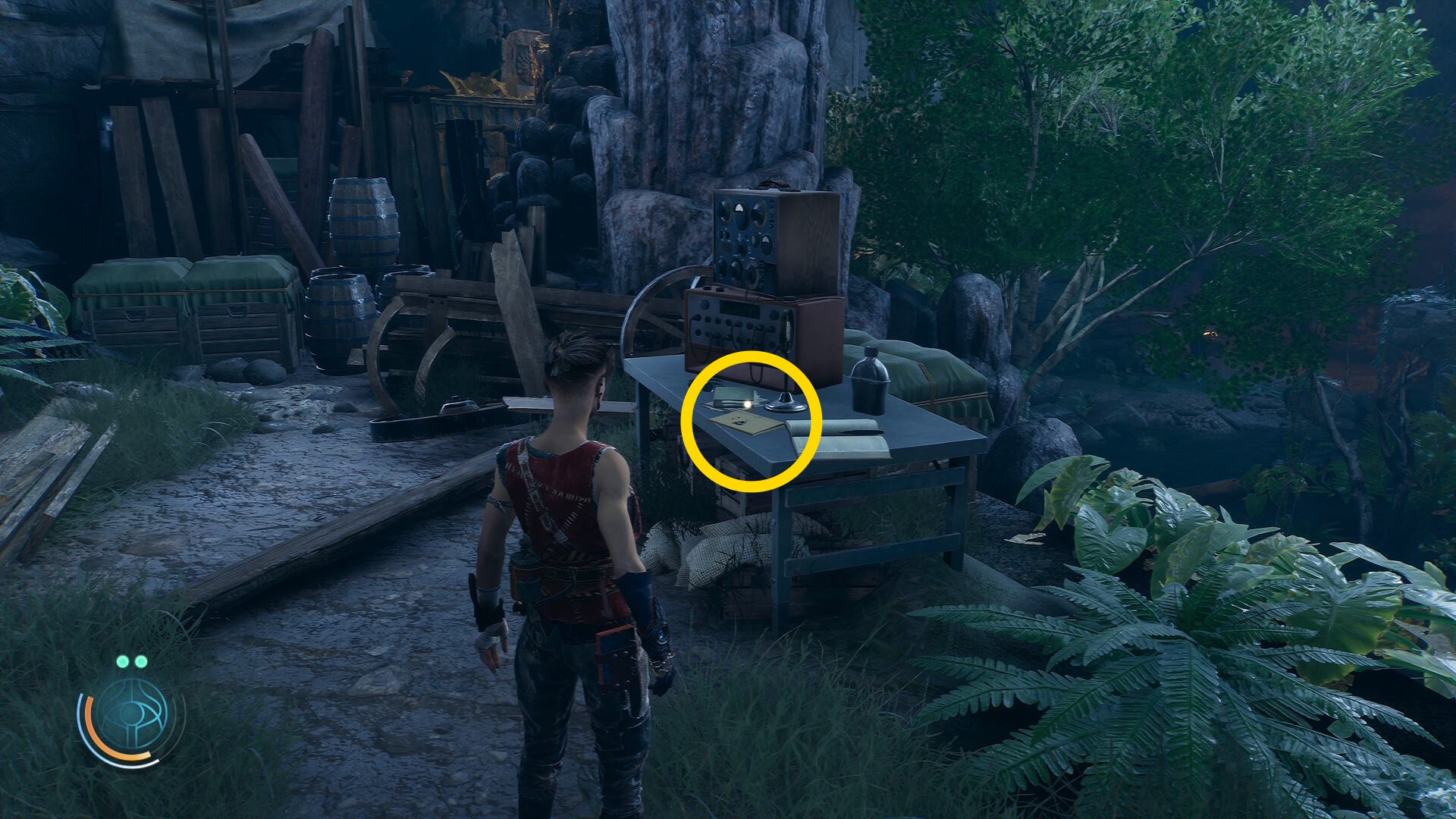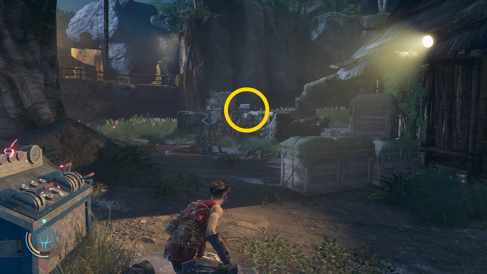 • 崖下にキャンプがあるのが見えるが、真下に飛び降りることはできないので、後ろの道を進んでキャンプの左側から侵入する