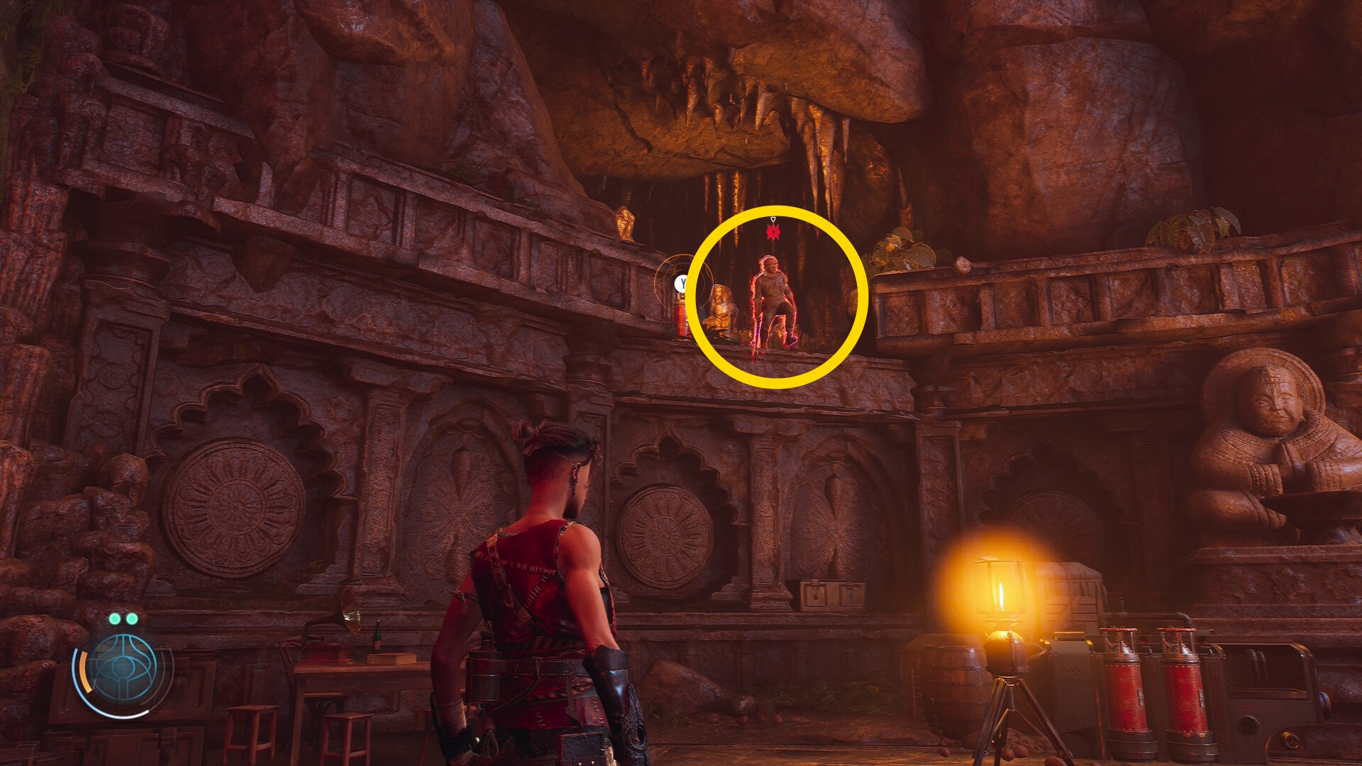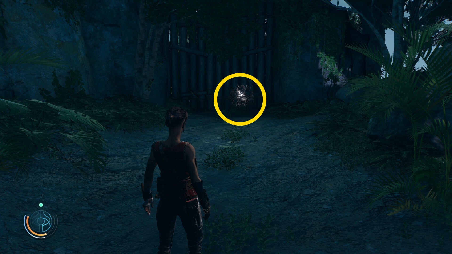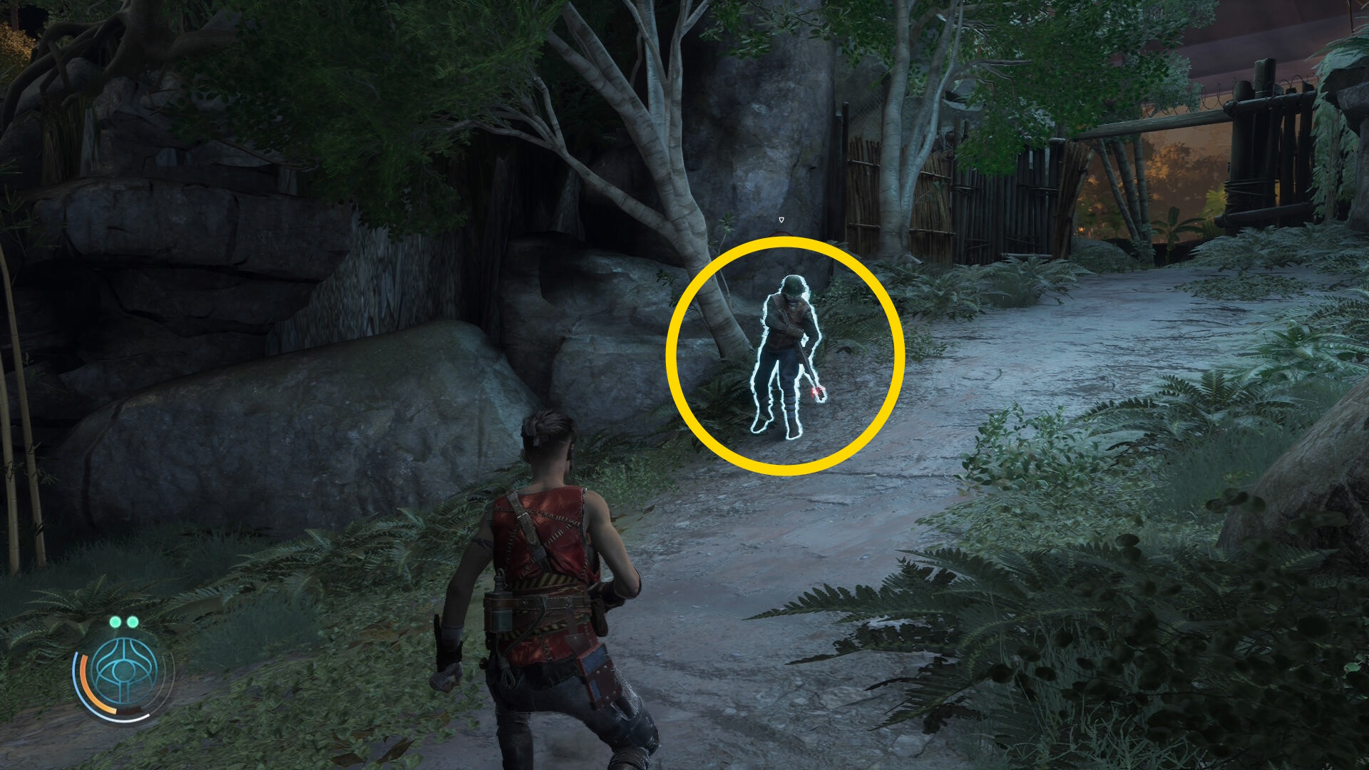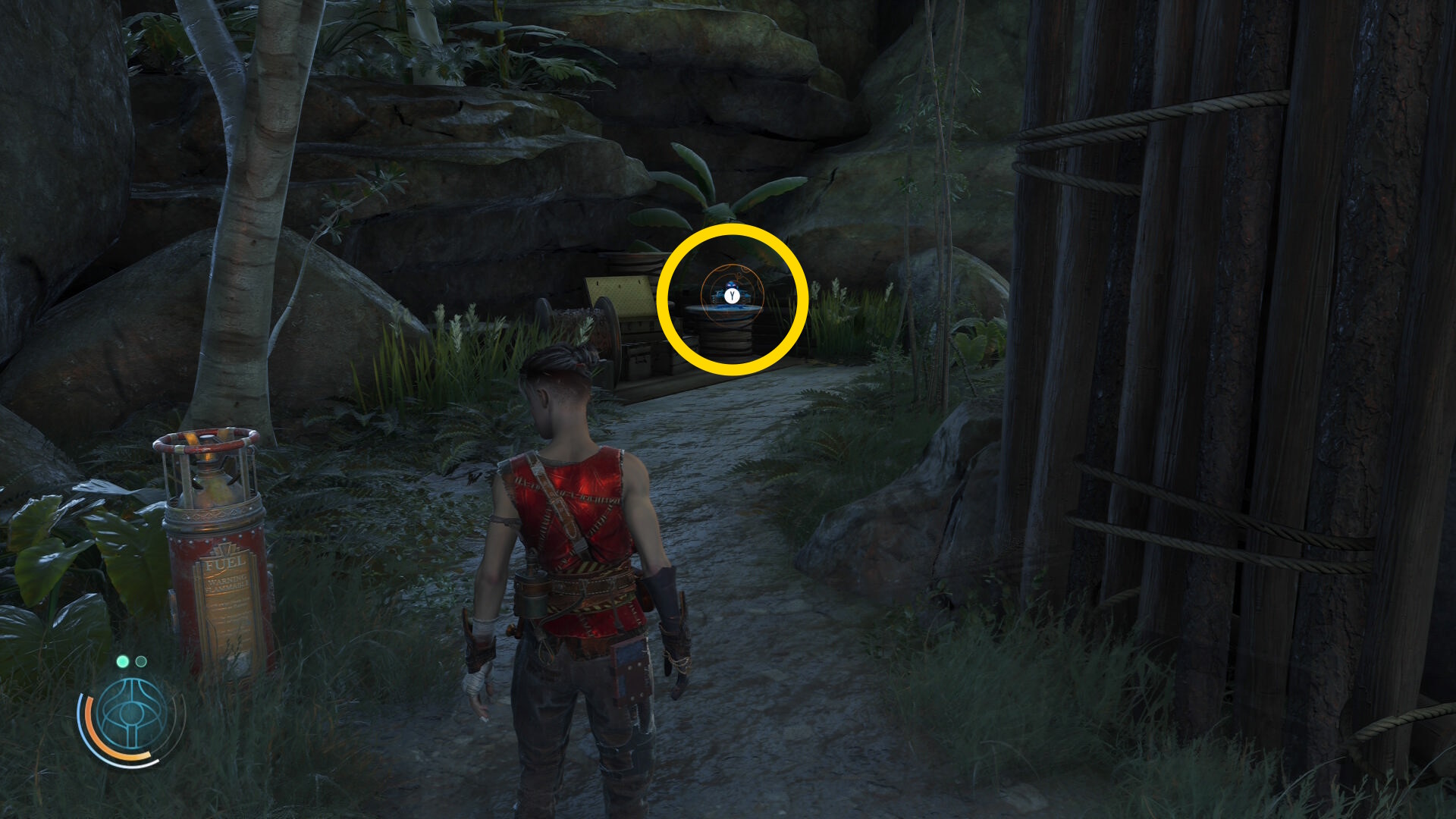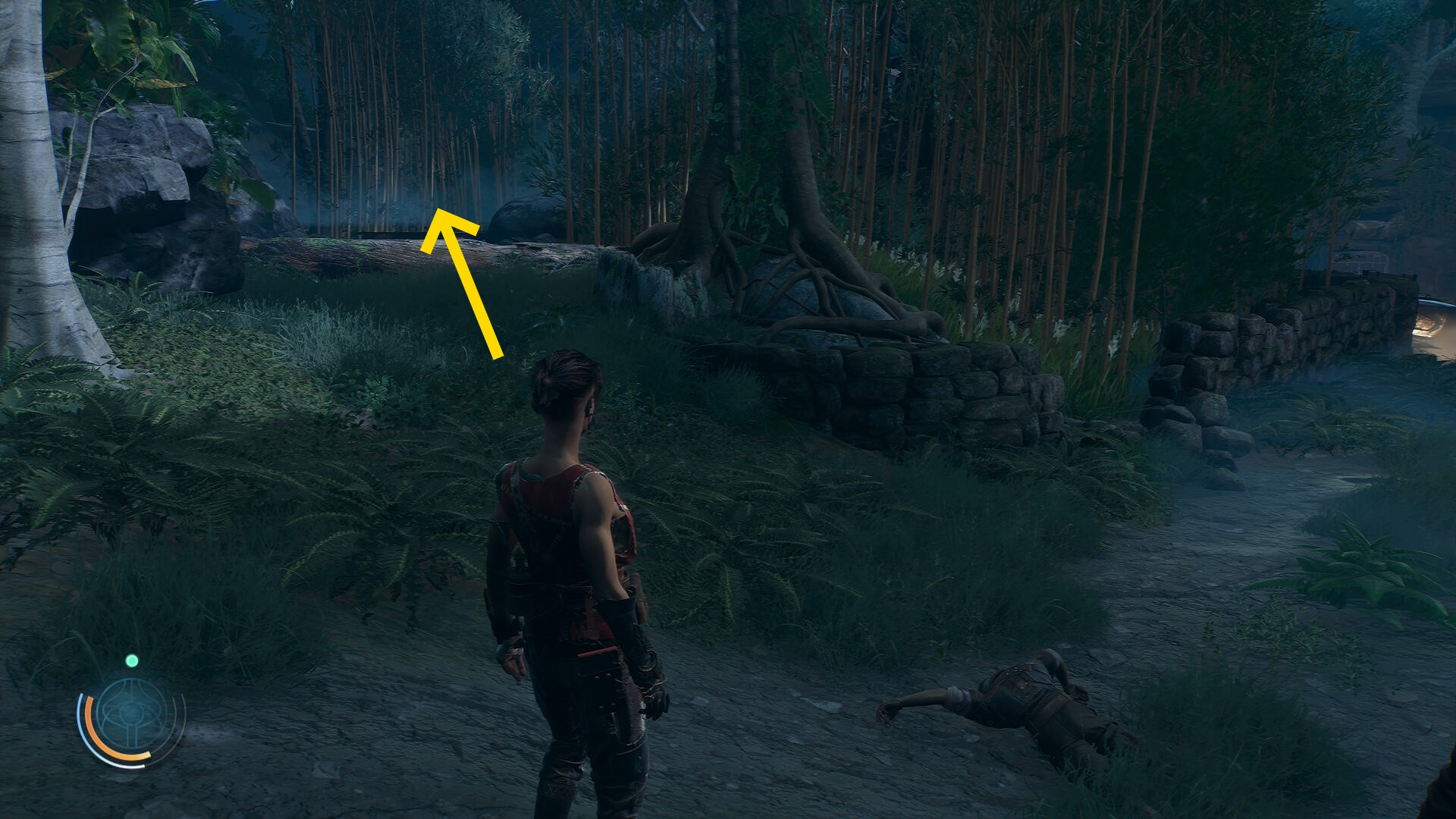 • 崖下にキャンプがあるのが見えるが、真下に飛び降りることはできないので、後ろの道を進んでキャンプの左側から侵入する