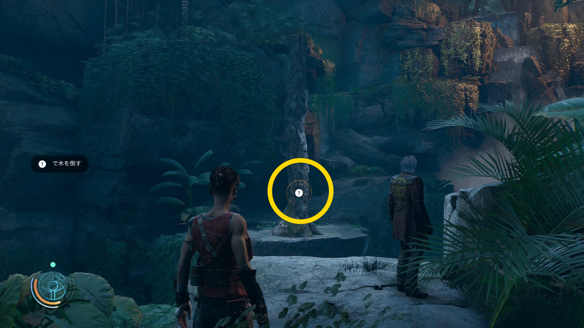 • 間隙の向こう側にある木を Y ボタンで倒して橋にする
