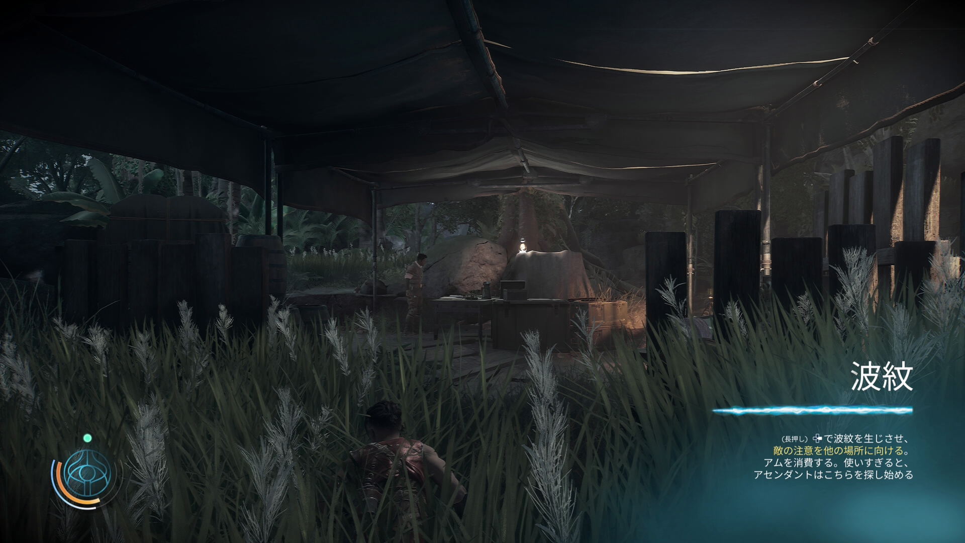 • 左の草むらに波紋を投げ、誘導された敵をテイクダウン