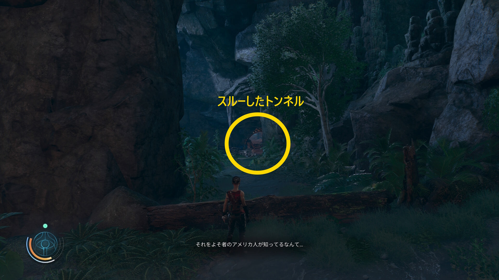 • 左に見える遺跡のような開口部が正規ルートであるが、右の倒木を越えた先は ”開けてはいけない扉” につながっている(特になにもない)