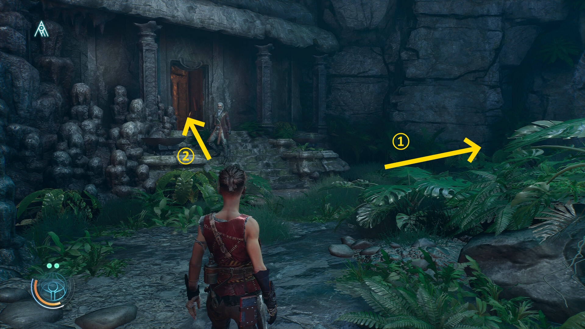 • ルーサーはスタスタと下画像②のほうへ進むが、まずは左前方の石段を上がっていく(下画像①)