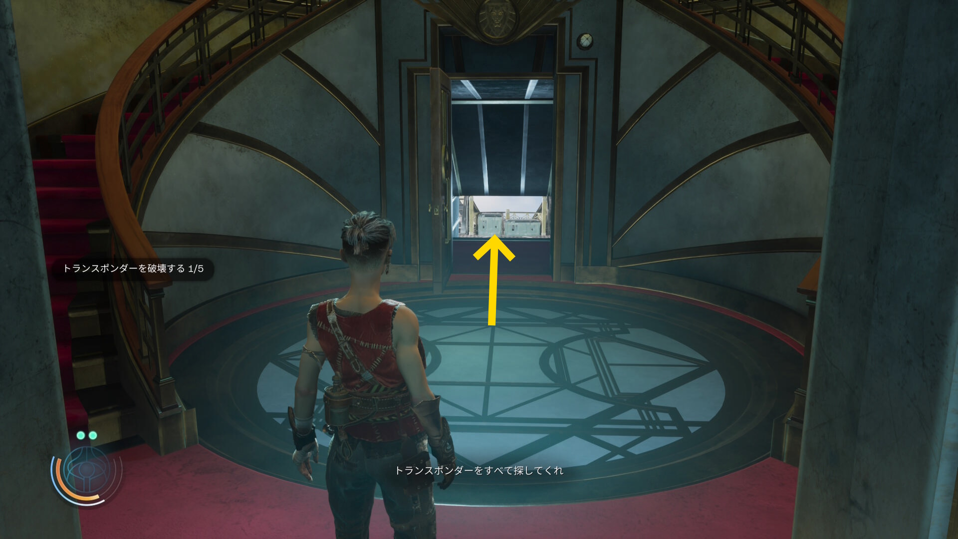 - 入ってきた開口部からラウンジを出て、階段を登る(どちらを登ってもオーケー)