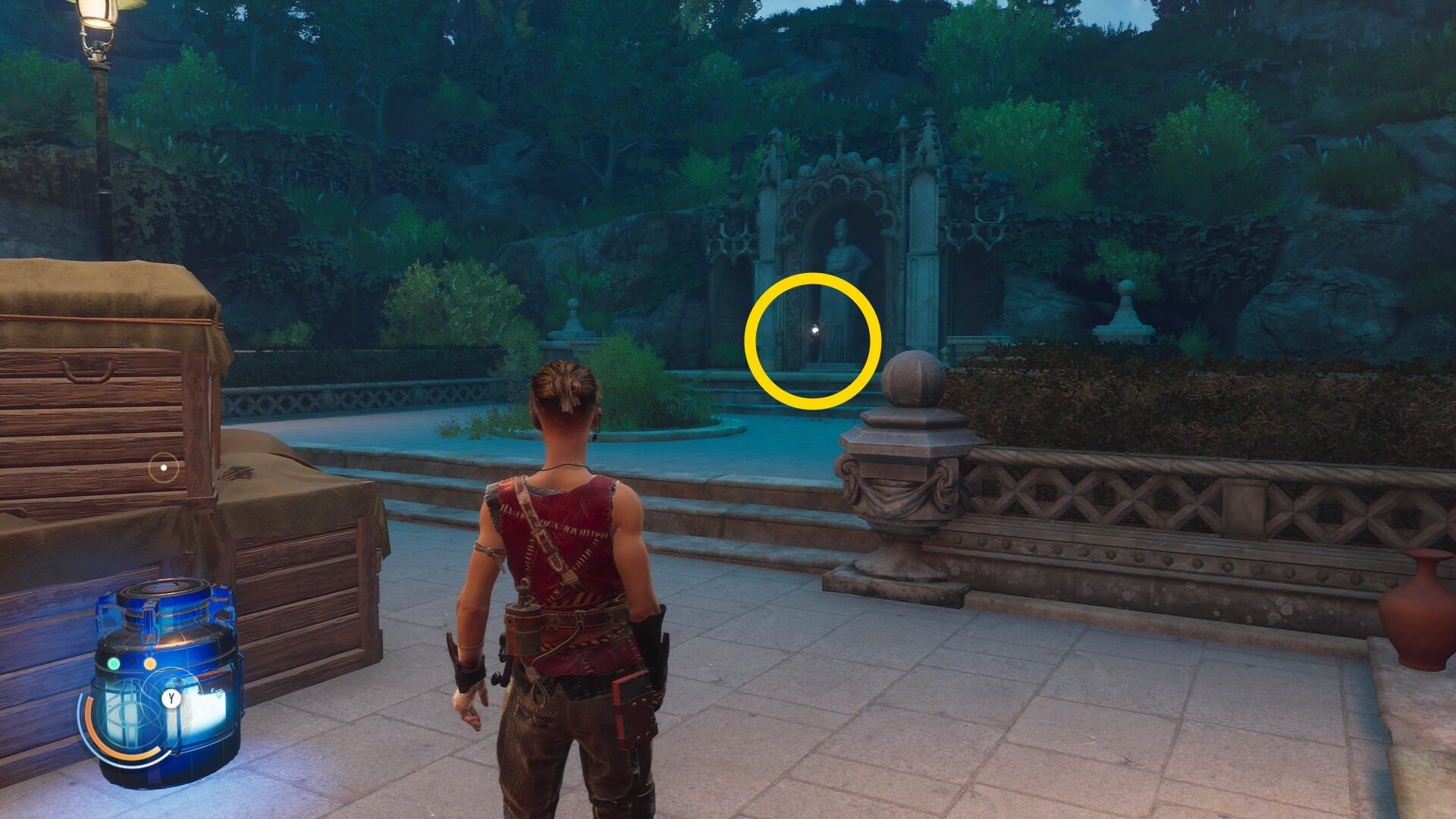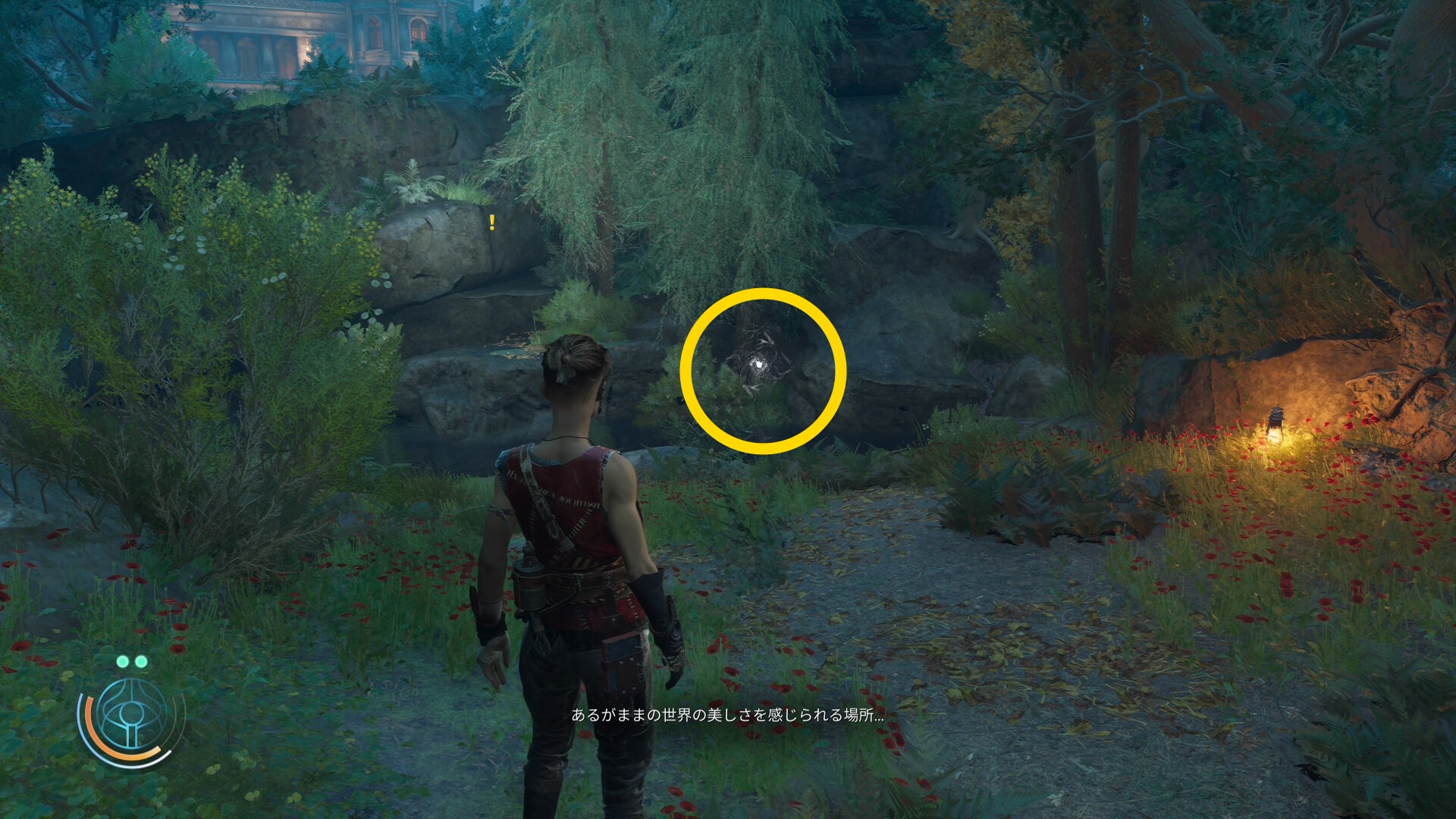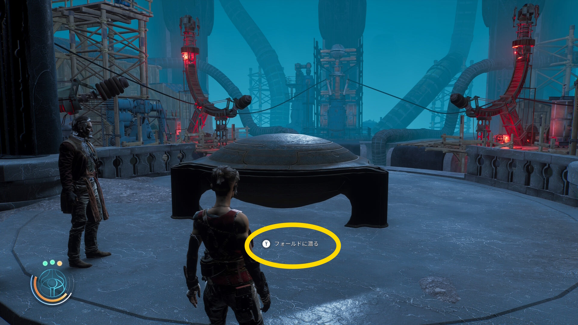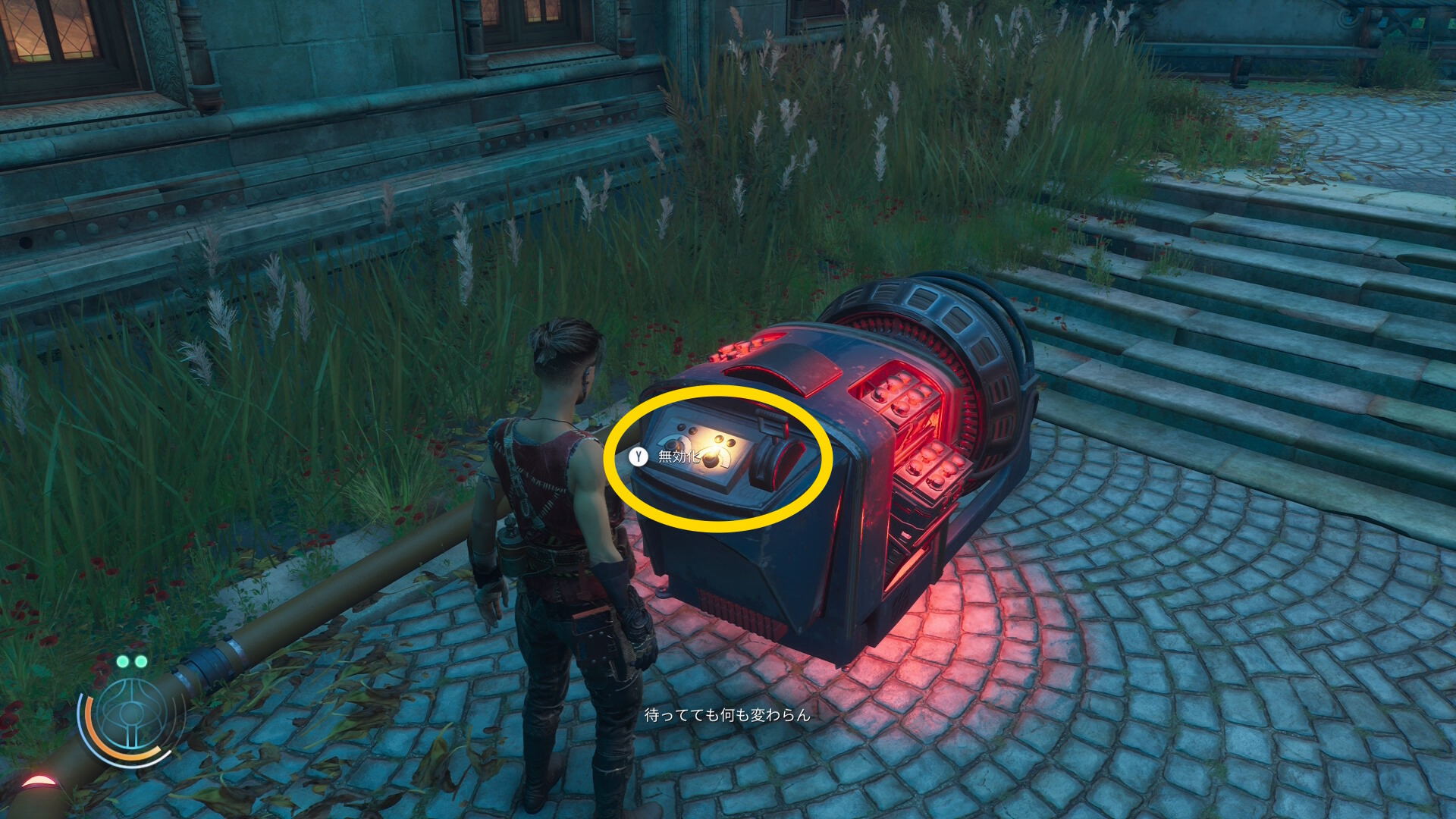 - カットシーン後、ソラリウムを出たら左に進み、ハーネスブルーザーを倒した小さな庭へ