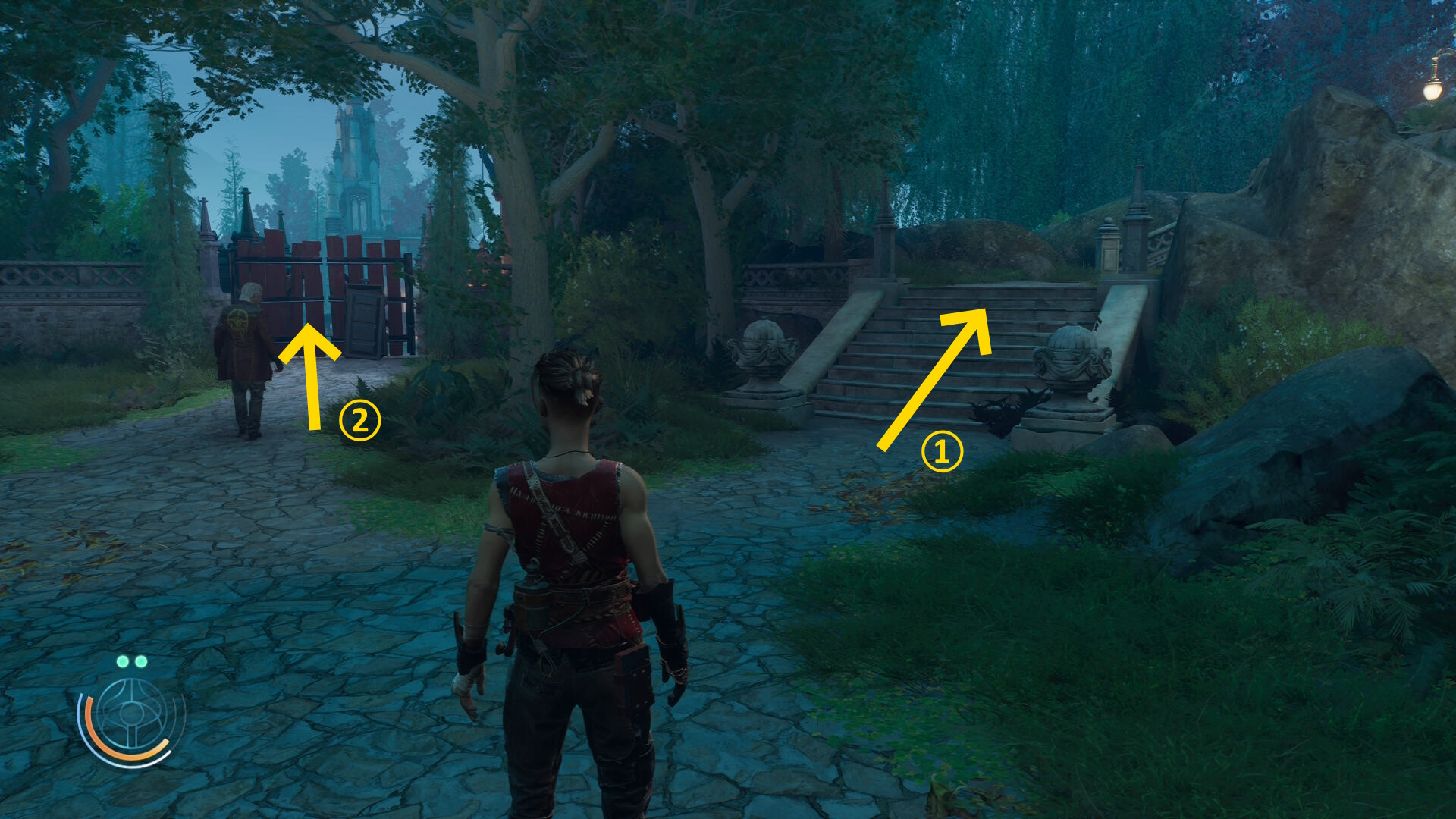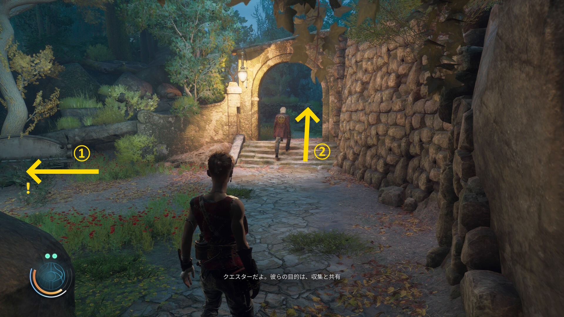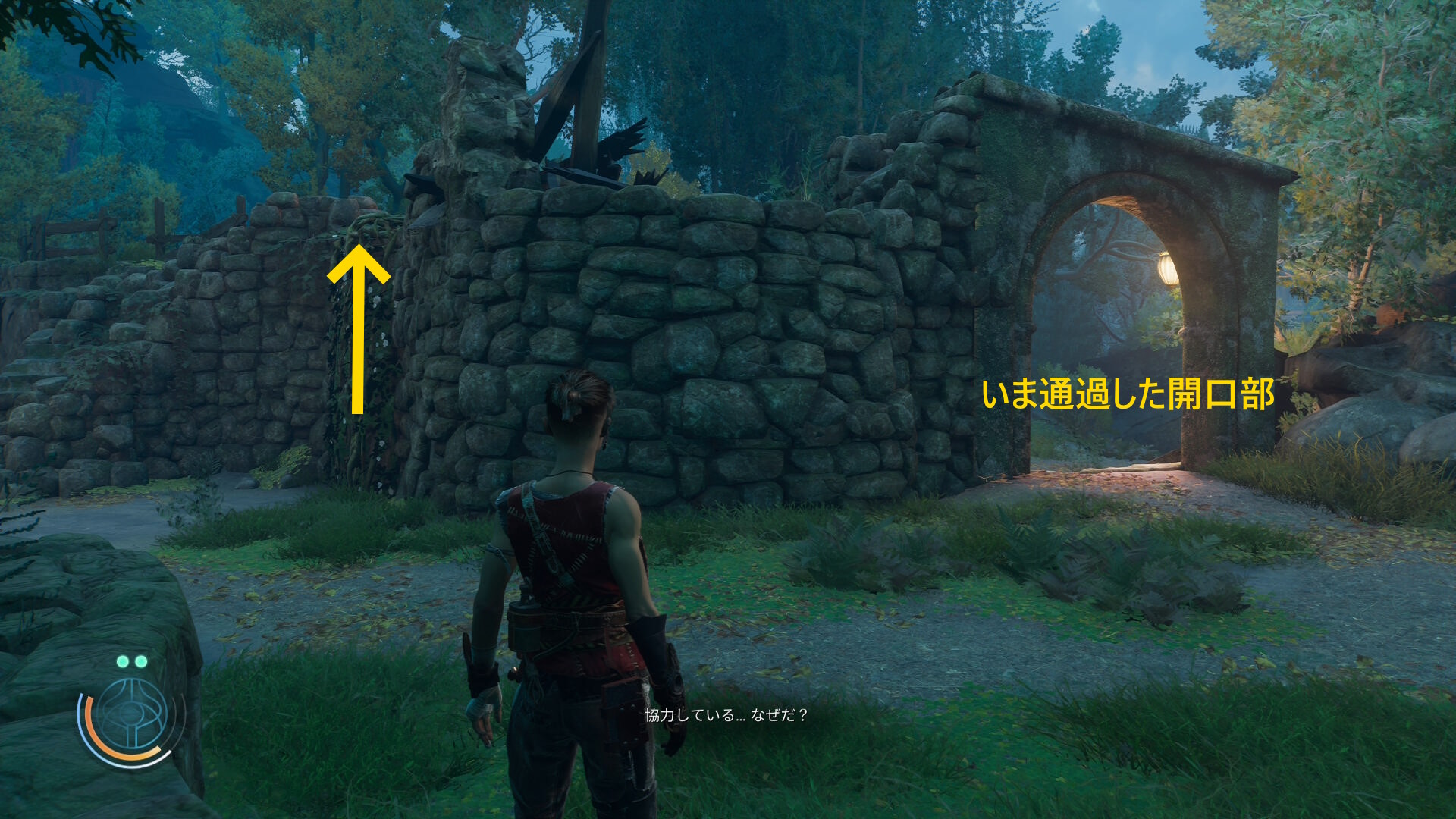 - サヒンのタイルを回収後、左に見える壁を協力壁越えするのが正規ルートだが(下画像①)、右奥に進む(下画像②)