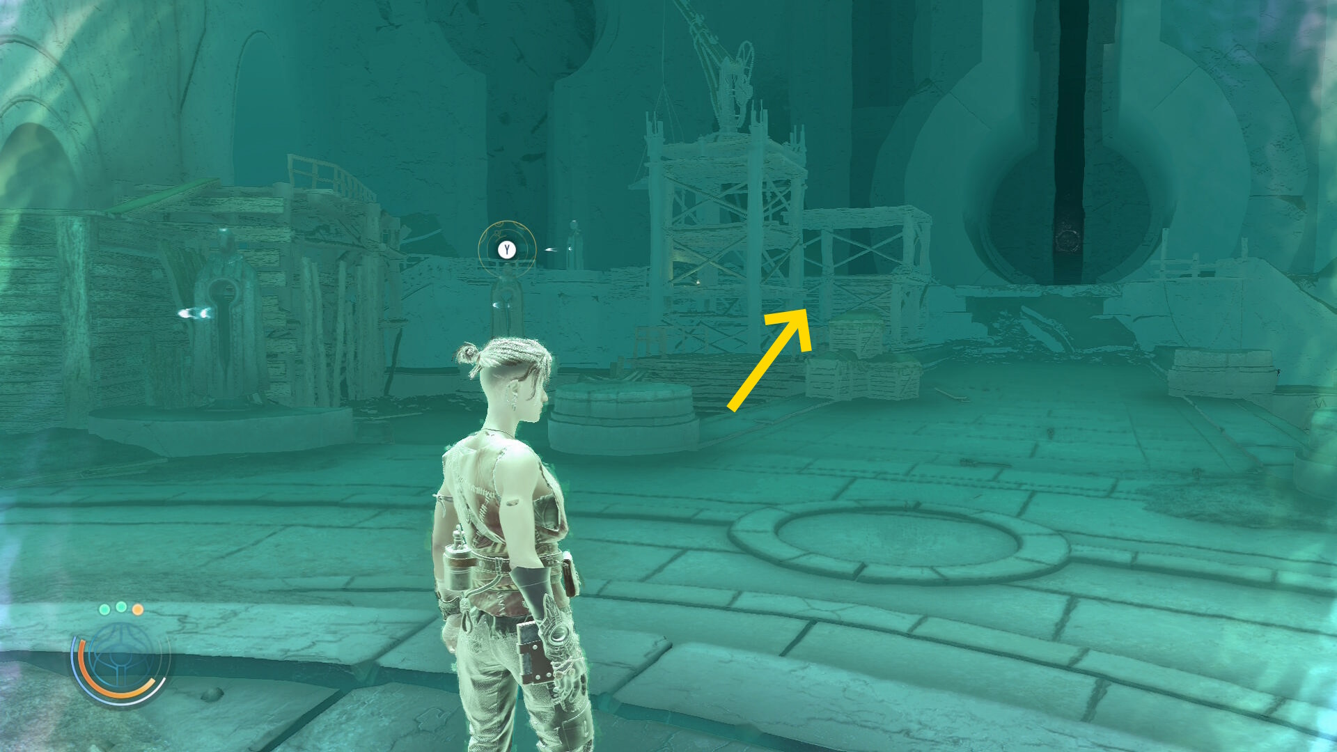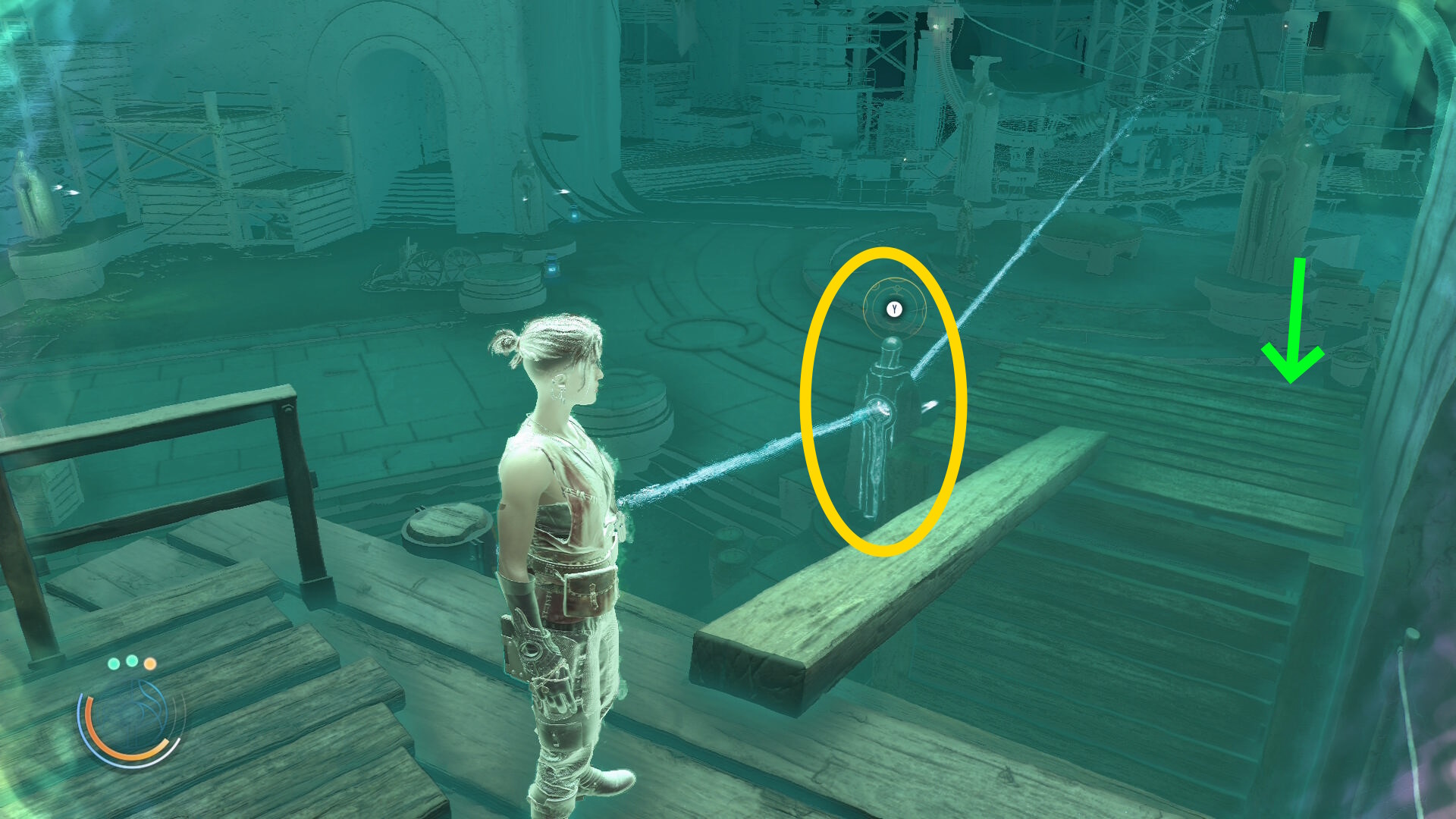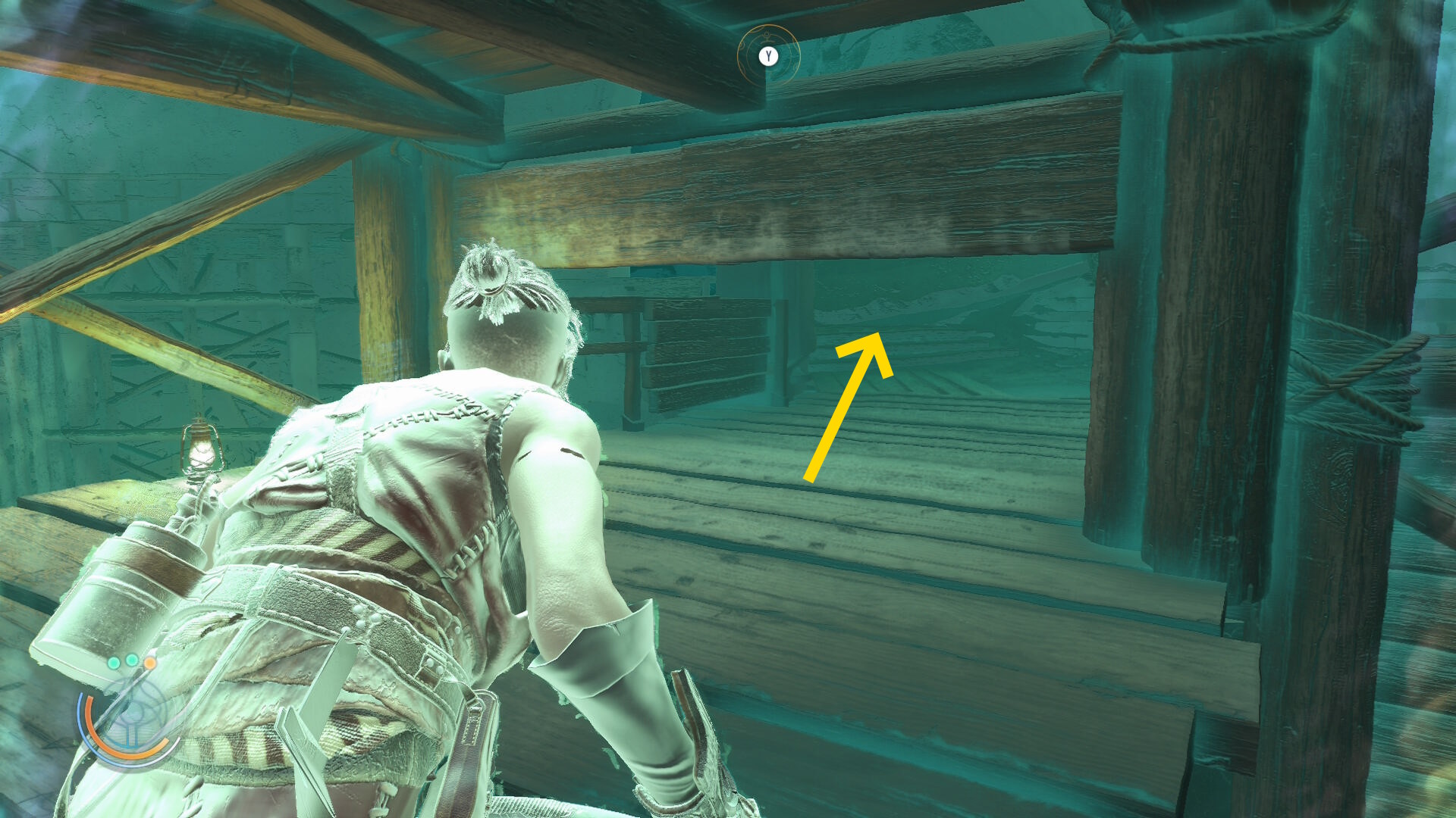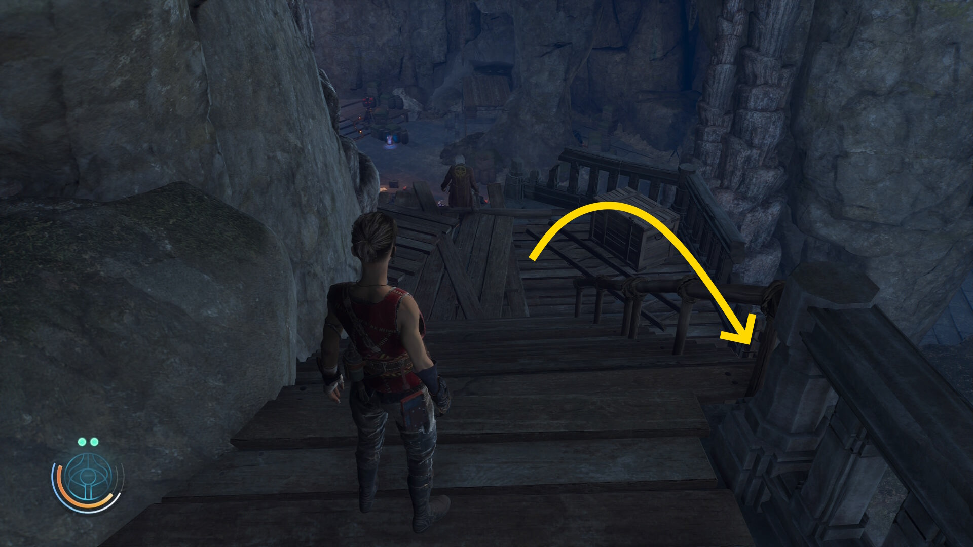 - 木の板の橋を渡り、土台から飛び降りる(下画像:緑矢印)