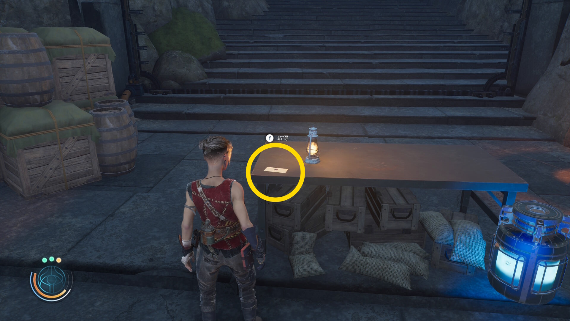 - 殲滅後、先ほど下をくぐった橋の近くに机が2脚置かれている